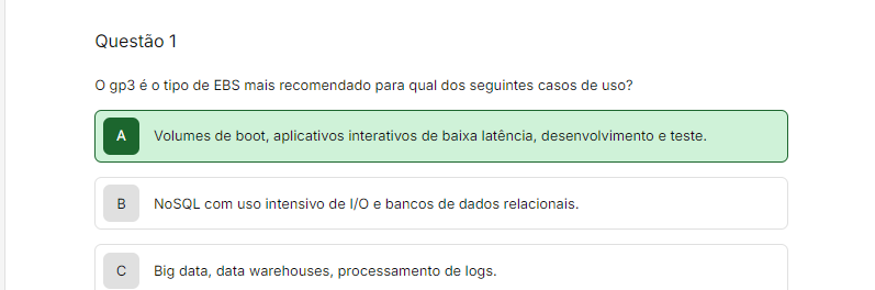 Questão 1 O gp3 é tipo de EBS mais recomendado para qual dos seguintes casos de uso? A Volumes de boot, aplicativos interativos de baixa latência, desenvolvimento e teste. B NoSQL com uso intensivo de I/O e bancos de dados relacionais. C Big data, data warehouses, processamento de logs.