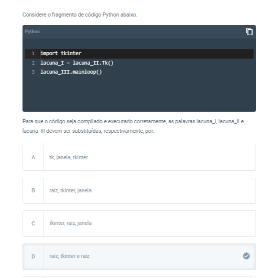 Considere fragmento de código Python abaixo. Python 1 import tkinter 2 = lacuna_II.Tk() 3 Para que código seja compilado e executado corretamente, as palavras lacuna_l, e lacuna_III devem ser respectivamente, A tk, janela, tkinter B raiz, tkinter, janela C tkinter, raiz, janela D raiz, tkinter e raiz