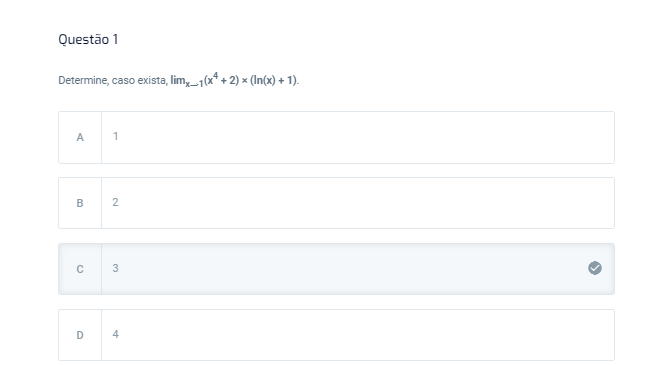 Questão 1 Determine, caso exista, 4 + 2) x (In(x) + 1). A 1 B 2 C 3 D 4