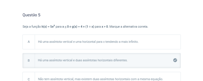 Questão 5 Seja a Marque a alternativa A Há uma assintota vertical e uma horizontal para tendendo a mais B Há uma assintota vertical e duas assintotas horizontais C Não tem assintota mas existem duas assintotas horizontais com a mesma equação.