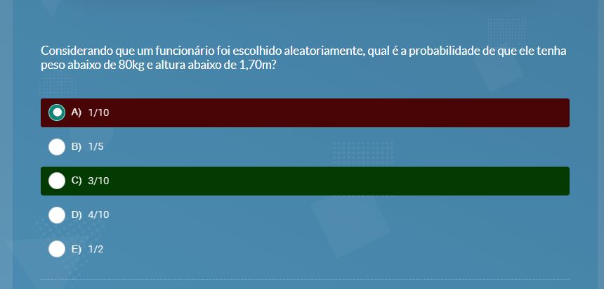 Considerando que um funcionário foi escolhido aleatoriamente, qual é a probabilidade de que ele tenha peso abaixo de 80kg e altura abaixo de 1,70m? A) 1/10 B) 1/5 C) 3/10 D) 4/10 E) 1/2