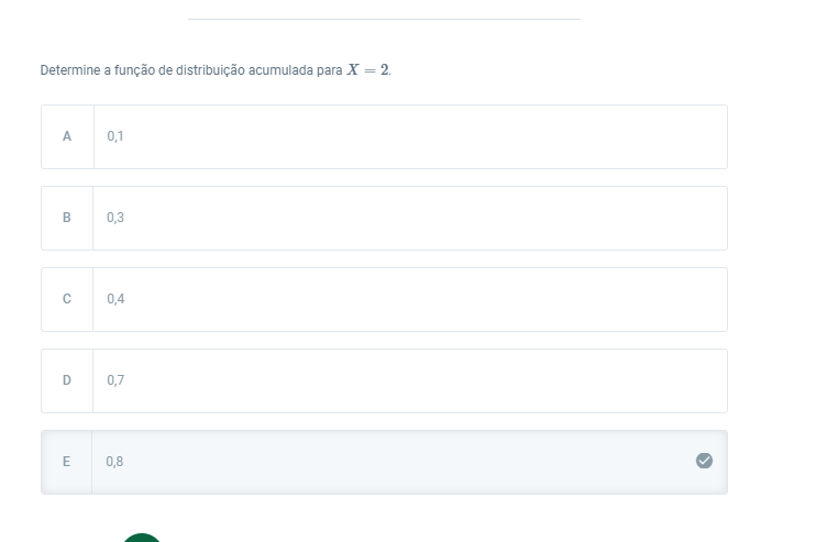 Determine a função de distribuição acumulada para X = 2. A 0,1 B 0,3 C 0,4 D 0,7 E 0,8