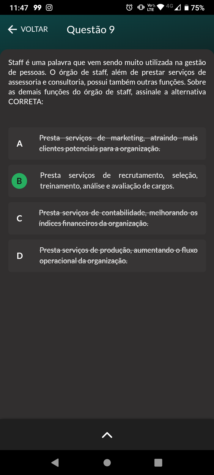 4G 11:47 99 O LTE 75% VOLTAR Questão 9 Staff é uma palavra que vem sendo muito utilizada na gestão de pessoas. O órgão de staff, além de prestar serviços de assessoria e consultoria, possui também outras funções. Sobre as demais funções do órgão de staff, assinale a alternativa CORRETA: Presta serviços de marketing, atraindo-mais A potenciais para a Presta serviços de recrutamento, seleção, treinamento, análise e avaliação de cargos. Presta serviços de contabilidade, índices financeiros da Presta serviços de produção, aumentando fluxo D operacional da