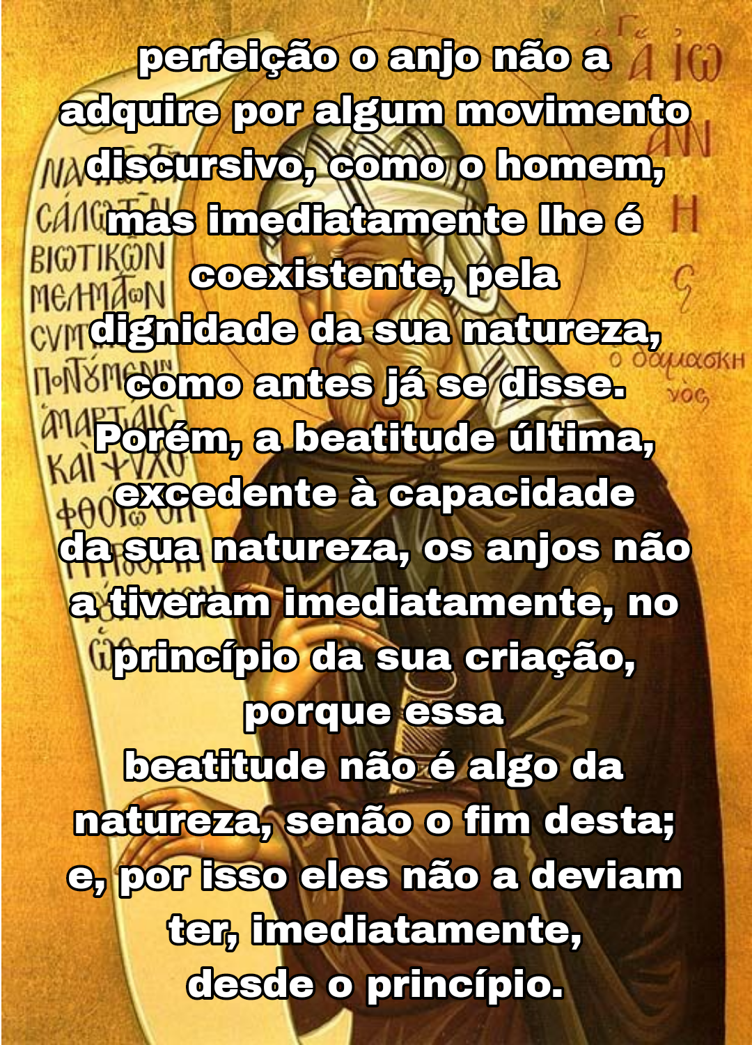 perfeição anjo não a A adquire por algum movimento homem, imediatamente é coexistente, pela cvmdignidade natureza, antes se disse. Porém, a beatitude KAI on excedente à capacidade natureza, os anjos não ativeram imediatamente, no da sua criação, porque essa beatitude da natureza, senão fim desta; e, por isso eles não a deviam ter, imediatamente, desde princípio.