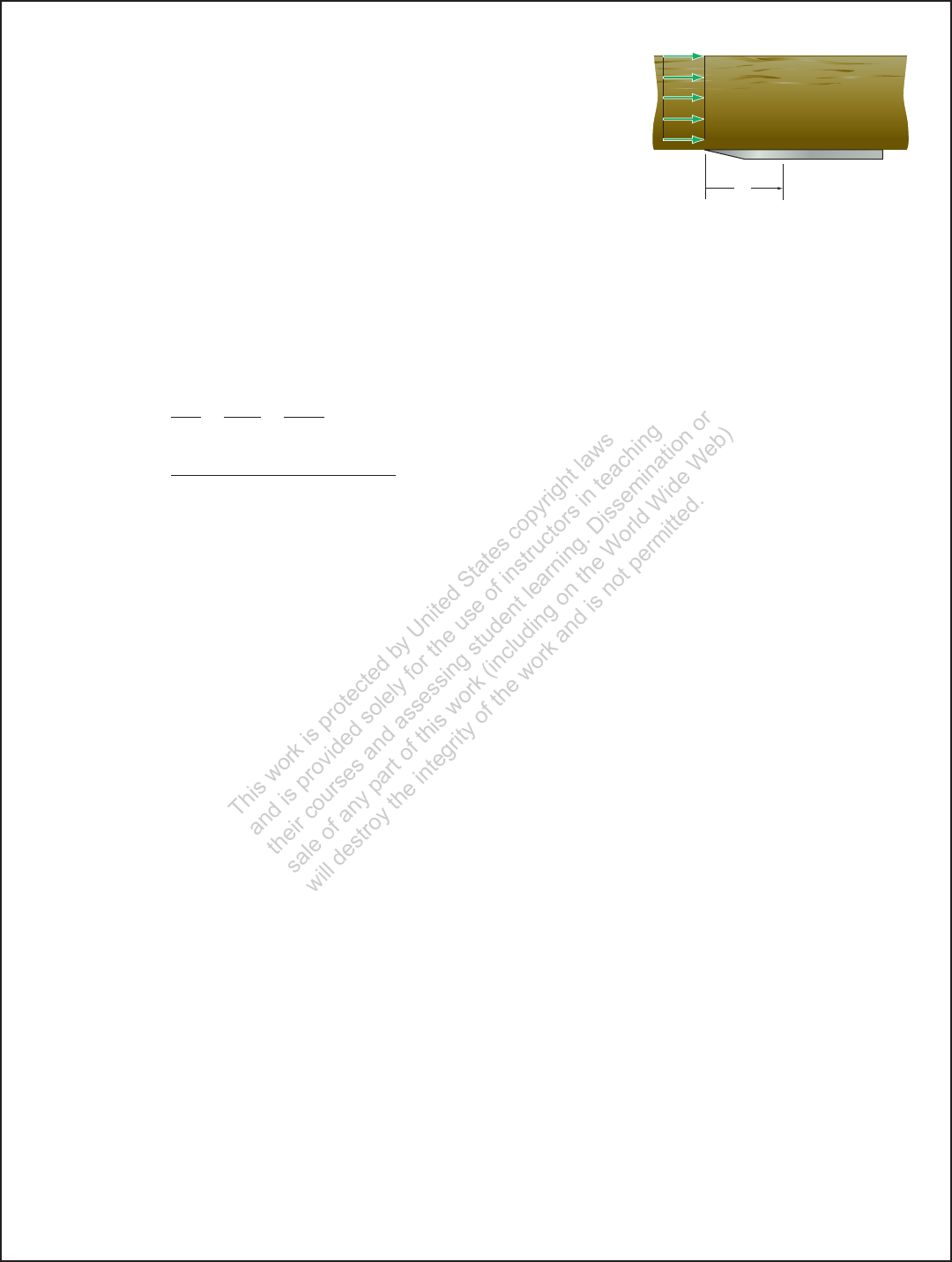 1134 © 2014 Pearson Education, Inc., Upper Saddle River, NJ. All rights reserved. This material is protected under all copyright laws as they currently exist. No portion of this material may be reproduced, in any form or by any means, without permission in writing from the publisher. Solution Oil is considered to be incompressible. The flow is steady. The transition from a laminar boundary layer occurs at a critical Reynolds number of (Rex)cr = 5(105). (Rex)cr = Uxcr n = Uxcr mg>g = gUxcr mg 5(105) = (55.1 lb>ft3)(3 ft>s)xcr 31.40(10-3) lb # s>ft4 (32.2 ft>s2) xcr = 136.36 ft = 136 ft Ans. 11–1. Oil flows with a free-stream velocity of U = 3 ft>s over the flat plate. Determine the distance xcr to where the boundary layer begins to transition from laminar to turbulent flow. Take mo = 1.40110-32 lb # s>ft and go = 55.1 lb>ft3. x U Ans: 136 ft This w ork is pr ote cte d b y U nit ed S tat es co py rig ht law s an d i s p rov ide d s ole ly for th e u se of in str uc tor s i n t ea ch ing the ir c ou rse s a nd as se ss ing st ud en t le arn ing . D iss em ina tio n o r sa le of an y p art of th is work (in clu din g o n t he W orl d W ide W eb ) will de str oy th e i nte gri ty of the w ork an d i s n ot pe rm itte d. 1135 © 2014 Pearson Education, Inc., Upper Saddle River, NJ. All rights reserved. This material is protected under all copyright laws as they currently exist. No portion of this material may be reproduced, in any form or by any means, without permission in writing from the publisher. 11–2. Water at 15°C flows with a free-stream velocity of U = 2 m>s over the flat plate. Determine the shear stress on the surface of the plate at point A. Solution Water is considered to be incompressible. The flow is steady. From Appendix A, m = 1.15(10-3) N # s>m2 and n = 1.15(10-6) m2>s. Thus, Rex = Ux n = (2 m>s)(0.2 m) 1.15(10-6) m2>s = 3.478(105) Since Rex 6 (Rex)cr = 5(105), the boundary layer is still laminar. Thus, t0 = 0.332m aU x b2Rex = 0.33231.15(10-3) N>m24a2 m>s 0.2 m b23.478(105) = 2.25 N>m2 Ans. A 200 mm U Ans: 2.25 Pa This w ork is pr ote cte d b y U nit ed S tat es co py rig ht law s an d i s p rov ide d s ole ly for th e u se of in str uc tor s i n t ea ch ing the ir c ou rse s a nd as se ss ing st ud en t le arn ing . D iss em ina tio n o r sa le of an y p art of th is work (in clu din g o n t he W orl d W ide W eb ) will de str oy th e i nte gri ty of the w ork an d i s n ot pe rm itte d. 1136 © 2014 Pearson Education, Inc., Upper Saddle River, NJ. All rights reserved. This material is protected under all copyright laws as they currently exist. No portion of this material may be reproduced, in any form or by any means, without permission in writing from the publisher. Solution Air is considered to be incompressible. The flow is steady. Here, u U = y y + 0.01 u = U a y y + 0.01 b = a 15y y + 0.01 b m>s At y = 0.1 m, u � y = 0.1 m = 15(0.1) 0.1 + 0.01 = 13.6 m>s Ans. At y = 0.3 m, u � y = 0.3 m = 15(0.3) 0.3 + 0.01 = 14.5 m>s Ans. 11–3. The boundary layer for wind blowing over rough terrain can be approximated by the equation u>U = 1 y>( y + 0.01)2 , where y is in meters. If the free- stream velocity of the wind is 15 m>s, determine the velocity at an elevation y = 0.1 m and at y = 0.3 m from the ground surface. y 15 m/s Ans: u � y = 0.1 m = 13.6 m>s u � y = 0.3 m = 14.5 m>s This w ork is pr ote cte d b y U nit ed S tat es co py rig ht law s an d i s p rov ide d s ole ly for th e u se of in str uc tor s i n t ea ch ing the ir c ou rse s a nd as se ss ing st ud en t le arn ing . D iss em ina tio n o r sa le of an y p art of th is work (in clu din g o n t he W orl d W ide W eb ) will de str oy th e i nte gri ty of the w ork an d i s n ot pe rm itte d. 1137 © 2014 Pearson Education, Inc., Upper Saddle River, NJ. All rights reserved. This material is protected under all copyright laws as they currently exist. No portion of this material may be reproduced, in any form or by any means, without permission in writing from the publisher. Solution The mixture is considered to be incompressible. The flow is steady. The transition from a laminar boundary layer occurs at a critical Reynolds number of (Rex)cr = 5(105). (Rex)cr = Uxcr n 5(105) = (0.8 m>s)xcr 42(10-6) m2>s xcr = 26.25 m Since xcr 7 L = 1.5 m, the boundary layer for the entire length of the plate is laminar. The maximum thickness occurs at the end of the plate where x = L = 1.5 m. The Reynolds number at this point is Rex = Ux n = (0.8 m>s)(1.5 m) 42(10-6) m2>s = 2.857(104) Then, dmax = d �x = 1.5 m = 5.0x2Rex = 5.0(1.5 m)22.857(104) = 0.04437 m = 44.4 mm Ans. *11–4. An oil–gas mixture flows over the top surface of the plate that is contained in a separator used to process these two fluids. If the free-stream velocity is 0.8 m>s, determine the maximum boundary layer thickness over the plate’s surface. Take n = 42110-62 m2>s. 1.5 m 0.8 m/s 0.75 m This w ork is pr ote cte d b y U nit ed S tat es co py rig ht law s an d i s p rov ide d s ole ly for th e u se of in str uc tor s i n t ea ch ing the ir c ou rse s a nd as se ss ing st ud en t le arn ing . D iss em ina tio n o r sa le of an y p art of th is work (in clu din g o n t he W orl d W ide W eb ) will de str oy th e i nte gri ty of the w ork an d i s n ot pe rm itte d. 1138 © 2014 Pearson Education, Inc., Upper Saddle River, NJ. All rights reserved. This material is protected under all copyright laws as they currently exist. No portion of this material may be reproduced, in any form or by any means, without permission in writing from the publisher. Solution The mixture is considered to be incompressible. The flow is steady. The transition from a laminar boundary layer occurs at a critical Reynolds number of (Rex)cr = 5(105). (Rex)cr = Uxcr n 5(105) = (0.8 m>s)xcr 42(10-6) m2>s xcr = 26.25 m Since xcr 7 L = 1.5 m, the boundary layer for the entire length of the plate is laminar. Here, the Reynolds number at x = L = 1.5 m is ReL = UL n = (0.8 m>s)(1.5 