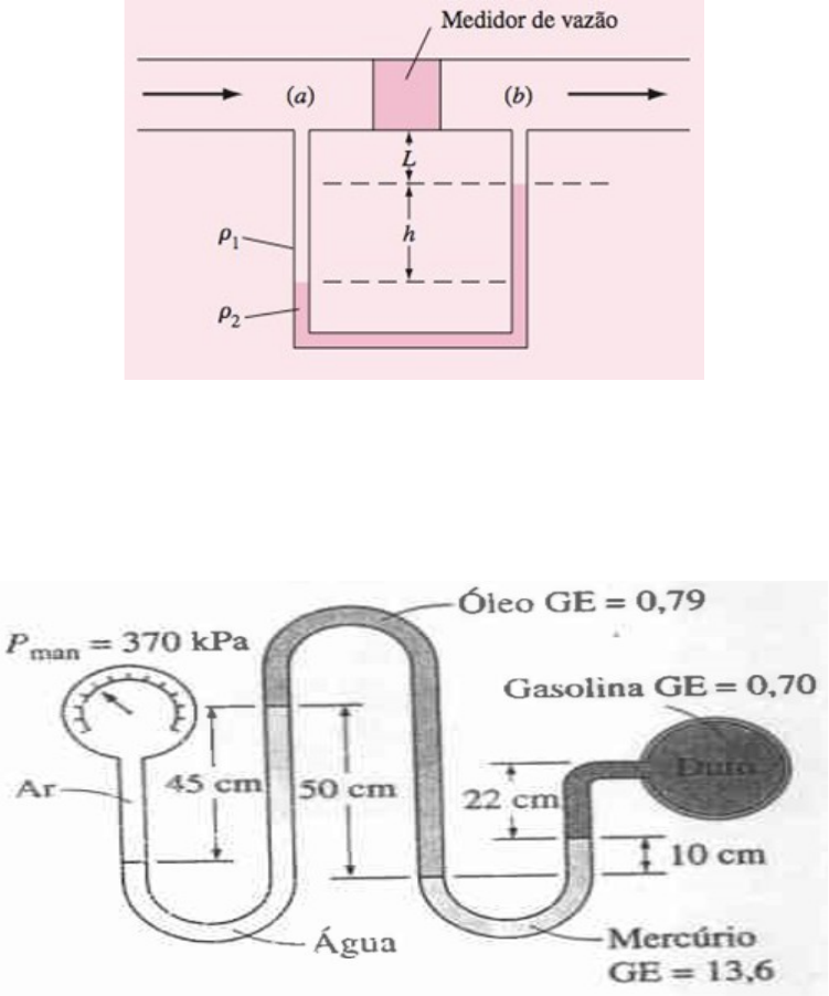 UNIVERSIDADE POTIGUAR ESCOLA DE ENGENHARIAS E CIÊNCIAS EXATAS CURSO DE ENGENHARIA CIVIL 2° Lista de Mecânica dos Fluidos 1°QUESSTÃO: O uso clássico de um manômetro ocorre quando os dois ramos do tubo em U são de mesmo comprimento, como na Figura abaixo, e a medida envolve uma diferença de pressão entre dois pontos na horizontal. A aplicação típica é a medida da diferença de pressão por meio de um medidor de vazão, como mostra a figura. Deduza uma fórmula para a diferença de pressão pa – pb em termos dos parâmetros do sistema da Figura abaixo. 2° QUESTÃO: Uma linha de gasolina está conectada a um medidor de pressão através de um manômetro em U, como mostrado na Figura abaixo. Se a leitura da pressão manométrica for 370 kPa, determine a pressão manométrica da linha de gasolina. 3°QUESTÃO: Repita a questão 2 para uma leitura de pressão manométrica de 240 kPa. 4°QUESTÃO: Infusões intravenosas em geral são movidas pela gravidade, pendurando-se a garrafa do fluido a uma altura suficiente para contrabalançar a pressão do sangue na veia e forçar o fluido a entrar no corpo. Quanto mais alto a garrafa for elevada, maior será a taxa de escoamento do fluido. a) Se for observado que as pressões do fluido e do sangue se equilibram quando a garrafa está a 1,2 m acima do nível do braço, determine a pressão manométrica do sangue. b) Se a pressão manométrica do fluido no nível do braço precisar ser de 20 kPa para que a taxa de escoamento seja suficiente, determine a que altura a garrafa deve ser colocada. Tome a massa específica do fluido como 1020 kg/m³. 5°QUESTÃO: A pressão da água escoando através de um duto é medida pelo dispositivo mostrado na Figura abaixo. Para os valores dados, calcule a pressão no duto. 6°QUESTÃO: Um tubo de 10 cm de raio conduz óleo com velocidade 20 cm/s. A massa específica do óleo 800 kg/m³ e sua viscosidade é 0,2 Pa.s. Calcule o número de Reynolds. 7° QUESTÃO: O ar escoa num tubo convergente. A área da maior seção (1) do tubo é de 20 cm² e a do menor (2) é 10 cm². A massa específica na seção 1 é 1,2 kg/m³, enquanto na seção 2 é 0,9 kg/m³. Sendo a velocidade da seção 1 de 10 m/s, determine as vazões em massa, em volume, e a velocidade média na seção 2. 8°QUESTÃO: Dois tubos descarregam em um reservatório, água (ρ=1000 kg/m³) e álcool (ρ= 790 kg/m³), separadamente. A vazão da água é de 30 L/s e a vazão do álcool é de 15 L/s. A mistura homogênea sai por um tubo cuja seção tem área de 25 cm². Calcule a massa específica e a velocidade da mistura. 9°QUESTÃO: Um tubo de Venturi é inserido numa canalização provocando um desnível de 0,6 m. Um líquido de massa específica igual a 1,2 x 10³ kg/m³ atravessa a canalização cuja seção de entrada tem área de 10 cm² e a seção do estrangulamento tem área de 5 cm². Adotando g = 9, 81 m/s², calcule a vazão do líquido através da canalização. image1.png image2.png image3.png image4.png