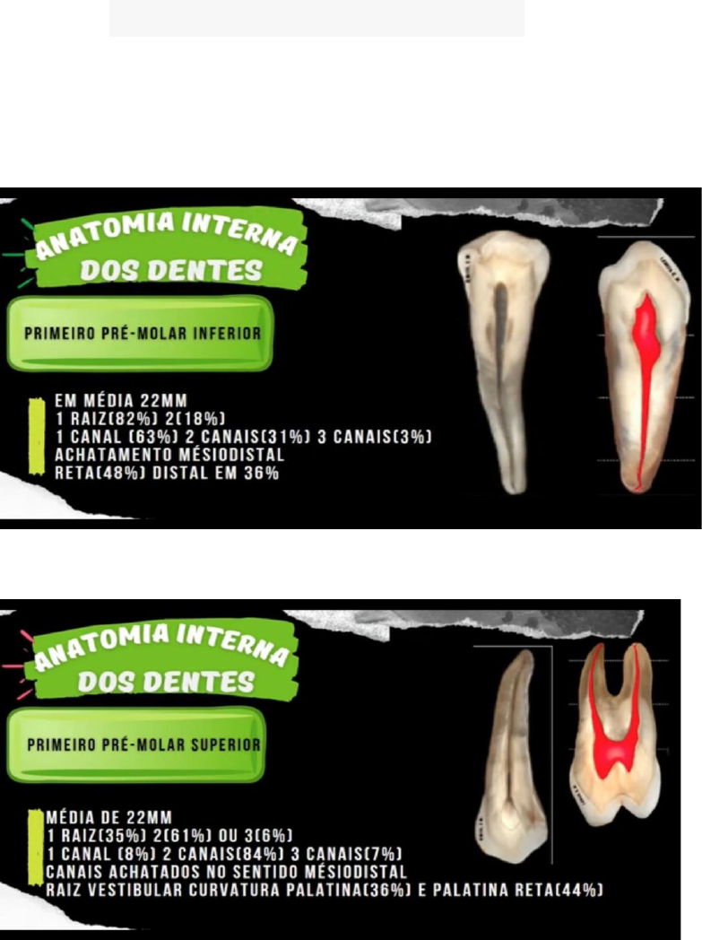 Anatomia interna do posteriores • Os pré-molares e molares são dentes multirradiculares, o que significa que possuem mais de uma raiz. Os pré-molares inferiores podem ter uma ou duas raízes com um ou dois canais também • No caso dos pré-molares superiores, geralmente têm uma ou duas raízes com um ou dois canais. • Para os molares superiores, os primeiros molares têm três raízes e três ou quatro canais; • enquanto os segundos molares têm três raízes e três ou quatro canais, muito semelhantes aos primeiros molares superiores; • Nos molares inferiores, os primeiros molares têm duas raízes e três ou quatro canais, com a raiz mesial frequentemente apresentando curvatura para a direção distal. • Os segundos molares inferiores também têm duas raízes e três canais, sendo que a raiz mesial costuma ter uma curvatura para a direção distal.