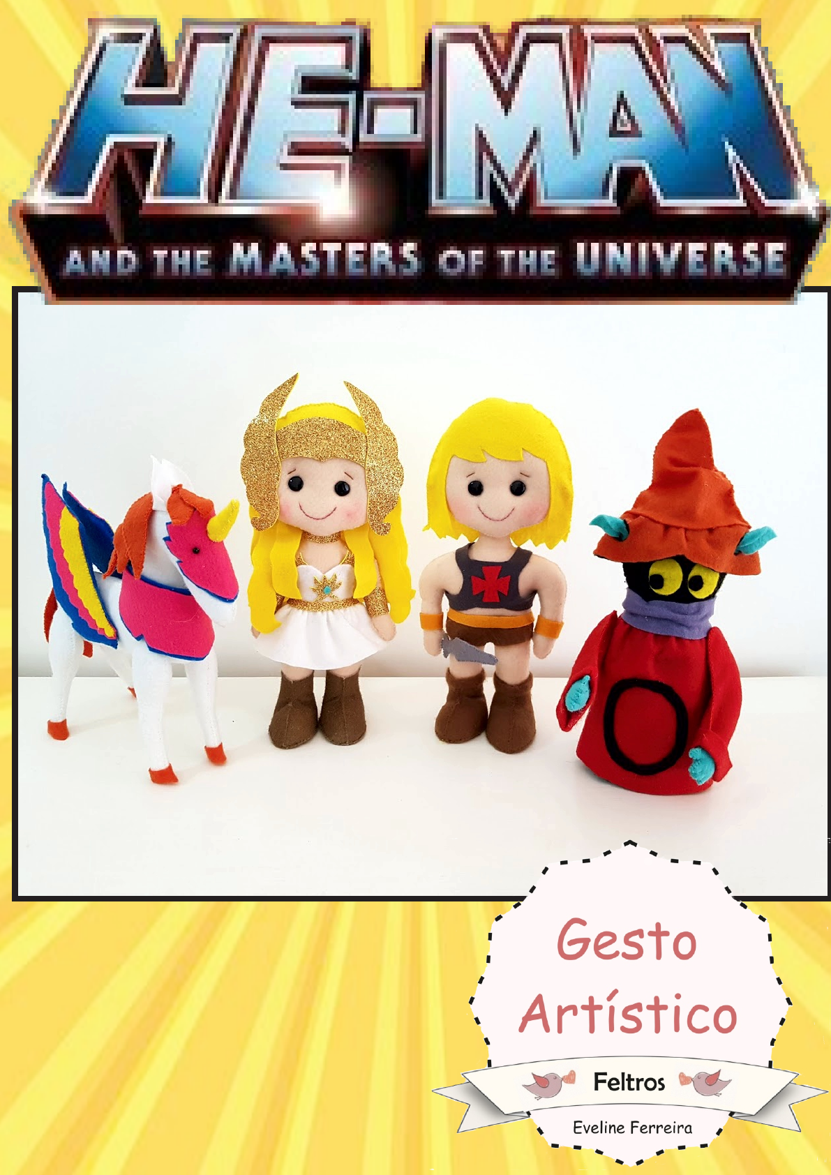 She-Ra 30 cm He- Man - 30 cm Gorbo - 30 cm Ventania- 20 cm Moldes + Fotos Passo a passo Índice Meu nome é Eveline Ferreira, sou artesã e trabalho com o feltro há 6 anos. Tenho formação em biologia, mas a paixão pelo artesanato foi maior . Sou criadora da marca Gesto Artístico Feltros. He-man 3 Lista de Materiais - Feltros bege, Amarelo, marrom, laranja, cinza claro, cinza escuro, vermelho - Linhas meada bege, amarelo, marrom, cinza claro, cinza escuro, rosa escuro - Agulha, tesoura -Cola quente e/ou cola de silicone - Papel panamá ou papelão - Fibra siliconada - Botão (cerca de 1 cm diâmetro) - Escova - Caneta Tecido rosa claro 4 Passo a Passo Corte os moldes de acordo com as orientações dos gabaritos Posicione o cabelo sobre o rosto e cole apenas na parte interna (pode utilizar cola de silicone ou cola quente) Na parte de trás do cabelo, cole apenas com um pingo de cola nas laterais 5 Costure a parte bege, do rosto, deixando a parte de cima do cabelo aberta Costure o cabelo , encha bastante até ficar sem rugas e feche a cabeça Costure o corpo, deixando as partes de baixo abertas, onde serão os pés. Encha bastante. É importante que a perna fique bem durinha para sustentar o boneco em pé Cole os papeis Panamá (ou papelão duro) nas solas dos pés 6 Na parte que ficou aberta no corpo, passe bastante cola quente e cole um uma extremidade das solas dos pés. Repita nos dois pés ‘ Abrace’ as pernas com o molde da bota e dê um ponto com a linha marrom unindo as pontas Costure toda a volta de baixo, unindo a sola com a bota Suba a costura até a parte superior e encha bastante 7 Costure a parte inferior da sunga Encaixe no corpo e costure as laterais Com a ajuda de uma escova, desfie um pouco a suga e a fita que será o acabamento das botas. No meu caso usei uma escova de cabelo, mas poderia ser qualquer outro material que consiga desfiar. Cole o detalhe nas botas 8 Cole o cinto e as tiras da armadura na parte posterior do corpo Cole o detalhe da armarura Marque a posição dos olhos e, com uma linha dupla, de um nó e puxe, pra ficar fundo 9 Utilizei para os olhos botões, mas você pode usar meia pérola também. Neste caso dos botões, com o auxílio de um alicate, corte a parte de trás. Com um pingo de cola quente, cole os botões nas áreas fundas Para a boca, utilizo uma moeda para fazer a marcação. Mas você também pode utilizar o gabarito. 10 Com a linha dupla, faça um nó na parte posterior da cabeça, e faça o contorno da marcação com a tecnica de ponto a atrás. Não é necessario ficar transpassando a cabeça. Dá para fazer apenas superficialmente (fig.2). Finalize com outro no atrás da cabeça com a linha dupla marrom, faça as sobrancelhas apenas com um ponto transversal aos olhos Faça um corte cerca de 2 dedos acima do queixo atrás da cabeça 11 Encaixe o pescoço dentro do corte e cole. Cole também na frente. Cole o cabelo por cima para esconder o acabamento Costure a espada com o papel panamá ou papelão no meio Cole a espada na mão do He-Man e os braceletes 12 Com a caneta para tecidos rosa, faça uma bolinha na bochecha e esfume com o dedo Seu He- Man está pronto !!! He-man Corpo Bege 2x Cabeça bege 2x sunga marrom 2x Espada cinza 2x espada papel panamá Cinto- Laranja 18 cm x 1 cm Bracelete-Laranja 5 cm x 1 cm He-Man Cabelo amarelo 1x Cabelo amarelo 1x sola pé marrom 2x Sola papel panamá 2x Bota marrom 2x Armadura cinza esc. 1xDetalhe vermelho 1x She- Ra 15 Lista de Materiais - Feltros bege, amarelo, branco, Turquesa - E. V. A Dourado - Tinta em spray dourado -Linhas branco, bege, amarelo, rosa forte, marrom - Tesoura, agulha - Botão (cerca de 1 cm diâmetro) - Cola quente e /ou cola de silicone - Papel Panamá - Fibra siliconada - Caneta tecido Rosa claro 16 Passo a Passo Corte os moldes de acordo com as orientações dos gabaritos Pinte um pedaço de feltro branco ou bege com o spray dourado. Espere secar e corte as botas e solas Posicione o cabelo sobre o rosto e cole apenas na parte interna (pode utilizar cola de silicone ou cola quente). Na parte de trás do cabelo, cole apenas com um pingo de cola nas laterais 17 Costure o rosto com bege e o cabelo com amarelo. Encha bastante com a fibra, até que não fique nenhuma ruga Costure o corpo, deixando as partes de baixo abertas, onde serão os pés. Encha bastante. É importante que a perna e o pescoço fiquem bem durinhos para sustentar o boneco em pé Cole o papel Panamá nas solas das botas Coloque bastante cola quente na parte que ficou aberta na perna e cole em uma extremidade da sola 18 ‘ Abrace’ as pernas com o molde da bota e dê um ponto com a linha marrom unindo as pontas Costure toda a volta de baixo, unindo a sola com a bota Costure toda a volta de baixo, unindo a sola com a bota Suba a costura até a parte superior e encha bastante Costure a roupa nas laterais e em baixo 19 Una as pontas do retângulo da saia e faça pontos simples Vire do avesso e em uma das barras, faça pontos corridos Puxe a linha e finalize a saia com um nó atrás, ficando enrugado Cole os detalhes em E.V.A da roupa com cola quente ou de silicone 20 Cole a tiara de E.V.A Cole os detalhes laterais da tiara, passando cola apenas no canto interno Marque a posição dos olhos e, com uma linha dupla, de um nó e puxe, pra ficar fundo Com um pingo de cola quente, cole os botões nas áreas fundas 21 Para a boca, utilizo uma moeda para fazer a marcação. Mas você também pode utilizar o gabarito. Com a linha dupla, faça um nó na parte posterior da cabeça, e faça o contorno da marcação com a técnica de ponto a atrás. Não é necessário ficar transpassando a cabeça. Dá para fazer apenas superficialmente . Finalize com outro no atrás da cabeça Faça um corte cerca de 2 dedos acima do queixo atrás da cabeça Encaixe o pescoço no buraco e cole com cola quente atrás e na frente 22 Nas mechas do cabelo, passe cola somente em cima e cole atrás da cabeça. os mais curtos para dentro ,