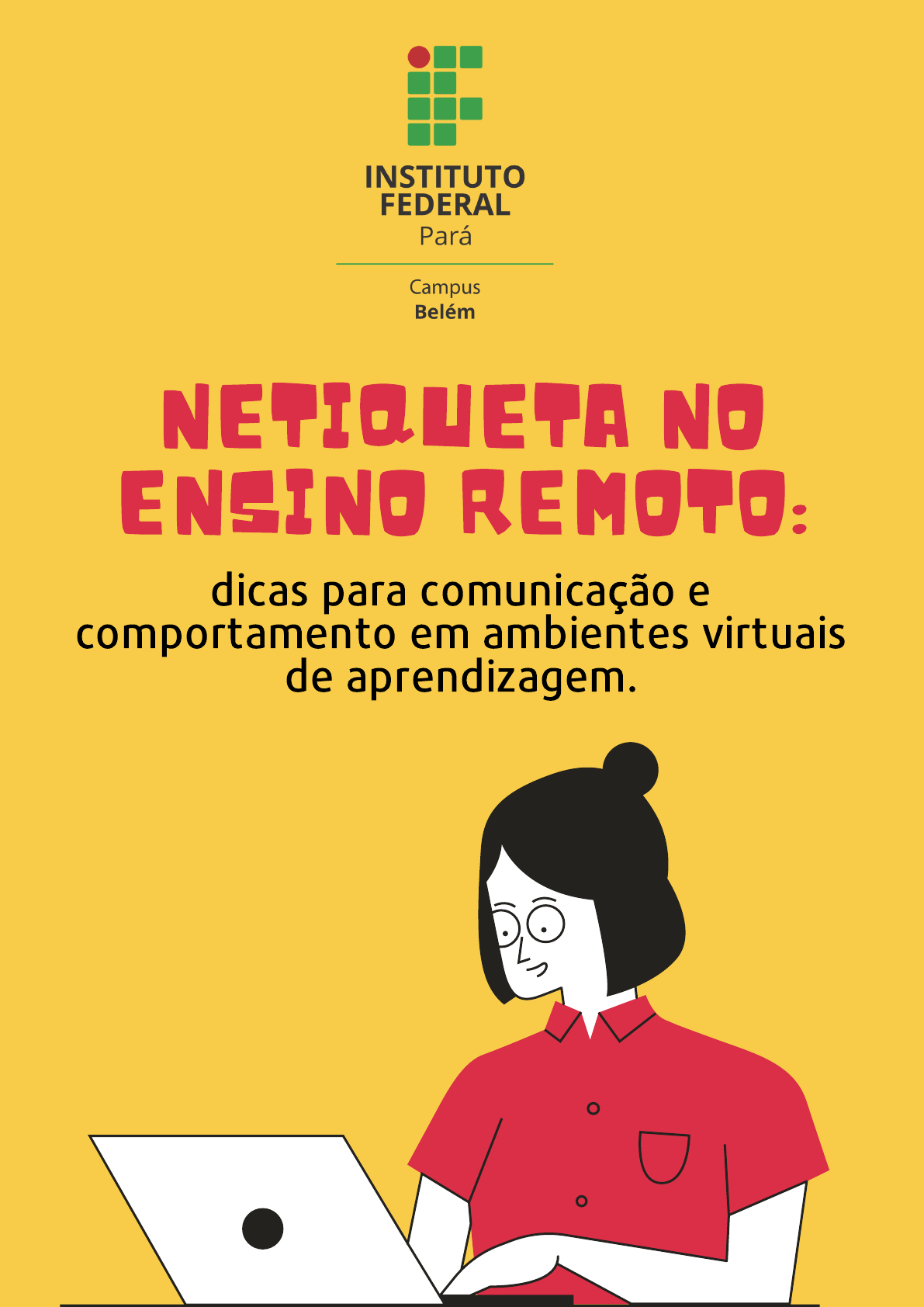 NETIQUETA NO ENSINO REMOTO: dicas para comunicação e comportamento em ambientes virtuais de aprendizagem. Elaboração e Organização Jefferson de Abreu Monteiro Mariane Daltro Mariath Édina do Socorro Gomes Rodrigues Alexandre Santos da Silva Danielle Rodrigues Dias Elaine Ribeiro Gomes Miriam Castro Marques Sérgio Yury Almeida da Silva NETIQUETA NO ENSINO REMOTO: DICAS PARA COMUNICAÇÃO E COMPORTAMENTO EM AMBIENTES VIRTUAIS DE APRENDIZAGEM Outubro, 2020 NETIQUETA NO ENSINO REMOTO: dicas para comunicação e comportamento em ambientes virtuais de aprendizagem. É livre a reprodução exclusivamente para fins não comerciais, desde que a fonte seja citada. Em tempos de pandemia da Covid-19 e hipervirtua- lização das relações humanas, a nova palavra de ordem é “netiqueta”, isto é, um conjunto de normas de conduta e de bom senso que regem a utilização de forma amistosa da internet como ferramenta de comunicação e interação por seus usuários. É essencial saber se portarÉ essencial saber se portar adequadamente no espaço digital,adequadamente no espaço digital, ainda mais quando se trata do meioainda mais quando se trata do meio educacional!educacional! Na sala de aula remota, estar em dia com a netiqueta tem se tornado condição básica para tornar fluido e eficiente o processo de ensino-aprendizagem. É preciso que professores e alunos estabeleçam um contrato de convivência, onde ambas as partes devem estar de acordo com as regras. Algumas delas descobertas e experimentadas na prática. A seguir, serão enunciados alguns preceitos essenciais para comunicação eficaz e saudável em Ambientes Virtuais de Aprendizagem, explicitando, sempre que possível, a sua pertinência para a criação de um ambiente emocionalmente favorável à valorização da participação de todos. 1 Seja educado e conciliador. Trate os outros com respeito. Comece por se apresentar aos seus colegas e professor de um modo amistoso. Utilize as formas de saudação e tratamento adequadas (Ex.: “Bom dia, colega João“; “Bom dia, Senhor Professor”) e encerre a sua mensagem sempre com uma fórmula de despedida cordial (Ex.: “Um abraço e até a próxima aula”). 2Respeitar as regras do espaço virtual em que se está. Por exemplo, ao entrar na sala de aula virtual certifique-se que o microfone está desligado para que o ruído do ambiente não interfira na atividade síncrona. A ordem é entrar em silêncio e só quando for o caso de fazer alguma intervenção restabelecer o áudio. 3 Para que o professor não perca a linha de raciocínio, o aluno deverá se manifestar através do chat, que é um instrumento de mensagem automática comum a todos e que equivale a levantar a mão para pedir a palavra. O professor vê a solicitação no chat e então escolhe a melhor hora de chamar o aluno. 4 A postura participativa é essencial no processo interativo digital e pode ser captada através de áudio ou vídeo. Para o professor, a câmera tem que estar ligada. O aluno precisa ver o professor, é o gancho para o encontro! Para os alunos, deve-se ter cuidado com a câmera ligada, porque às vezes nem sabemos o alcance que ela tem. Mas também é importante para o professor ver o aluno engajado no processo. Contudo, todas as câmeras ligadas podem sobrecarregar a rede ou distrair o professor. Portanto, isso deverá ser negociado a cada aula. 5Quanto ao horário da disciplina, o aluno deve estar online pontualmente nos dias e horários estipulados. O uso da câmera será acordado entre quem participa daquele evento síncrono. Importante estar adequadamente vestido, pois o encontro acadêmico pede vestimenta adequada para aquele momento. 6 Lembrar de utilizar corretamente a pontuação ao escrever. Isso ajuda na compreensão da mensagem. Preocupe-se com a estrutura das frases, evitando erros de concordância, ortográficos e de pontuação. 7 Evitar utilizar apenas caracteres maiúsculos (CapsLock/ caixa alta). Escrever em caixa alta em ambientes virtuais equivale a ‘gritar’ em uma conversa e pode deixar o seu interlocutor apreensivo. 8 Evitar o uso exagerado de emoticon, emojis (carinhas) e memes nos ambientes de aula online, nos fóruns, e- mails e grupos de Whatsapp e Telegram. Utilize-os somente para suprir a ausência de pistas visuais, presentes na comunicação face a face (Ex.: “Podes compartilhar com os colegas o material? 😊” - cara sorridente esclarece que o enunciado é um pedido feito com delicadeza). 9 Compartilhar conhecimentos e dúvidas com os colegas. Deixar dúvidas no ambiente virtual de aprendizagem ou no grupo da turma. Não esqueça de consultar as mensagens antes de publicar a sua. Veja se a dúvida não foi abordada por outro colega e já respondida pelo professor. 10 Manter o foco ao responder em fóruns ou fazer perguntas em chats. Não fugir do assunto. 11 Cuidar do bom uso do SIGAA e demais ambientes virtuais disponibilizado pela instituição. 12 Ao escrever um e-mail, cumprimentar o destinatário, depois se identificar e informar o curso e a turma da qual faz parte.Depois escrever sua dúvida, solicitação ou comunicado. Ao final, agradecer e inserir a assinatura (nome completo). 13 Não enviar mensagens fora do horário de aula ou em finais de semana e feriados. 14 Não use gírias ou palavrões. Não alimente polêmicas, não reaja a mensagens provocatórias e evite discussões acaloradas, de forma a que estas se extingam o mais depressa possível.O ambiente virtual, muitas vezes, dá mais coragem para as pessoas se manifestarem de forma mais incisiva ou agressiva. A falta do face a face acaba fazendo com que os indivíduos se sintam mais à vontade para fazer colocações que não fariam pessoalmente. Antes de dizer ou digitar algo, pense bem naquilo que vai fazer e na imagem que você deve transmitir aos outros, se irá ofender ou constranger alguém. Lembre-se que você pode ser responsabilizado disciplinarmente ou criminalmente pelas infrações 