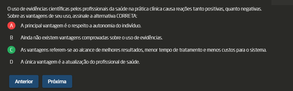 de evidências científicas pelos profissionais da saúde na prática clínica causa reações tanto positivas, quanto negativas. Sobre as vantagens de seu uso, assinale a alternativa CORRETA: A A principal vantagem é 0 respeito a autonomia do indivíduo. B Ainda não existem vantagens comprovadas sobre 0 USO de evidências. As vantagens referem-se ao alcance de melhores resultados, menor tempo de tratamento e menos custos para sistema. D A única vantagem é a atualização do profissional de saúde. Anterior Próxima
