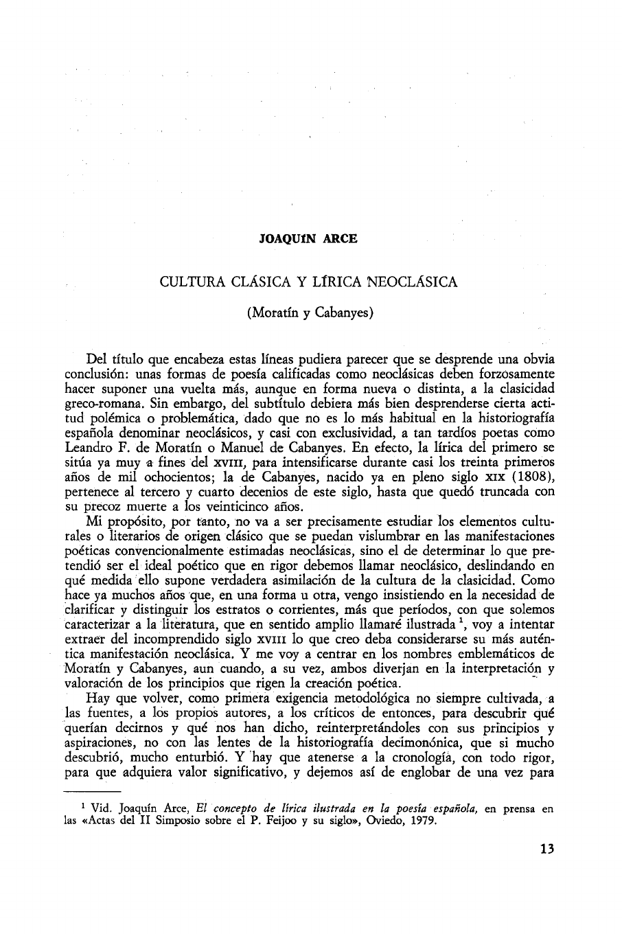 JOAQUIN ARCE CULTURA CLÁSICA Y LfRICA NEOCLÁSICA (Moratín y Cabanyes) Del título que encabeza estas líneas pudiera parecer que se desprende una obvia conclusión: unas formas de poesía calificadas como neoclásicas deben forzosamente hacer suponer una vuelta más, aunque en forma nueva o distinta, a la clasicidad greco-romana . Sin embargo, del subtítulo debiera más bien desprenderse cierta acti- tud polémica o problemática, dado que no es lo más habitual en la historiografía española denominar neoclásicos, y casi con exclusividad, a tan tardíos poetas como Leandro F. de Moratín o Manuel de Cabanyes . En efecto, la lírica del primero se sitúa ya muy a fines del xvIII, para intensificarse durante casi los treinta primeros años de mil ochocientos; la de Cabanyes, nacido ya en pleno siglo xix (1808), pertenece al tercero y cuarto decenios de este siglo, hasta que quedó truncada con su precoz muerte a los veinticinco años . Mi propósito, por tanto, no va a ser precisamente estudiar los elementos cultu- rales o literarios de origen clásico que se puedan vislumbrar en las manifestaciones poéticas convencionalmente estimadas neoclásicas, sino el de determinar lo que pre- tendió ser el ideal poético que en rigor debemos llamar neoclásica, deslindando en qué medida ello supone verdadera asimilación de la cultura de la clasicidad . Como hace ya muchas años que, en una forma u otra, vengo insistiendo en la necesidad de clarificar y distinguir los estratos o corrientes, más que períodos, con que solemos caracterizar a la literatura, que en sentido amplio llamaré ilustrada 1 , voy a intentar extraer del incomprendido siglo xviii lo que creo deba considerarse su más autén- tica manifestación neoclásica . Y me voy a centrar en los nombres emblemáticos de Moratín y Cábanyes, aun cuando, a su vez, ambos diverjan en la interpretación y valoración de dos principios que rigen la creación poética. Hay que volver, como primera exigencia metodológica no siempre cultivada, a las fuentes, a los propios autores, a los críticos de entonces, para descubrir qué querían decirnos y qué nos han dicho, reinterpretándoles con sus principios y aspiraciones, no con las lentes de la historiografía decimonónica, que si mucho descubrió, mucho enturbió . Y 'hay que atenerse a la cronología, con todo rigor, para que adquiera valor significativo, y dejemos así de englobar de una vez para ' Vid. Joaquín Arce, El concepto de lírica ilustrada en la poesía española, en prensa en las «Actas del II Simposio sobre el P. Feijoo y su siglo», Oviedo, 1979 . 13 siempre decenios y decenios de distinta creación literaria bajo epígrafes traidores y desviantes, como el mismo de Neoclasicismo. Que entre fines del XVIII y primeros años del xix había en España dos bandos literarios, opuestos, con opiniones políticas diversas, y distinto apoyo oficial, y, como consecuencia, con valoraciones divergentes del quehacer literario, es algo innegable y fácilmente documentable . Moratín capitanea el grupo políticamente más conformista, el de los que prefirie- ron -como dijo Quintana refiriéndose, sin nombrarlo, a nuestro poeta- «la imi- tación italiana», esmerándose «en la puntual simetría de los metros, en el halago de los números, en la elegancia y pureza del estilo, en la facilidad y limpieza de la ejecución» . Quintana, que no menciona a Moratín porque es de los que aún vive cuando escribe, deslinda a este grupo literario del de los que habían introducido ese «gusto extraño, que parece tomado del francés, del alemán y del inglés»' : clara referencia los que podemos llamar prerrománticos . Lógicamente Quintana no confundía ese nuevo gusto clásico con la corriente clasicista que había atravesado el siglo xvlii. Cuando, por otra parte, Menéndez Pelayo declara que «en realidad, la Poética de Martínez de la Rosa es la llave que cierra el período abierto por la Poética de Luzán» s, lo que indica, en fin de cuentas, es que entre 1737 y 1822 se vivió bajo un aura de principios poéticos que abarcaron casi un siglo, de signo o de base clasicista, sin que ello signifique confundir a Luzán con Martínez de la Rosa . También el Renacimiento había reincorporado el antiguo clasicismo, nunca olvidado por lo demás durante la Edad Media, lo que obliga a que precisemos y aclaremos estas distintas facetas o fases de la restauración clásica . No voy a insistir aquí en el alcance y los límites que deben asignarse al término y a la noción de Neoclasicismo, ya que he tratado muy recientemente, en Bolonia, de lo significado por Nápoles y Roma, en los últimos decenios del si- glo XVIII, en esta restauración del arte antiguo' . Además de la función representada por los españoles en las excavaciones de Pompeya y Herculano, en Roma coincidie- ron, en torno a los mismos años, el diplomático José Nicolás de Azora, divulgador de las doctrinas neoclásicas de Anton Raphael Mengs; el jesuita Esteban de Arteaga, que había publicado en Madrid sus Investigaciones filosóficas sobre la Belleza ideal (1789) ; y el mismo Leandro Fernández de Moratín, que hacía frecuentes visitas a Arteaga y a Azora, y morirá en 1827, un año antes que el máximo repre- sentante del más alto lirismo neoclásico en la literatura italiana, Ugo Foscolo. El Neoclasicismo pudo parecer, visto con miope mirada, inerte -academicismo, sin tener en cuenta que elevó el tono y el lenguaje poético que en el momento central de la Ilustración había descendido al nivel de la llaneza prosaica . Y del mismo modo que el fenómeno del prosaísmo merece ser comprendido e interpretado en su momento, lo neoclásico requiere también conciencia de la evolución artística y cultural . En modo alguno el Neoclasicismo debe ser considerado peyorativamente ni juzgado como pretensión reaccionaria de una vuelta atrás. Por su actitud rebelde e innovadora coincide con los brotes de sensibilidad prerrom