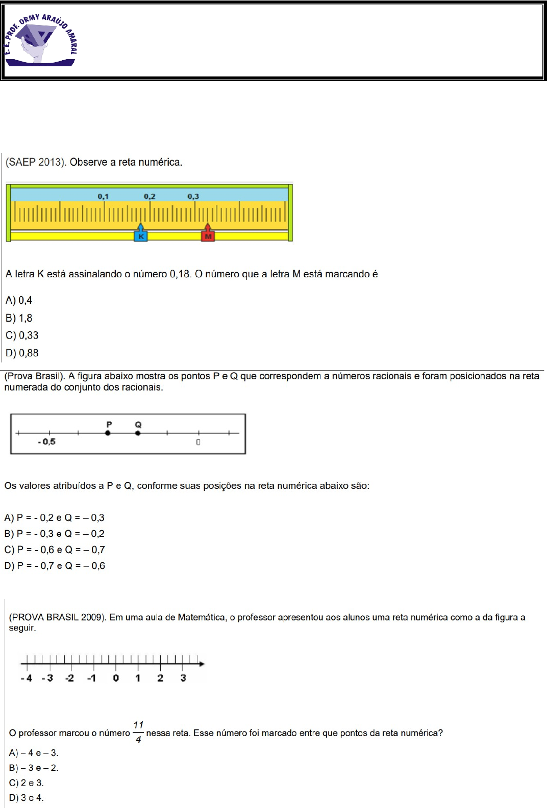 ESCOLA ESTADUAL PROFESSORA ORMY ARAÚJO AMARAL Semana de Intervenção Pedagógica Aluno (a): ____________________________________ Professor (a): _______________________________________________ Data: ________/______/________ Ano: _____ Turma: ______ D011_M - Corresponder pontos da reta numérica a números racionais. D014_M - Executar cálculos com números inteiros. Exercício 1 Sendo a = -3, b = -2 e c = 6, resolva as seguintes sentenças: a) a + b + c = b) c - b + a = c) c/a - b = d) c . b + a = e) c + a . b = Exercício 2 Utilize os sinais < ou > para indicar a relação de maior ou menor entre os números: a) - 8 ____ 2 b) -25 _____ -45 c) 84 _____ - 256 d) -7 ____ -8 Exercício 3 Resolva as expressões numéricas: a) 4 - 7 - 15 + 8 = b) (-5)² - 13 + 20 - 9 = c) - 22 - 8 + 4³ + 14 = d) -66 + 45/5 - 81 = D018_M - Executar cálculos envolvendo potência de números inteiros. Calcule o valo de M. Resolva as expressões numéricas: a) (-2)3 b) (-5)4 c) (-7)1 d) (-6)0 image5.png image1.png image2.png image3.png image4.png