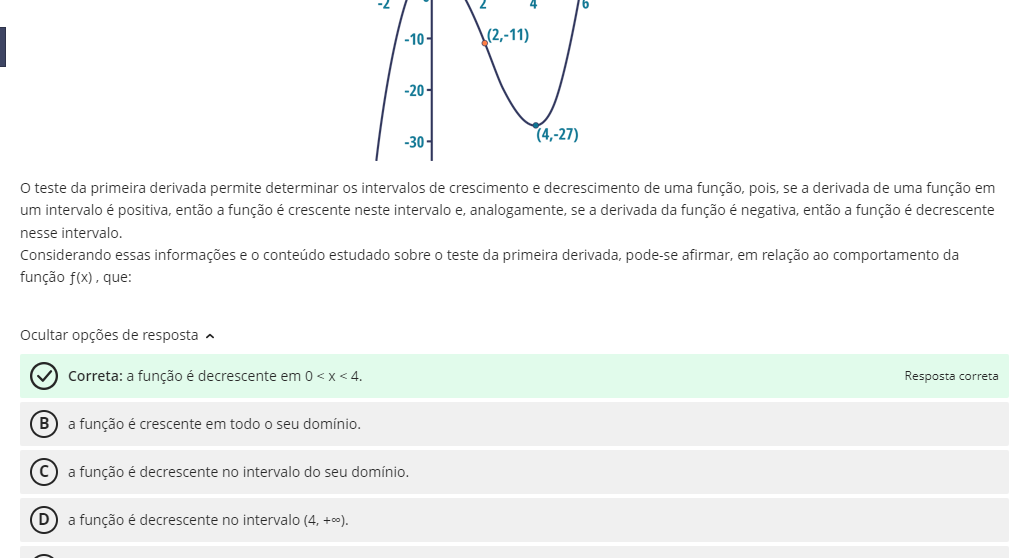 4 -10 (2,-11) -20 -30 (4,-27) teste da primeira derivada permite determinar os intervalos de crescimento e decrescimento de uma função, pois, se a derivada de uma função em um intervalo é então a função é crescente neste intervalo analogamente, se a derivada da função é negativa, então a função é decrescente nesse intervalo. Considerando essas informações e conteúdo estudado sobre teste da primeira derivada, pode-se afirmar, em relação ao comportamento da função f(x) que: Ocultar opções de resposta Correta: a função é decrescente em Resposta correta B a função é crescente em todo seu domínio. C a função é decrescente no intervalo do seu domínio. D a função é decrescente no intervalo (4,