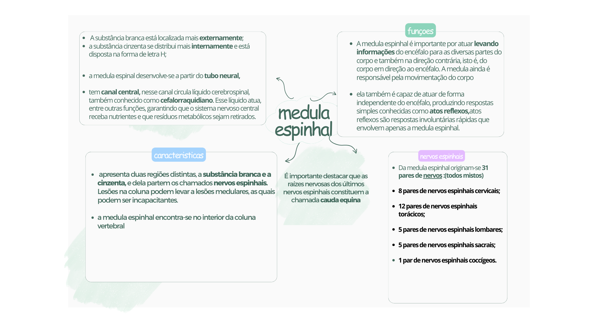 funçoes A substância branca está localizada mais externamente; a substância cinzenta se distribui mais internamente e está A medula espinhal é importante por atuar levando disposta na forma de letra H; informações do encéfalo para as diversas partes do corpo e também na direção contrária, isto é, do corpo em direção ao encéfalo. A medula ainda é a medula espinal desenvolve-se a partir do tubo neural, responsável pela movimentação do corpo tem canal central, nesse canal circula líquido cerebrospinal, ela também é capaz de atuar de forma também conhecido como cefalorraquidiano. Esse líquido atua, independente do encéfalo, produzindo respostas entre outras funções, garantindo que o sistema nervoso central receba nutrientes e que resíduos metabólicos sejam retirados. medula simples conhecidas como atos reflexos,atos reflexos são respostas involuntárias rápidas que espinhal envolvem apenas a medula espinhal. caracteristicas nervos espinhais Da medula espinhal originam-se 31 apresenta duas regiões distintas, a substância branca e a É importante destacar que as pares de nervos :(todos mistos) cinzenta, e dela partem os chamados nervos espinhais. raízes nervosas dos últimos Lesões na coluna podem levar a lesões medulares, as quais nervos espinhais constituem a 8 pares de nervos espinhais cervicais; podem ser incapacitantes. chamada cauda equina 12 pares de nervos espinhais a medula espinhal encontra-se no interior da coluna torácicos; vertebral 5 pares de nervos espinhais lombares; 5 pares de nervos espinhais sacrais; 1 par de nervos espinhais coccígeos.