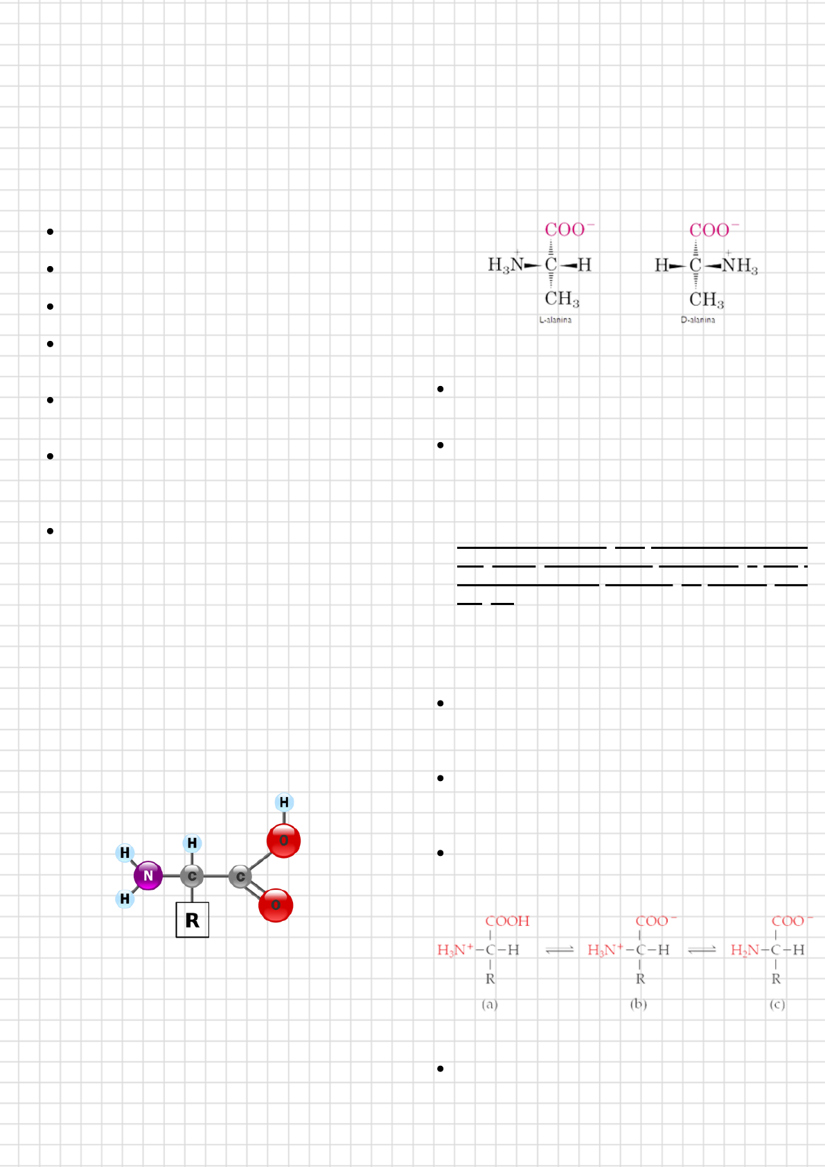 proteínas São macromoléculas formadas por um conjunto de aminoácidos unidos entre si através de ligações peptídicas . Definição: Funções: Catálise enzimática: as proteínas atuam como enzimas, acelerando as reações químicas no corpo ; Transporte: proteínas como a hemoglobina transportam substâncias essenciais; Suporte estrutural: suporte e estrutura aos tecidos do corpo; Defesa imunológica: anticorpos são proteínas do sistema imunológico que reconhecem e neutralizam invasores, como bactérias, vírus e toxinas; Movimento Celular: Proteínas motoras, como a dineína e a cinesina, movem vesículas e organelas dentro das células ao longo de filamentos de microtúbulos; Regulação genética: as histonas são proteínas que ajudam a compactar o DNA nas células e regulam a expressão dos genes, controlando qual parte do DNA é acessível para a síntese de proteínas; Funções hormonais: as proteínas hormonais atuam como mensageiros químicos que regulam funções vitais no organismo, como metabolismo, crescimento, reprodução e resposta ao estresse. AMINOÁCIDOS Estrutura: Definição: São compostos que apresentam as funções ácido carboxílico (carboxila = - COOH) e amina (amino = - NH2). São os 20 tipos de aminoácidos. Um carbono alfa (α) central ligado a um radical amina, um radical carboxila, um hidrogênio e um quarto radical, chamado R, que é diferente para cada um dos 20 aminoácidos. Grupo R (ou cadeia lateral): é uma parte variável da molécula de aminoácido e difere entre os diferentes tipos de aminoácidos. O grupo R pode ser uma estrutura simples ou complexa, e é responsável pelas propriedades químicas e físicas únicas de cada aminoácido. Estereoisomerismo: O estereoisomerismo dos aminoácidos refere-se ao fato de que eles existem em duas formas espelhadas não sobreponíveis, chamadas enantiômeros. Essas formas têm a mesma fórmula química e conectividade de átomos, mas diferem na orientação espacial. Os aminoácidos com carbono α assimétrico apresentam dois isômeros opticamente ativos, os isômeros D e L, que são Imagens especulares um do outro. Todas as proteínas encontradas nos seres vivos são formadas por L- aminoácidos. Classificação dos aminoacídos: Os aminoácidos apolares têm grupos R com caráter de hidrocarboneto, que não interagem com a água; por isso, frequentemente localizam se no interior da molécula proteica. Os aminoácidos polares têm, nas cadeias laterais, grupos com carga elétrica líquida ou grupos com cargas residuais, que os capacitam a interagir com a água. São geralmente encontrados na superfície da molécula proteica. Estes aminoácidos são subdivididos em três categorias, segundo a carga apresentada pelo grupo R em pH 7: aminoácidos básicos, se a carga for positiva; aminoácidos ácidos, se a carga for negativa; e aminoácidos polares sem carga (neutros), se a cadeia lateral não apresentar carga líquida, ou seja, não carregados. Aminoácidos são classificados de acordo com a polaridade do radical R. Ionização dos aminoacídos: pH Ácido (Menor que 7): Em um ambiente ácido, o grupo amino (NH2) tende a ganhar prótons (H+) e se tornar NH3+. O grupo carboxila (COOH) permanece COOH, pois é menos propenso a perder prótons - carga positiva (a). pH Neutro (Igual a 7): Em um ambiente neutro, os grupos amino e carboxila estão parcialmente ionizados, resultando na forma zwitteriônica, onde o grupo amino está NH3+ e o grupo carboxila está COO- - carga positiva e uma negativa ao mesmo tempo (b). pH Básico (Maior que 7): Em um ambiente básico, o grupo carboxila (COOH) tende a perder prótons (H+) e se tornar COO-. O grupo amino (NH2) permanece como NH3+ - carga negativa (c). A ionização dos aminoácidos é como eles podem ficar carregados eletricamente em diferentes ambientes. Isso depende do pH, que mede a acidez ou a basicidade de uma solução Aminoácidos como ácido ou base: Aminoácidos como ácidos: em certas condições, os aminoácidos podem doar prótons (partículas carregadas positivamente) de seus grupos carboxila (COOH), tornando-se negativamente carregados (COO-). Isso acontece em ambientes ácidos ou com baixo pH. Ponto isoelétrico: É o valor de pH no qual a molécula desse aminoácido não tem carga líquida, ou seja, tem carga elétrica igual a zero. Em outras palavras, é o pH no qual as cargas positivas (dos grupos amino) e as cargas negativas (dos grupos carboxila) se equilibram, resultando em uma molécula neutra. O pI de um aminoácido varia dependendo de sua estrutura específica, especialmente da natureza da cadeia lateral (grupo R) e de quantos grupos amino (NH2) e grupos carboxila (COOH) estão presentes. Generalizando, o pH em que a forma eletricamente neutra do aminoácido é mais abundante, o ponto isoelétrico (pI) é a média aritmética de dois valores de pKa: Os valores de pKa1 e pKa2 a serem considerados no cálculo do pI dependem do aminoácido. Para os que não contêm agrupamentos ionizáveis na cadeia lateral, utilizam-se os valores de pKa dos grupos amino e carboxila; para aminoácidos com três grupamentos ionizáveis, usam se os valores de pKa dos grupos com mesmo sinal de carga. Estrutura das proteínas: Primária: corresponde a uma sequência linear de aminoácidos. Secundária: além das ligações peptídicas entre os aminoácidos, estabelecem-se pontes de hidrogênio entre os radicais, de forma que a proteína pode adquirir forma de α- hélice. Terciária: corresponde à distribuição espacial e tridimensional de todos os átomos da proteína. Quaternária: é a associação de várias cadeias polípepditicas. Aminoácidos como bases: em diferentes condições, os aminoácidos podem aceitar prótons em seus grupos amino (NH2), tornando-se positivamente carregados (NH3+). Isso ocorre em ambientes básicos ou com alto pH. Classificação: Fibrosas: São longas e têm uma estrutura fibrosa, muitas vezes usadas em tecidos estrutura
