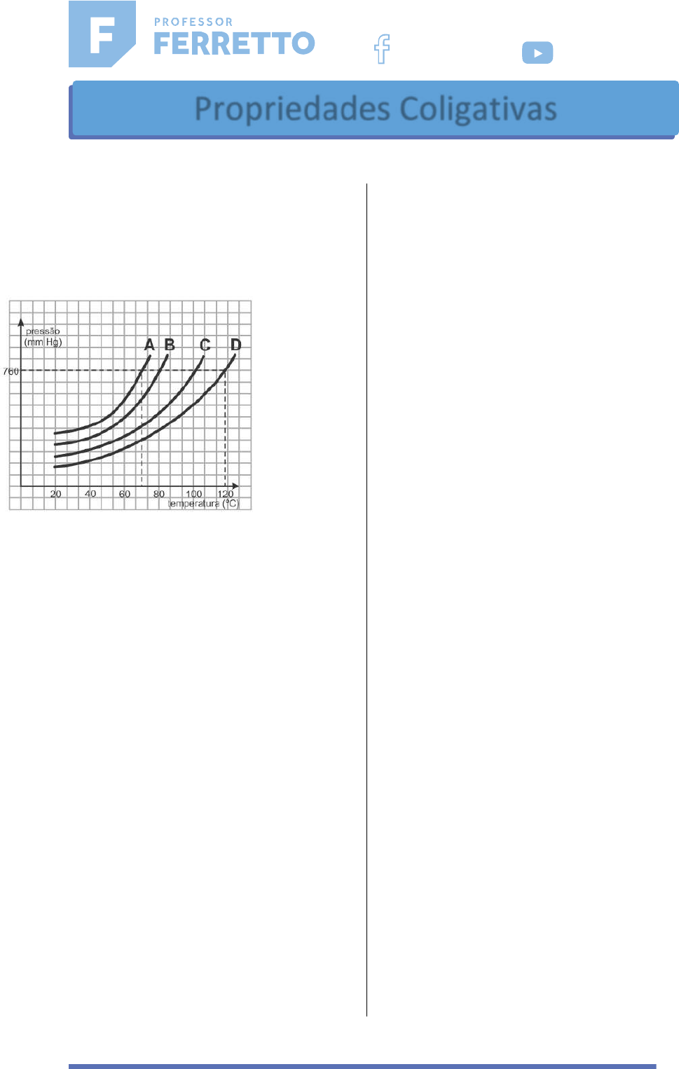 1 01 - (Ueg) As propriedades físicas dos líquidos podem ser comparadas a partir de um gráfico de pressão de vapor em função da temperatura, como mostrado no gráfico hipotético a seguir para as substâncias 𝐴, 𝐵, 𝐶 e 𝐷. Segundo o gráfico, o líquido mais volátil será a substância a) 𝐴 b) 𝐵 c) 𝐶 d) 𝐷 02 - (Ufrgs) Assinale a alternativa que completa corretamente as lacunas do enunciado abaixo, na ordem em que aparecem. Uma sopa muito salgada é aquecida numa panela aberta. Nessas condições, a sopa deve entrar em ebulição numa temperatura ......... .. 100°C. Assim, à medida que a água da sopa evapora, a temperatura da sopa ............... . a) acima de – aumenta b) acima de – diminui c) abaixo de – aumenta d) igual a – permanece constante e) igual a – aumenta 03 - (Unimontes) Em um recipiente contendo um chumaço de algodão umedecido com propanona, inseriu-se um termômetro e verificou-se a variação de temperatura. Repetiu-se o mesmo procedimento com etanol e depois com água. Observou-se que houve abaixamento da temperatura nos três casos devido à vaporização das substâncias. No entanto, o abaixamento da temperatura foi maior na propanona e menor na água. A partir desse experimento, é possível concluir que a ordem crescente da pressão máxima de vapor das substâncias é a) propanona, etanol, água. b) água, propanona, etanol. c) água, etanol, propanona. d) propanona, água, etanol. 04 - (Ufu) O estudo das propriedades coligativas das soluções permite-nos prever as alterações nas propriedades de seu solvente. A respeito das propriedades coligativas, assinale a alternativa correta. a) Se for colocada água com glutamato de monossódio dissolvido para congelar em uma geladeira, a temperatura de fusão da água na solução permanecerá a mesma que a da água pura. b) As propriedades coligativas independem do número de partículas do soluto na solução, da natureza das partículas e de sua volatilidade. c) Se forem preparadas duas soluções aquosas de mesma concentração, uma de glutamato de monossódio e outra de açúcar, a temperatura de ebulição da água na solução será maior que a da água na solução de açúcar. d) Em uma panela tampada, a pressão de vapor da solução aquosa de glutamato de monossódio é maior do que a pressão de vapor da água pura porque a presença do sal facilita a evaporação do solvente. www.professorferretto.com.br ProfessorFerretto ProfessorFerretto Propriedades Coligativas ee 2 05 - (Ufrn) Sorvete em cinco minutos. Uma receita rápida, prática e que parece mágica para o preparo de um sorvete de morango recomenda o seguinte procedimento: Despeje o leite, o açúcar e a essência de morango num saco de plástico de 0,5 litro e certifique-se de que ele fique bem fechado. Coloque 16 cubos de gelo e 6 colheres de sopa de sal comum 𝑁𝑎𝐶ℓ� num outro saco plástico de 1 litro. Insira o saco de 0,5 litro dentro do saco de 1 litro e feche muito bem. Agite as bolsas de plástico por 5 minutos e, após esse tempo, remova o saco de 0,5 litro de dentro do outro. Em seguida, corte um dos bicos inferiores do saco de 0,5 litro e despeje o sorvete no recipiente de sua preferência. O que parece mágica, ou seja, o congelamento do sorvete a uma temperatura (-20°C) mais baixa que 0°C, pela solução aquosa de 𝑁𝑎𝐶ℓ, é explicado pela propriedade coligativa de diminuição da temperatura de início de solidificação. Outro soluto que pode produzir a mesma diminuição da temperatura que o 𝑁𝑎𝐶ℓ é a) cloreto de potássio 𝐾𝐶ℓ�. b) cloreto de cálcio 𝐶𝑎𝐶 ℓ�2��. c) glicose 𝐶�6� 𝐻�12� 𝑂�6��. d) glicerina 𝐶�3� 𝐻�8� 𝑂�3��. 06 - (Ufrgs) Observe o gráfico abaixo, referente à pressão de vapor de dois líquidos, A e B, em função da temperatura. Considere as afirmações abaixo, sobre o gráfico. I. O líquido B é mais volátil que o líquido A. II. A temperatura de ebulição de B, a uma dada pressão, será maior que a de A. III. Um recipiente contendo somente o líquido A em equilíbrio com o seu vapor terá mais moléculas na fase vapor que o mesmo recipiente contendo somente o líquido B em equilíbrio com seu vapor, na mesma temperatura. Quais estão corretas? a) Apenas I. b) Apenas II. c) Apenas III. d) Apenas II e III. e) I, II e III. 07 - (Upe) As afirmativas abaixo estão relacionadas às propriedades da água e das soluções aquosas moleculares e iônicas. Sobre elas, é correto afirmar que a) quando se abre a tampa de uma garrafa de bebida gaseificada com dióxido de carbono, verifica-se que o gás borbulha fortemente; isso está relacionado com o aumento da pressão parcial do gás no momento em que se remove a tampa. b) não é aconselhável adicionar sal de cozinha ao recipiente contendo gelo, utilizado para gelar a bebida que será servida em uma festa, pois esse procedimento provocaria um aumento na temperatura de congelação da água. c) as águas dos oceanos congelam rapidamente, em regiões perto dos polos, sempre que a temperatura nesses locais atingir 0°𝐶 que é a temperatura de congelação da água pura ao nível do mar. d) um náufrago, mesmo com sede intensa, sob um sol inclemente, não deve ingerir água do mar, pois esse procedimento acelera a desidratação corporal, ocasionando sérios problemas para a sua saúde. e) numa panela de pressão usada praticamente por todas as donas de casa, a água ferve a uma temperatura superior a 100°𝐶, porque a pressão sobre a água no interior da panela é menor que 1 𝑎𝑡𝑚. 08 - (Unesp) A concentração de cloreto de sódio no soro fisiológico é 0,15 𝑚𝑜𝑙�𝐿�. Esse soro apresenta a mesma pressão osmótica que uma solução aquosa 0,15 𝑚𝑜𝑙�𝐿� de a) sacarose, C�12� 𝐻�22� 𝑂�11� b) sulfato de sódio, N a�2�S O�4� c) sulfato de alumínio, 𝐴 ℓ�2�(𝑆