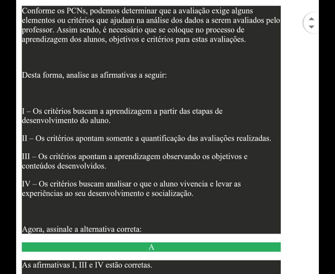 Conforme os PCNs, podemos determinar que a avaliação exige alguns elementos ou critérios que ajudam na análise dos dados a serem avaliados pelo professor. Assim sendo, é necessário que se coloque no processo de aprendizagem dos alunos, objetivos e critérios para estas avaliações. Desta forma, analise as afirmativas a seguir: I - Os critérios buscam a aprendizagem a partir das etapas de desenvolvimento do aluno. II - Os critérios apontam somente a quantificação das avaliações realizadas. III - Os critérios apontam a aprendizagem observando os objetivos e conteúdos desenvolvidos. IV - Os critérios buscam analisar que aluno vivencia e levar as experiências ao seu desenvolvimento e socialização. Agora, assinale a alternativa correta: A As afirmativas I, III e IV estão corretas.