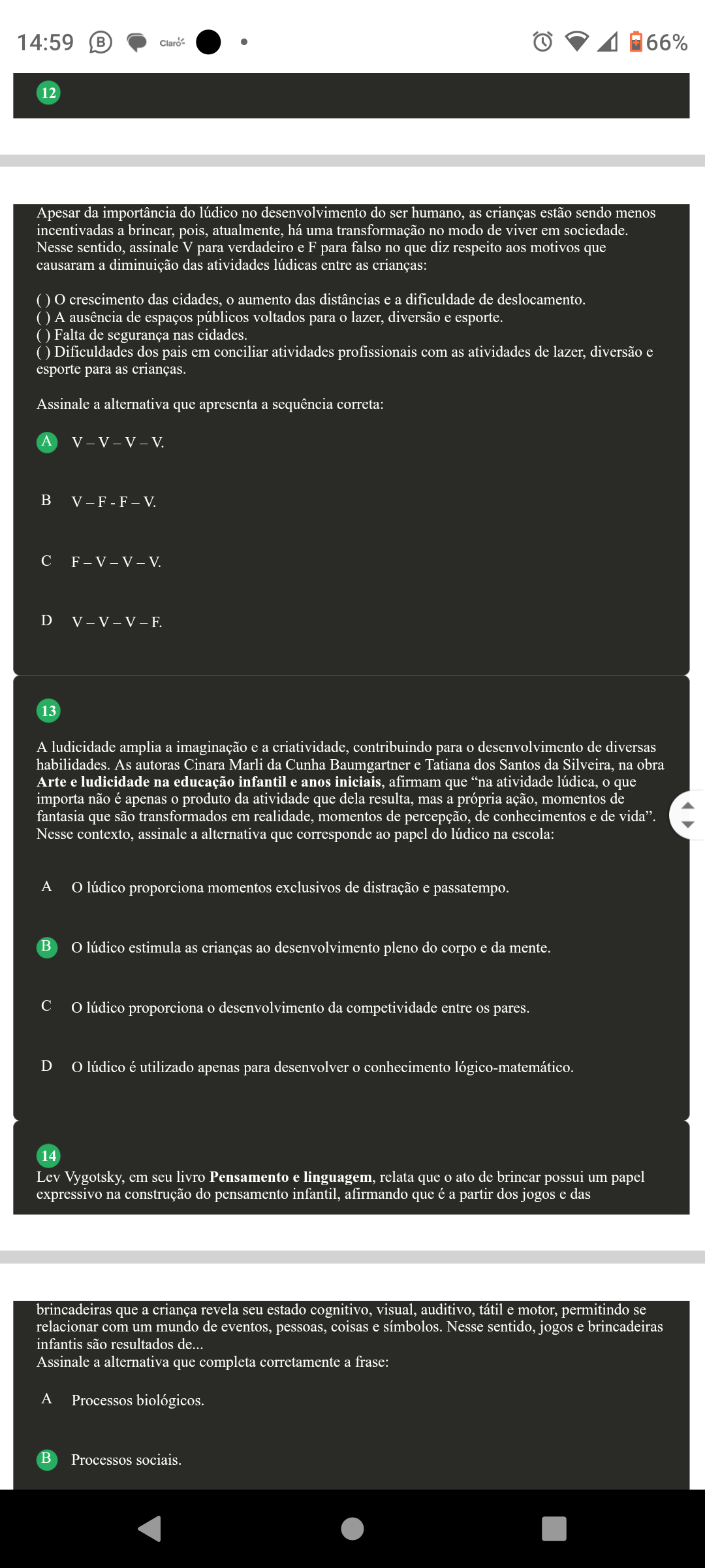14:59 B 66% 12 Apesar da importância do lúdico no desenvolvimento do ser humano, as crianças estão sendo menos incentivadas a brincar, pois, atualmente, há uma transformação no modo de viver em sociedade. Nesse sentido, assinale V para verdadeiro e F para falso no que diz respeito aos motivos que causaram a diminuição das atividades lúdicas entre as crianças: () O crescimento das cidades, aumento das distâncias e a dificuldade de deslocamento. A ausência de espaços públicos voltados para lazer, diversão e esporte () Falta de segurança nas cidades. Dificuldades dos pais em conciliar atividades profissionais com as atividades de lazer, diversão e esporte para as crianças. Assinale a alternativa que apresenta a sequência correta: V. B V-F-F- V. C F-V-V-V D 13 A ludicidade amplia a imaginação e a criatividade, contribuindo para desenvolvimento de diversas habilidades. As autoras Cinara Marli da Cunha Baumgartner e Tatiana dos Santos da Silveira, na obra Arte e ludicidade na educação infantil e anos iniciais, afirmam que "na atividade lúdica, o que importa não é apenas produto da atividade que dela resulta, mas a própria ação, momentos de fantasia que são transformados em realidade, momentos de percepção, de conhecimentos e de vida". Nesse contexto. assinale a alternativa que corresponde ao papel do lúdico na escola: A O lúdico proporciona momentos exclusivos de distração e passatempo. O lúdico estimula as crianças ao desenvolvimento pleno do corpo e da mente. C O lúdico proporciona desenvolvimento da competividade entre os pares. D O lúdico é utilizado apenas para desenvolver conhecimento lógico-matemático. 14 Ley Vygotsky, em seu livro Pensamento e linguagem, relata que ato de brincar possui um papel expressivo na construção do pensamento infantil, afirmando que é a partir dos jogos e das brincadeiras que a criança revela seu estado cognitivo, visual, auditivo, tátil e motor, permitindo se relacionar com um mundo de eventos, pessoas, coisas e símbolos. Nesse sentido, jogos e brincadeiras infantis são resultados de... Assinale a alternativa que completa corretamente a frase: A Processos biológicos. Processos sociais.