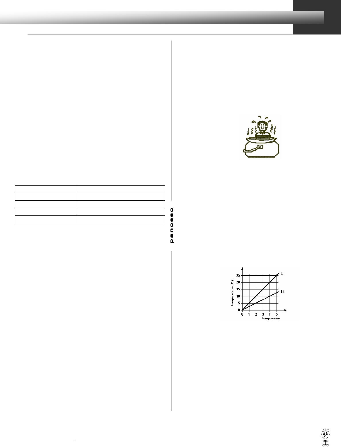 Calor sensível – 9º ano (E.F. II) www.professorpanosso.com.br 1 Prof. Panosso Ciências / Física Instruções: Para a realização dessa tarefa, é necessário respostas completas e detalhadas. Havendo necessidade de cálculo, todas as contas devem estar indicadas na resolução. 1) O calor específico de uma substância é uma constante que serve para descrever seu comportamento térmico. Explique o conceito de calor específico. 2) Verifica-se que a água líquida tem um dos maiores calores específicos da natureza (1,0 cal/g ºC). Por isso, ela troca quantidades de calor maiores para se aquecer ou se esfriar. Esse fato faz com que a presença ou a ausência de água numa região sejam fatores muito importantes na definição do clima: “Regiões desérticas onde a água é escassa apresentam grandes oscilações de temperatura num período de 24 horas: os dias são muito quentes e as noites são muito frias.” Sabendo – se que o calor específico da água vale 1 cal/gº C e o da areia vale 0,12 cal/ g º C. Explique por que ocorrem grandes variações de temperatura em 24 horas no deserto. 3) João está montando seu primeiro restaurante e precisa comprar todos os equipamentos necessários, inclusive panelas. A tabela a seguir relaciona os principais tipos de panelas possíveis e o calor específico do material que ela é feita. Panela (material) Calor específico (em cal /g º C) Ferro 0,11 Alumínio 0,20 Vidro 0,40 Porcelana 0,65 a) Qual tipo de panela deve ser comprada para preparar os alimentos? Explique sua resposta levando em conta que o tempo de preparo dos alimentos deve ser o menor possível para que o cliente do restaurante não fique esperando. b) Para servir os pratos, o correto é um recipiente que conserve por mais tempo a temperatura. Baseado nesse fato, qual a panela mais adequada? 4) O calor específico da água é 1 cal/g.°C (uma caloria por grama grau Celsius). Isso significa que: a) para se aumentar a temperatura em um grau Celsius de um grama de água, deve-se fornecer uma caloria. b) para se diminuir a temperatura em um grau Celsius de um grama de água, deve-se fornecer uma caloria. c) para se diminuir a temperatura em um grau Celsius de um grama de água, devem-se retirar 10 calorias. d) para se aumentar a temperatura em um grau Celsius de um grama de água, deve-se retirar uma caloria. 5) A quantidade de calor que se deve fornecer a 1000 g de uma substância para elevar sua temperatura de 5 ºC é igual a 3000cal. Qual o calor específico da substância no intervalo de temperatura considerado? 6) O calor específico de uma substância é 0,5 cal/g ºC. Deseja – se aquecer 100 g dessa substância de 10 ºC até 60 ºC. Qual é a quantidade de calor necessária para esse aquecimento? 7) Fornecendo-se a um corpo de massa 200g a quantidade de calor de 200 cal, sua temperatura passa de 5 ºC a 15 ºC, sem que ocorra mudança de estado. Pode-se afirmar que o calor específico do corpo em cal/g ºC é: a) 100 b) 50 c) 10 d) 1 e) 0,1 8) 300 gramas de água são colocados no forno de micro-ondas, recebendo 18000 calorias. Sabe- se que o calor específico da água é de 1 cal/g ºC. Determine a temperatura final da água sabendo – se que sua temperatura inicial era de 20 ºC. 9) Dispõe-se de um bloco de vidro de massa 250 gramas. Fornecendo-lhe 1000 calorias de calor a sua temperatura aumenta de 18°C para 23°C. Determine o calor específico do vidro. 10) É preciso abaixar de 3°C a temperatura da água do caldeirão, para que o nosso amigo possa tomar banho confortavelmente. Para que isso aconteça, quanto calor deve ser retirado da água? O caldeirão contém 10kg de água e o calor específico da água é cÁGUA = 1 cal/g ºC. 11) Massas iguais de água (cÁGUA = 1 cal/g ºC) e óleo (cÓLEO = 0,4 cal/g ºC) foram aquecidas, após terem recebido iguais quantidades de calor. Nessas condições, a água sofre o acréscimo de temperatura de 10ºC. O acréscimo de temperatura do óleo foi de: a) 5ºC b) 10ºC c) 15ºC d) 20ºC e) 25ºC 12) Massas iguais de água e óleo foram aquecidas num calorímetro, separadamente, por meio de uma resistência elétrica que forneceu energia térmica com a mesma potência constante, ou seja, em intervalos de tempo iguais cada uma das massas recebeu a mesma quantidade de calor. Os gráficos na figura adiante representam a temperatura desses líquidos no calorímetro em função do tempo, a partir do instante em que se iniciou o aquecimento. a) Qual das retas, I ou II, é a da água, sabendo-se que seu calor específico é maior que o do óleo? Justifique sua resposta. b) Determine a razão entre os calores específicos da água e do óleo, usando os dados do gráfico. 13) Na festa de seu aniversário, o aniversariante comeu salgadinhos e bebeu refrigerantes, ingerindo o total de 100.000 cal. Preocupado com o excesso alimentar, ele pensou em perder as “calorias” adquiridas, ingerindo água gelada a 12ºC, pois, estando o interior de seu organismo a 37ºC, as “calorias” adquiridas seriam consumidas para aquecer a água. Admitindo que seu raciocínio esteja correto, determine o volume de água a 12ºC que deve beber. Use Calor específico da água = 1cal/(g ºC) 14) Numa aula de Física, o Professor Carlos Heitor apresenta a seus alunos esta experiência: dois blocos - um de alumínio e outro de ferro -, de mesma massa e, inicialmente, à temperatura ambiente, recebem a mesma quantidade de calor, em determinado processo de aquecimento. http://www.professorpanosso.com.br/ Calor sensível – 9º ano (E.F. II) www.professorpanosso.com.br 2 Prof. Panosso Ciências / Física O calor específico do alumínio e o do ferro são, respectivamente, 0,2 cal / (g ºC) e 0,1 cal / (g ºC). Questionados quanto ao que ocorreria em seguida, dois dos alunos, Alexandre e Lorena, fazem, cada um deles, um comentário: • Alexandre: “Ao final desse processo de aquecimento, os blocos estarão à mesma temperatura.” • Lorena: “A