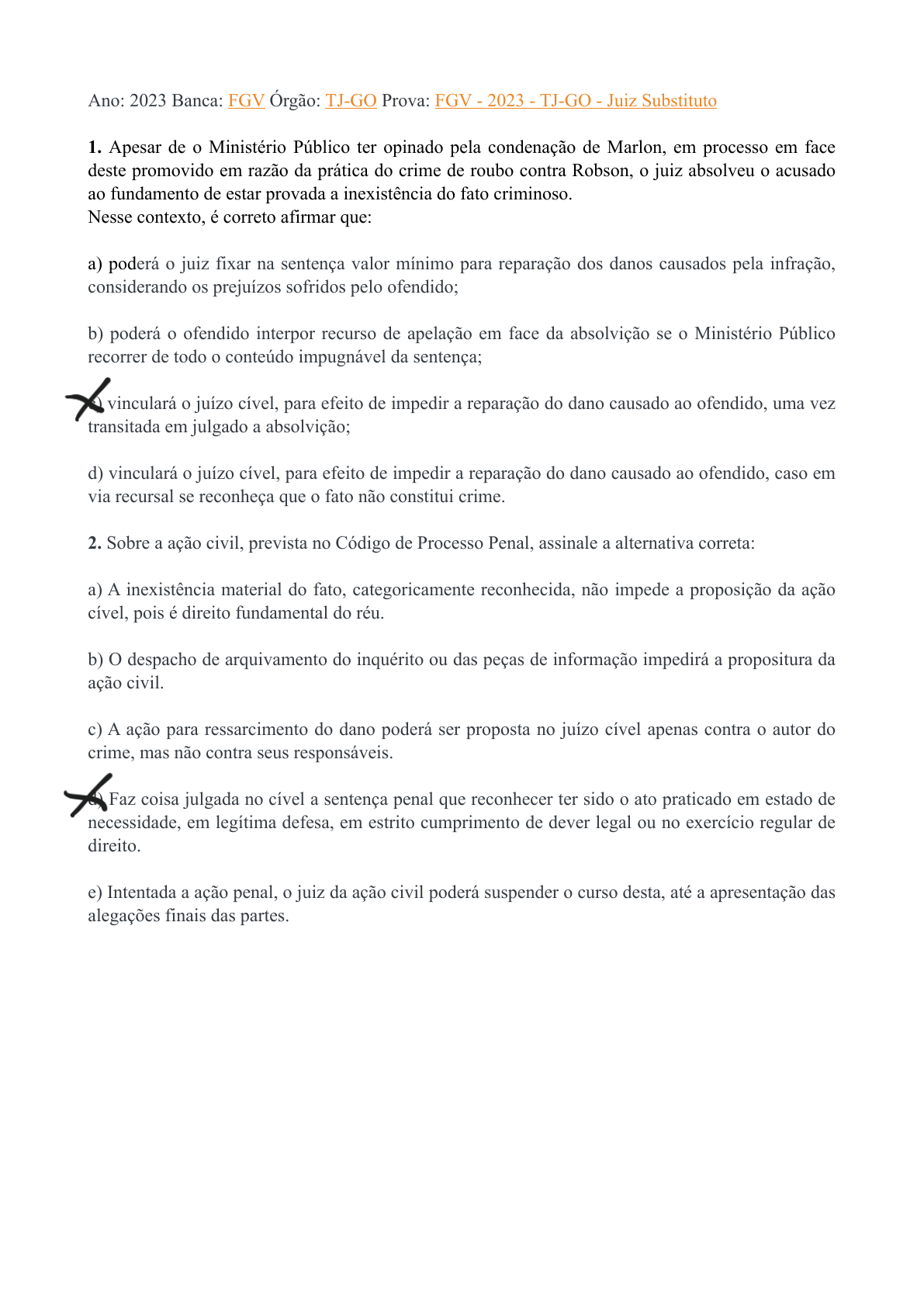 Ano: 2023 Banca: FGV Órgão: TJ-GO Prova: FGV - 2023 - TJ-GO - Juiz Substituto 1. Apesar de o Ministério Público ter opinado pela condenação de Marlon, em processo em face deste promovido em razão da prática do crime de roubo contra Robson, o juiz absolveu o acusado ao fundamento de estar provada a inexistência do fato criminoso. Nesse contexto, é correto afirmar que: a) poderá o juiz fixar na sentença valor mínimo para reparação dos danos causados pela infração, considerando os prejuízos sofridos pelo ofendido; b) poderá o ofendido interpor recurso de apelação em face da absolvição se o Ministério Público recorrer de todo o conteúdo impugnável da sentença; c) vinculará o juízo cível, para efeito de impedir a reparação do dano causado ao ofendido, uma vez transitada em julgado a absolvição; d) vinculará o juízo cível, para efeito de impedir a reparação do dano causado ao ofendido, caso em via recursal se reconheça que o fato não constitui crime. 2. Sobre a ação civil, prevista no Código de Processo Penal, assinale a alternativa correta: a) A inexistência material do fato, categoricamente reconhecida, não impede a proposição da ação cível, pois é direito fundamental do réu. b) O despacho de arquivamento do inquérito ou das peças de informação impedirá a propositura da ação civil. c) A ação para ressarcimento do dano poderá ser proposta no juízo cível apenas contra o autor do crime, mas não contra seus responsáveis. d) Faz coisa julgada no cível a sentença penal que reconhecer ter sido o ato praticado em estado de necessidade, em legítima defesa, em estrito cumprimento de dever legal ou no exercício regular de direito. e) Intentada a ação penal, o juiz da ação civil poderá suspender o curso desta, até a apresentação das alegações finais das partes. https://www.qconcursos.com/questoes-de-concursos/bancas/fgv https://www.qconcursos.com/questoes-de-concursos/institutos/tj-go https://www.qconcursos.com/questoes-de-concursos/provas/fgv-2023-tj-go-juiz-substituto 3. Ano: 2023 Banca: CESPE / CEBRASPE Órgão: AGU Prova: CESPE / CEBRASPE - 2023 - AGU - Procurador da Fazenda Nacional Com base no que dispõe o Código de Processo Penal (CPP) a respeito da ação civil, é correto afirmar que a PGFN está impedida de ajuizar ação cível de reparação de dano na hipótese de a) despacho de arquivamento do inquérito policial. b) decisão que julgue extinta a punibilidade. c) despacho de arquivamento das peças de informação. d) decisão absolutória que considere atípico o ato praticado. e) reconhecimento da inexistência material do fato. 4. Ano: 2023 Banca: CESPE / CEBRASPE Órgão: TJ-ES Prova: CESPE / CEBRASPE - 2023 - TJ- ES - Analista Judiciário - Especialidade: Direito No que se refere aos efeitos da sentença penal condenatória e absolutória, julgue o item subsequente. Impede a propositura de ação civil indenizatória a sentença penal que julgar extinta a punibilidade do réu. ( ) Certo ( ) Errado 5. Ano: 2023 Banca: CESPE / CEBRASPE Órgão: TJ-ES Prova: CESPE / CEBRASPE - 2023 - TJ- ES - Analista Judiciário - Especialidade: Direito No que se refere aos efeitos da sentença penal condenatória e absolutória, julgue o item subsequente. A decisão absolutória fundada no reconhecimento da inexistência material do fato exclui a propositura da respectiva ação civil. ( ) Certo ( ) Errado https://www.qconcursos.com/questoes-de-concursos/bancas/cespe-cebraspe https://www.qconcursos.com/questoes-de-concursos/institutos/agu https://www.qconcursos.com/questoes-de-concursos/provas/cespe-cebraspe-2023-agu-procurador-da-fazenda-nacional https://www.qconcursos.com/questoes-de-concursos/provas/cespe-cebraspe-2023-agu-procurador-da-fazenda-nacional https://www.qconcursos.com/questoes-de-concursos/bancas/cespe-cebraspe https://www.qconcursos.com/questoes-de-concursos/institutos/tj-es https://www.qconcursos.com/questoes-de-concursos/provas/cespe-cebraspe-2023-tj-es-analista-judiciario-especialidade-direito https://www.qconcursos.com/questoes-de-concursos/provas/cespe-cebraspe-2023-tj-es-analista-judiciario-especialidade-direito https://www.qconcursos.com/questoes-de-concursos/bancas/cespe-cebraspe https://www.qconcursos.com/questoes-de-concursos/institutos/tj-es https://www.qconcursos.com/questoes-de-concursos/provas/cespe-cebraspe-2023-tj-es-analista-judiciario-especialidade-direito https://www.qconcursos.com/questoes-de-concursos/provas/cespe-cebraspe-2023-tj-es-analista-judiciario-especialidade-direito Ano: 2023 Banca: FGV Órgão: TJ-PR Prova: FGV - 2023 - TJ-PR - Juiz Substituto 6. No tocante à determinação da competência para processar e julgar os feitos no processo penal, é correto afirmar que nos casos de: a) exclusiva ação privada, poderá o querelante preferir o foro de domicílio ou da residência do réu, ainda quando conhecido o lugar da infração; b) conexão, no concurso entre a jurisdição comum e a do juízo de menores, haverá unidade de processo e julgamento; c) conexão, no concurso de jurisdições da mesma categoria, preponderará a do lugar da infração, à qual for cominada a pena menos grave; d) infração continuada ou permanente, praticada em território de duas ou mais jurisdições, a competência será determinada pelo domicílio da vítima; e) conexão ou continência, no concurso entre a jurisdição comum e a militar, haverá unidade de processo e julgamento. Ano: 2023 Banca: OBJETIVA Órgão: Prefeitura de Sinimbu - RS Prova: OBJETIVA - 2023 - Prefeitura de Sinimbu - RS - Procurador Jurídico 7. J., Prefeito do Município X, localizado no Estado Alfa, estava em viagem oficial no Estado Beta quando solicitou, para si e diretamente, vantagem indevida, em razão da função, a F., um empresário com interesse em contratar com o Município X. F. é residente no Estado Gama e sua empresa tem matriz no Estado Delta. De acordo com a jurisprudência dos tribunais superiores, eve
