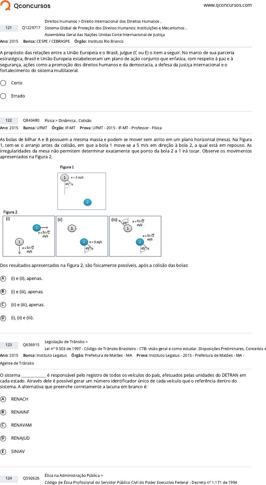 www.qconcursos.com Ano: 2015 Banca: CESPE / CEBRASPE Órgão: Instituto Rio Branco A propósito das relações entre a União Europeia e o Brasil, julgue (C ou E) o item a seguir. No marco de sua parceria estratégica, Brasil e União Europeia estabeleceram um plano de ação conjunto que enfatiza, com respeito à paz e à segurança, ações como a promoção dos direitos humanos e da democracia, a defesa da justiça internacional e o fortalecimento do sistema multilateral. Certo Errado Ano: 2015 Banca: UFMT Órgão: IF-MT As bolas de bilhar A e B possuem a mesma massa e podem se mover sem atrito em um plano horizontal (mesa). Na Figura 1, tem-se o arranjo antes da colisão, em que a bola 1 move-se a 5 m/s em direção à bola 2, a qual está em repouso. As irregularidades da mesa não permitem determinar exatamente que ponto da bola 2 a 1 irá tocar. Observe os movimentos apresentados na Figura 2. Dos resultados apresentados na Figura 2, são �sicamente possíveis, após a colisão das bolas: A (i) e (ii), apenas. B (i) e (iii), apenas. C (ii) e (iii), apenas. D (i), (ii) e (iii). Ano: 2015 Banca: Instituto Legatus Órgão: Prefeitura de Matões - MA O sistema _____________ é responsável pelo registro de todos os veículos do país, efetuados pelas unidades do DETRAN em cada estado. Através dele é possível gerar um número identi�cador único de cada veículo que o referência dentro do sistema. A alternativa que preenche corretamente a lacuna em branco é: A RENACH B RENAINF C RENAVAM D RENAJUD E SINIAV 121 Q1229717 >Direitos Humanos Direito Internacional dos Direitos Humanos , Sistema Global de Proteção dos Direitos Humanos: Instituições e Mecanismos , Assembleia Geral das Nações Unidas Corte Internacional de Justiça 122 Q843480 >Física Dinâmica , Colisão Prova: UFMT - 2015 - IF-MT - Professor - Física 123 Q656915 >Legislação de Trânsito Lei nº 9.503 de 1997 - Código de Trânsito Brasileiro - CTB: visão geral e como estudar. Disposições Preliminares, Conceitos e Prova: Instituto Legatus - 2015 - Prefeitura de Matões - MA - Agente de Trânsito 124 Q592626 >Ética na Administração Pública Código de Ética Pro�ssional do Servidor Público Civil do Poder Executivo Federal - Decreto nº 1.171 de 1994 https://www.qconcursos.com/ https://www.qconcursos.com/questoes-de-concursos/bancas/cespe-cebraspe https://www.qconcursos.com/questoes-de-concursos/institutos/instituto-rio-branco https://www.qconcursos.com/questoes-de-concursos/bancas/ufmt https://www.qconcursos.com/questoes-de-concursos/institutos/if-mt https://www.qconcursos.com/questoes-de-concursos/bancas/instituto-legatus https://www.qconcursos.com/questoes-de-concursos/institutos/prefeitura-de-matoes-ma https://www.qconcursos.com/questoes-de-concursos/questoes/db7bf0fe-10 https://www.qconcursos.com/questoes-de-concursos/disciplinas/direito-direitos-humanos https://www.qconcursos.com/questoes-de-concursos/disciplinas/direito-direitos-humanos/direito-internacional-dos-direitos-humanos https://www.qconcursos.com/questoes-de-concursos/disciplinas/direito-direitos-humanos/sistema-global-de-protecao-dos-direitos-humanos-instituicoes-e-mecanismos https://www.qconcursos.com/questoes-de-concursos/disciplinas/direito-direitos-humanos/assembleia-geral-das-nacoes-unidas https://www.qconcursos.com/questoes-de-concursos/disciplinas/direito-direitos-humanos/corte-internacional-de-justica https://www.qconcursos.com/questoes-de-concursos/questoes/2b0737c9-a9 https://www.qconcursos.com/questoes-de-concursos/disciplinas/fisica-fisica https://www.qconcursos.com/questoes-de-concursos/disciplinas/fisica-fisica/dinamica https://www.qconcursos.com/questoes-de-concursos/disciplinas/fisica-fisica/colisao https://www.qconcursos.com/questoes-de-concursos/provas/ufmt-2015-if-mt-professor-fisica https://www.qconcursos.com/questoes-de-concursos/questoes/a348f207-44 https://www.qconcursos.com/questoes-de-concursos/disciplinas/direito-legislacao-de-transito https://www.qconcursos.com/questoes-de-concursos/disciplinas/direito-legislacao-de-transito/lei-n-9-503-de-1997-codigo-de-transito-brasileiro-ctb-visao-geral-e-como-estudar-disposicoes-preliminares-conceitos-e-definicoes https://www.qconcursos.com/questoes-de-concursos/provas/instituto-legatus-2015-prefeitura-de-matoes-ma-agente-de-transito https://www.qconcursos.com/questoes-de-concursos/provas/instituto-legatus-2015-prefeitura-de-matoes-ma-agente-de-transito https://www.qconcursos.com/questoes-de-concursos/questoes/b4b724b8-b5 https://www.qconcursos.com/questoes-de-concursos/disciplinas/administracao-etica-na-administracao-publica https://www.qconcursos.com/questoes-de-concursos/disciplinas/administracao-etica-na-administracao-publica/codigo-de-etica-profissional-do-servidor-publico-civil-do-poder-executivo-federal-decreto-n-1-171-de-1994 Ano: 2015 Banca: CESPE / CEBRASPE Órgão: TJ-DFT Com referência às disposições inscritas no Código de Ética Pro�ssional do Serviço Público, julgue o próximo item. O registro sobre a conduta ética do servidor será fornecido pela comissão de ética aos organismos encarregados da execução do quadro de carreira, com o objetivo de instruir e fundamentar promoções. Certo Errado Ano: 2015 Banca: IESAP Órgão: EPT - Maricá Considere a gravura a seguir: Ciente que as cores utilizadas em sinalizações viárias são normatizadas pela Associação Brasileira de Normas Técnicas (ABNT), pode-se a�rmar que na demarcação de obstáculos transversais à pista como a lombada física apresentada acima, deve ser utilizada tinta apropriada na cor: A amarela B branca C azul D verde Ano: 2015 Banca: CESPE / CEBRASPE Órgão: Telebras A respeito de ética e de conceitos a ela relacionados, julgue o seguinte item. O pagamento de impostos pelo contribuinte demonstra comportamento ético no exercício da cidadania, uma vez que, mediante o cumprimento de suas obrigações tributárias, o cidadão colabora para o custeio das despesas comuns. Certo