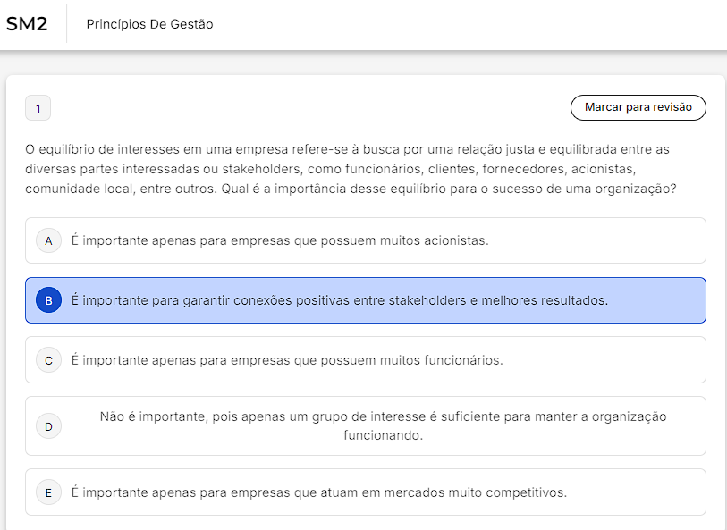 SM2 Princípios De Gestão 1 Marcar para revisão O equilíbrio de interesses em uma empresa refere-se à busca por uma relação justa e equilibrada entre as diversas partes interessadas ou stakeholders, como funcionários, clientes, fornecedores, acionistas, comunidade local, entre outros. Qual é a importância desse equilíbrio para sucesso de uma organização? A É importante apenas para empresas que possuem muitos B É importante para garantir conexões positivas entre stakeholders e melhores resultados. C É importante apenas para empresas que possuem muitos Não é importante, pois apenas um grupo de interesse é suficiente para manter a organização D E É importante apenas para empresas que atuam em mercados muito competitivos.