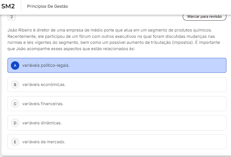 SM2 Princípios De Gestão 2 Marcar para revisão João Ribeiro é diretor de uma empresa de médio porte que atua em um segmento de produtos químicos. Recentemente, ele participou de um fórum com outros executivos no qual foram discutidas mudanças nas normas e leis vigentes do segmento, bem como um possível aumento de tributação (impostos). É importante que João acompanhe esses aspectos que estão relacionados às: A variáveis político-legais. B variáveis C variáveis D variáveis E variáveis de mercado.