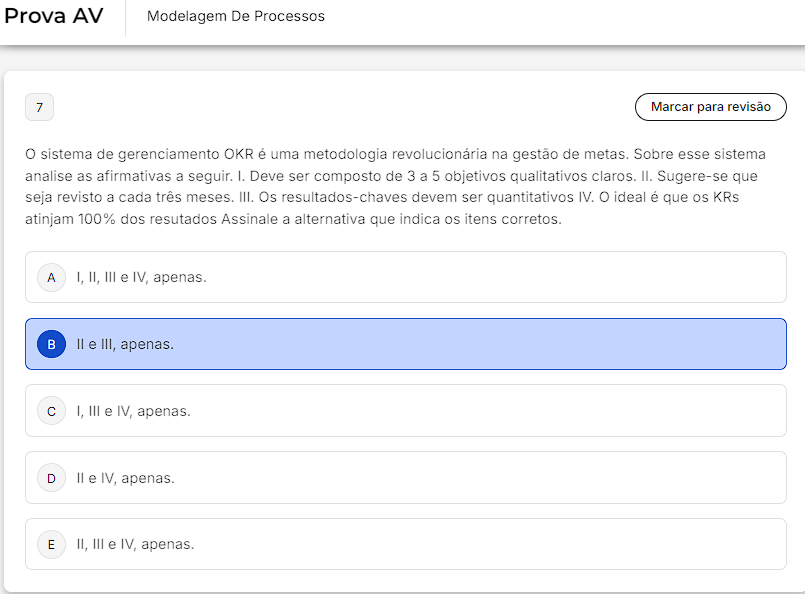 Prova AV Modelagem De Processos 7 Marcar para revisão O sistema de gerenciamento OKR é uma metodologia revolucionária na gestão de Sobre esse sistema analise as afirmativas a seguir. I. Deve ser composto de 3 a 5 objetivos qualitativos claros. II. Sugere-se que seja revisto a cada três meses. III. Os resultados-chaves devem ser quantitativos IV. ideal é que os KRs atinjam 100% dos resutados Assinale a alternativa que indica os itens corretos A I, II, III e IV, apenas. II e III, apenas. C I, III e IV, apenas. D II e IV, apenas. E II, III e IV, apenas.