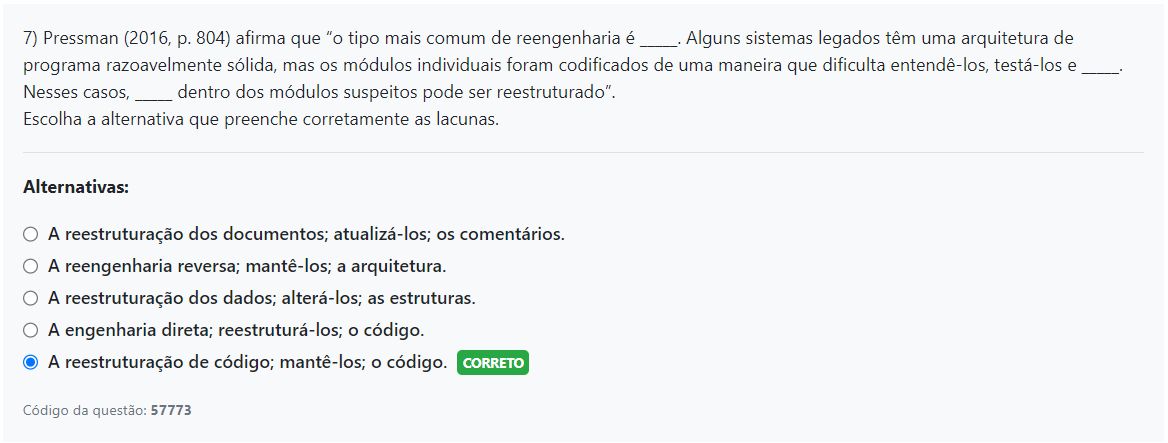 7) Pressman (2016, p. 804) afirma que "o tipo mais comum de reengenharia é Alguns sistemas legados têm uma arquitetura de programa razoavelmente sólida, mas os módulos individuais foram codificados de uma maneira que dificulta entendê-los, testá-los e Nesses casos, dentro dos módulos suspeitos pode ser reestruturado". Escolha a alternativa que preenche corretamente as lacunas. Alternativas: A reestruturação dos documentos; atualizá-los; os comentários. A reengenharia reversa; mantê-los; a arquitetura. A reestruturação dos dados; alterá-los; as estruturas. A engenharia direta; reestruturá-los; código. A reestruturação de código; mantê-los; o código. CORRETO Código da questão: 57773