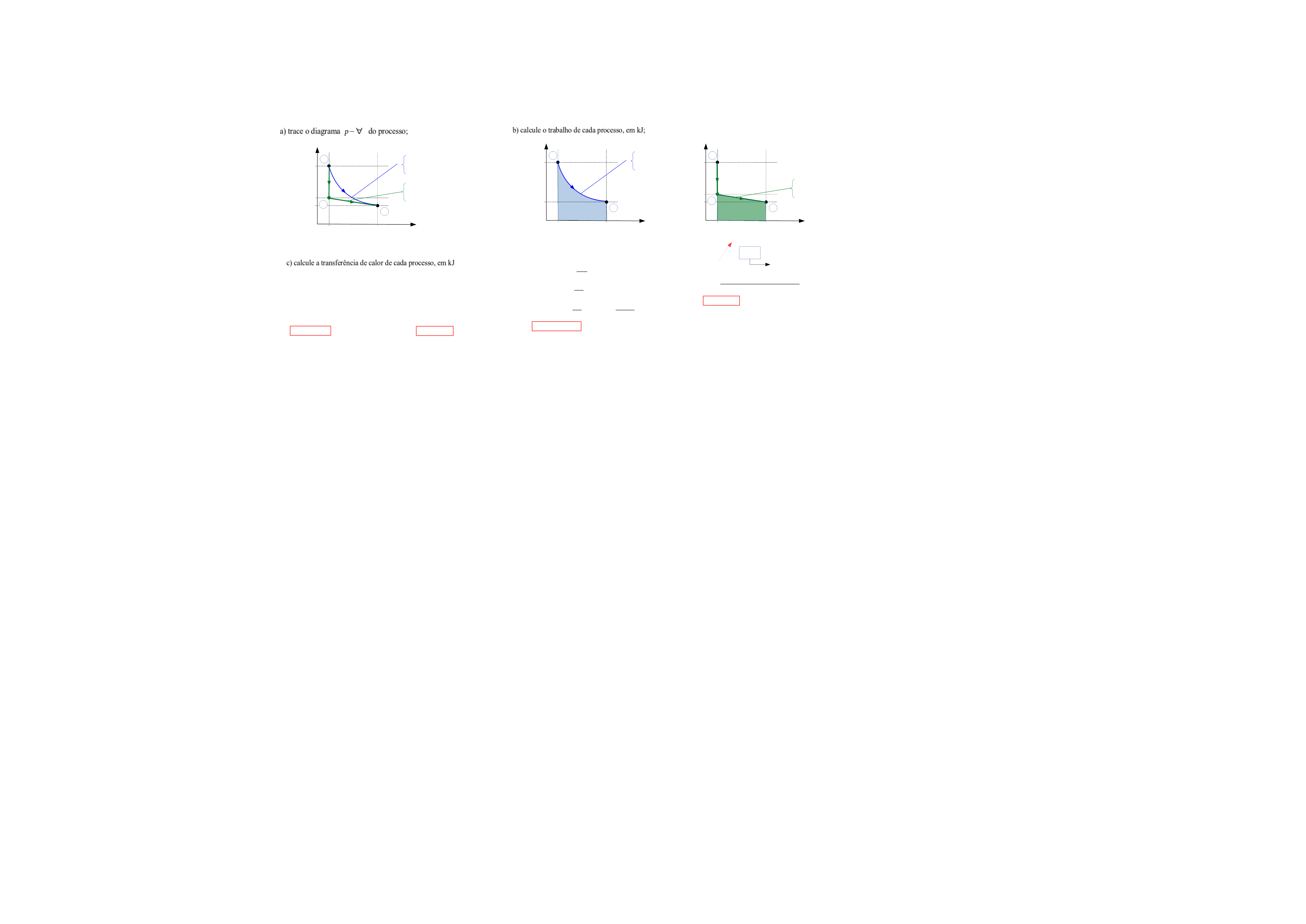 p (bar ) ∀ (m3 ) 1 0,1 1 10 1 2 Processo A p∀=const . 2 1' Processo B p (bar ) ∀ (m3 ) 1 0,1 1 10 1 2 Processo A p∀=const . p (bar ) ∀ (m3 ) 1 0,1 1 10 1 2 2 1' Processo B W A=∫∀1 ∀2 pd∀ W A=p1∀1∫∀1 ∀ 2 p∀ ∀ W A=p1∀1 ln ( ∀2 ∀1 ) W A=10×105 N m ² ×0,1m ³ ln ( 1m ³ 0,1m ³ ) W A=230,259 kJ W B=W 1−1 '+W 1'−2 0 Área abaixo da curva Expansão ( > 0) W B= (2+1)N /m ²×(0,9×105m ³) 2 W B=135 kJ ΔU A=Q A−W A QA=ΔU A+W A QA=(U 2−U 1)−W A QA=(200−400)kJ+230, 26kJ QA=30,26 kJ ΔU B=QB−W B QB=ΔU B+W B QB=(U 2−U 1)−W B Qb=(200−400)kJ+135 kJ QB=−65 kJ Moran e Shapiro – 6ª ed. - P2.57. Um gás contido num conjunto cilindro-pistão passa por dois processos, A e B, com os mesmos estados externos, 1 e 2, onde p1 = 10 bar, = 0,1 m³, U1 = 400 kJ e p2 = 1 bar, = 1 m³, U2 = 200 kJ: Processo A: processo de 1 até 2, durante o qual a relação pressão-volume é dada por = constante; Processo B: processo a volume constante do estado 1 até uma pressão de 2 bar, seguido por um processo pressão-volume linear até o estado 2. Os efeitos das energias cinética e potencial podem ser desprezados. Para cada um dos processos, dados por A e B: a) trace o diagrama do processo; b) calcule o trabalho de cada processo, em kJ; c) calcule a transferência de calor de cada processo, em kJ; Page 1