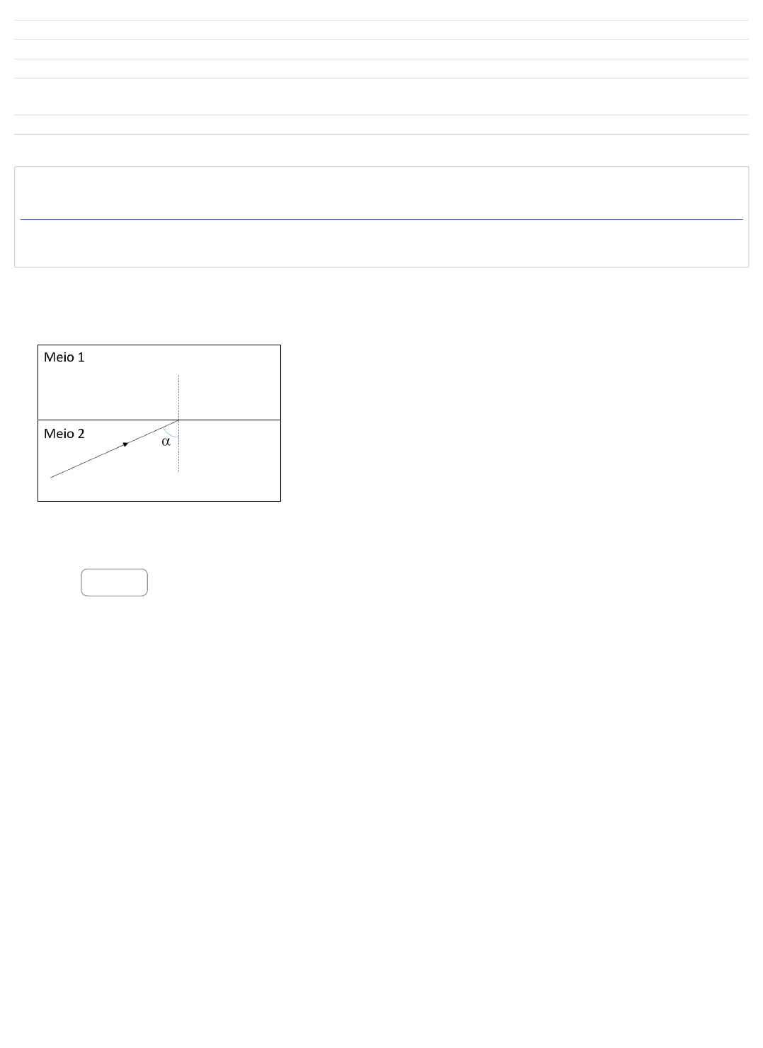 Iniciado em terça-feira, 27 fev. 2024, 18:51 Estado Finalizada Concluída em terça-feira, 27 fev. 2024, 19:34 Tempo empregado 42 minutos 55 segundos Notas 30,70/37,00 Avaliar 8,30 de um máximo de 10,00(82,97%) QUESTÃO 1 Correto Atingiu 2,00 de 2,00 Um raio de luz monocromático se propaga do meio 2 para o meio 1 com um ângulo de incidência de 62,3 graus como mostra a figura abaixo. O índice de refração do meio 1 é de 1,2 e o do meio 2 é de 1,43. Determine o ângulo de reflexão que o raio sofre ao incidir do meio 2 para o meio 1. Resposta: 62,3 ✓ A resposta correta é: 62,3 22/05/2024, 21:44 Questionário - Óptica (25% da AD1): Revisão da tentativa https://graduacao.cederj.edu.br/mod/quiz/review.php?attempt=26140&cmid=148120 1/19 QUESTÃO 2 Correto Atingiu 2,00 de 2,00 QUESTÃO 3 Correto Atingiu 2,00 de 2,00 QUESTÃO 4 Correto Atingiu 2,00 de 2,00 Um raio de luz monocromático se propaga do meio 2 para o meio 1 com um ângulo de incidência de 68,8 graus como mostra a figura abaixo. O índice de refração do meio 1 é de 1,2 e o do meio 2 é de 1,7. Determine o ângulo de refração que o raio sofre ao incidir do meio 2 para o meio 1. Apresente sua resposta com duas casas decimais. Caso não exista resposta para o ângulo de refração, insira "0"(sem as aspas) no campo de resposta. Resposta: 0 ✓ A resposta correta é: 0,00 Um raio de luz atinge um espelho com um ângulo de incidência igual a 62,6. O ângulo entre o raio incidente e o raio refletido é igual a: Resposta: 125,2 ✓ A resposta correta é: 125,2 Um raio de luz atinge um espelho com um ângulo de incidência igual a 56,7. O ângulo entre o raio refletido e a normal é igual a: Resposta: 56,7 ✓ A resposta correta é: 56,7 22/05/2024, 21:44 Questionário - Óptica (25% da AD1): Revisão da tentativa https://graduacao.cederj.edu.br/mod/quiz/review.php?attempt=26140&cmid=148120 2/19 QUESTÃO 5 Correto Atingiu 1,00 de 1,00 Um raio de luz incide num espelho como na figura abaixo. Selecione a letra associada à linha da figura que indica corretamente a direção do raio refletido. Escolha uma opção: a. 1 b. 3✓ c. 4 d. 2 Sua resposta está correta. A resposta correta é: 3 22/05/2024, 21:44 Questionário - Óptica (25% da AD1): Revisão da tentativa https://graduacao.cederj.edu.br/mod/quiz/review.php?attempt=26140&cmid=148120 3/19 QUESTÃO 6 Correto Atingiu 1,00 de 1,00 Um raio de luz incide num espelho como na figura abaixo. Selecione a letra associada à linha da figura que indica corretamente a direção da reta normal. Escolha uma opção: a. 2 b. 1✓ c. 4 d. 3 Sua resposta está correta. A resposta correta é: 1 22/05/2024, 21:44 Questionário - Óptica (25% da AD1): Revisão da tentativa https://graduacao.cederj.edu.br/mod/quiz/review.php?attempt=26140&cmid=148120 4/19 QUESTÃO 7 Correto Atingiu 1,00 de 1,00 A imagem de um alfinete em um espelho plano está sendo observada por dois estudantes localizados nos pontos A e B (como mostra a figura abaixo). O professor cobre o trecho CD do espelho com um pano negro. A partir dessa situação, marque as afirmativas corretas: Escolha uma opção: a. A imagem do alfinete desaparece apenas para o estudante B. O estudante A passa a vê-la menos luminosa. b. A imagem do alfinete desaparece apenas para o estudante A. O estudante B passa a vê-la menos luminosa. c. A imagem do alfinete desaparece apenas para o estudante A. Para o estudante B ela contina igual.✓ d. A imagem do alfinete desaparece apenas para o estudante B. Para o estudante A ela continua igual. e. A imagem do alfinete desaparece para os dois estudantes. Sua resposta está correta. A resposta correta é: A imagem do alfinete desaparece apenas para o estudante A. Para o estudante B ela contina igual. 22/05/2024, 21:44 Questionário - Óptica (25% da AD1): Revisão da tentativa https://graduacao.cederj.edu.br/mod/quiz/review.php?attempt=26140&cmid=148120 5/19 QUESTÃO 8 Correto Atingiu 1,00 de 1,00 Um raio de luz incide em um espelho esférico como mostrado na figura abaixo. Selecione a letra associada à linha da figura que indica corretamente a direção da reta normal. Escolha uma opção: a. 1✓ b. 3 c. 4 d. 2 Sua resposta está correta. A resposta correta é: 1 22/05/2024, 21:44 Questionário - Óptica (25% da AD1): Revisão da tentativa https://graduacao.cederj.edu.br/mod/quiz/review.php?attempt=26140&cmid=148120 6/19 QUESTÃO 9 Correto Atingiu 1,00 de 1,00 Um raio de luz incide em um espelho esférico como mostrado na figura abaixo. Selecione a letra associada à linha da figura que indica corretamente a direção do raio refletido. Escolha uma opção: a. 3✓ b. 1 c. 2 d. 4 22/05/2024, 21:44 Questionário - Óptica (25% da AD1): Revisão da tentativa https://graduacao.cederj.edu.br/mod/quiz/review.php?attempt=26140&cmid=148120 7/19 QUESTÃO 10 Correto Atingiu 1,00 de 1,00 Sua resposta está correta. A resposta correta é: 3 Na figura abaixo se observa 2 raios de luz emitidos pela fonte L que está situada dentro do meio 2. A linha pontilhada representa a normal a cada superfície. De acordo com as leis da reflexão e da refração, quais os ângulos que devem ser iguais? Escolha uma opção: a. e ✓ b. e c. e d. e Sua resposta está correta. A resposta correta é: e 22/05/2024, 21:44 Questionário - Óptica (25% da AD1): Revisão da tentativa https://graduacao.cederj.edu.br/mod/quiz/review.php?attempt=26140&cmid=148120 8/19 https://graduacao.cederj.edu.br/filter/tex/displaytex.php?texexp=%5Calpha https://graduacao.cederj.edu.br/filter/tex/displaytex.php?texexp=%5Calpha https://graduacao.cederj.edu.br/filter/tex/displaytex.php?texexp=%5Cbeta https://graduacao.cederj.edu.br/filter/tex/displaytex.php?texexp=%5Cbeta https://graduacao.cederj.edu.br/filter/tex/displaytex.php?texexp=%5Cgamma https://graduacao.cederj.edu.br/filter/tex/displaytex.php?texexp=%5Cgamma https://graduacao.cederj.edu.br/filter/tex/displaytex.php?texexp=%5Cdelta https://graduacao.cederj.edu.br/filter/tex/displaytex.php?te
