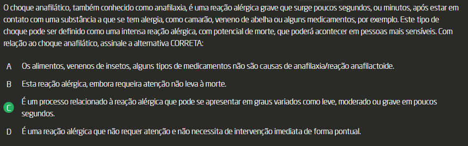 0 choque anafilático, também conhecido como anafilaxia, é uma reação alérgica grave que surge poucos segundos, ou minutos, após estar em contato com uma substância a que se tem alergia, como camarão, veneno de abelha ou alguns medicamentos, por exemplo. Este tipo de choque pode ser definido como uma intensa reação alérgica, com potencial de morte, que poderá acontecer em pessoas mais sensíveis. Com relação ao choque anafilático, assinale a alternativa CORRETA: A Os alimentos, venenos de insetos, alguns tipos de medicamentos não são causas de anafilaxia/reação anafilactoide. B Esta reação alérgica, embora requeira atenção não leva à morte. É um processo relacionado à reação alérgica que pode se apresentar em graus variados como leve, moderado ou grave em poucos segundos. D É uma reação alérgica que não requer atenção e não necessita de intervenção imediata de forma pontual.