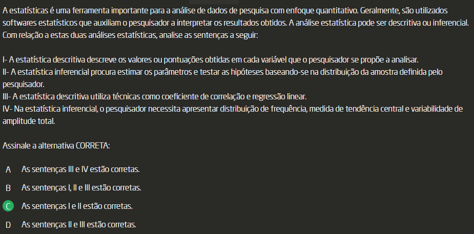 A estatísticas é uma ferramenta importante para a análise de dados de pesquisa com enfoque quantitativo. Geralmente, são utilizados softwares estatísticos que auxiliam pesquisador a interpretar os resultados obtidos. A análise estatística pode ser descritiva ou inferencial. Com relação a estas duas análises estatísticas, analise as sentenças a seguir: A estatística descritiva descreve os valores ou pontuações obtidas em cada variável que pesquisador se propõe a analisar. II- A estatística inferencial procura estimar parâmetros e testar as hipóteses baseando-se na distribuição da amostra definida pelo pesquisador. III- A estatística descritiva utiliza técnicas como coeficiente de correlação e regressão IV- Na estatística inferencial, pesquisador necessita apresentar distribuição de frequência, medida de tendência central e variabilidade de amplitude total. Assinale a alternativa CORRETA: A As sentenças III e IV estão corretas. B As sentenças I, II e III estão corretas. As sentenças I e II estão corretas. D As sentenças e III estão corretas.