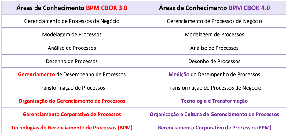 Áreas de Conhecimento BPM CBOK 3.0 Áreas de Conhecimento BPM CBOK 4.0 Gerenciamento de Processos de Negócio Gerenciamento de Processos de Negócio Modelagem de Processos Modelagem de Processos Análise de Processos Análise de Processos Desenho de Processos Desenho de Processos Gerenciamento de Desempenho de Processos Medição do Desempenho de Processos Transformação de Processos Transformação de Processos de Negócio Organização do Gerenciamento de Processos Tecnologia e Transformação Gerenciamento Corporativo de Processos Organização e Cultura de Gerenciamento de Processos Tecnologias de Gerenciamento de Processos (BPM) Gerenciamento Corporativo de Processos (EPM)