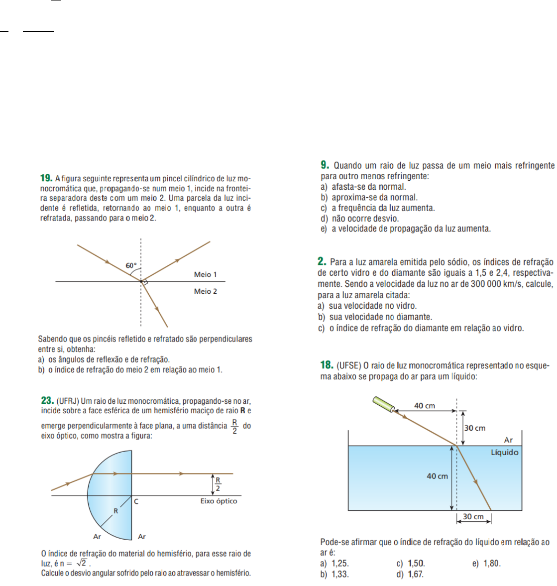 Mon.Al. 2001 Santos Moraes Exercícios refração FÓRMULAS: 𝑛1 ⋅ 𝑠𝑒𝑛(θ1) = 𝑛2 ⋅ 𝑠𝑒𝑛(θ2) -> Fórmula geral da refração 𝑠𝑒𝑛(θ𝐿) = 𝑛2 𝑛1 -> Ângulo limite da refração 𝑑′ 𝑑 = 𝑛𝑑𝑒𝑠𝑡𝑖𝑛𝑜 𝑛𝑜𝑟𝑖𝑔𝑒𝑚 -> Distância aparente de um objeto em outro meio 𝛿 = θ1 + θ2 − 𝐴 -> Desvio em um prisma de ângulo de abertura A, ângulo de incidência θ1 e ângulo de emergência θ2 1- 2- 3- 4- 5- 6- 7- 8- 9- 10- 11- 12- 13- 14- 15- 16- 17- 18- 19- 20- GABARITO 1- 2- 3- 4- 5- 6- 7- 8- 9- 10- 11- 12- 13- 14- 15- 16- 17- 18- 19- 20- Lentes esféricas Fórmulas: 1 𝑓 = 1 𝑝 + 1 𝑝′ -> f > 0 para lentes convergentes / f < 0 para lentes divergentes p > 0 para objetos reais / p < 0 para objetos virtuais p’ > 0 para imagens reais / p’ < 0 para imagens virtuais 𝐴 = 𝑖 𝑜 = − 𝑝′ 𝑝 = 𝑓 𝑓−𝑝 -> Fórmula do aumento linear transversal 𝑉 = 1 𝑓 -> Vergência de uma lente 𝑉 = ( 𝑛𝑙𝑒𝑛𝑡𝑒 𝑛𝑚𝑒𝑖𝑜 − 1) ( 1 𝑅1 + 1 𝑅2 ) -> Equação dos fabricantes de lentes R > 0 para uma lente convexa / R < 0 para uma lente côncava 𝑛1 𝑝 + 𝑛2 𝑝′ = 𝑛2−𝑛1 𝑅 -> Equação do dioptro esférico R > 0 para uma lente convexa / R < 0 para uma lente côncava 𝑉 = 𝑉1 + 𝑉2 +⋯+ 𝑉𝑛 -> Vergência de uma associação de lentes justapostas 1- 2- 3- 4- 5- 6- 7- 8- 9- 10- 11- 12- 13- 14- 15- GABARITO 1- 2- 3- 4- 5- 6- 7- 8- 9- 10- 11- 12- 13- 14- 15- Instrumentos ópticos Fórmula útil: 𝐴 = 𝐴𝑂𝐵 ⋅ 𝐴𝑂𝐶 - > Para um microscópio, o aumento total da imagem é o produto do aumento da lente objetiva pelo aumento da lente ocular Microscópio 1- 2- 3- 4- Ótica da visão 5- 6- 7- GABARITO 1- 2- 3- 4- 5- 6- D 7-