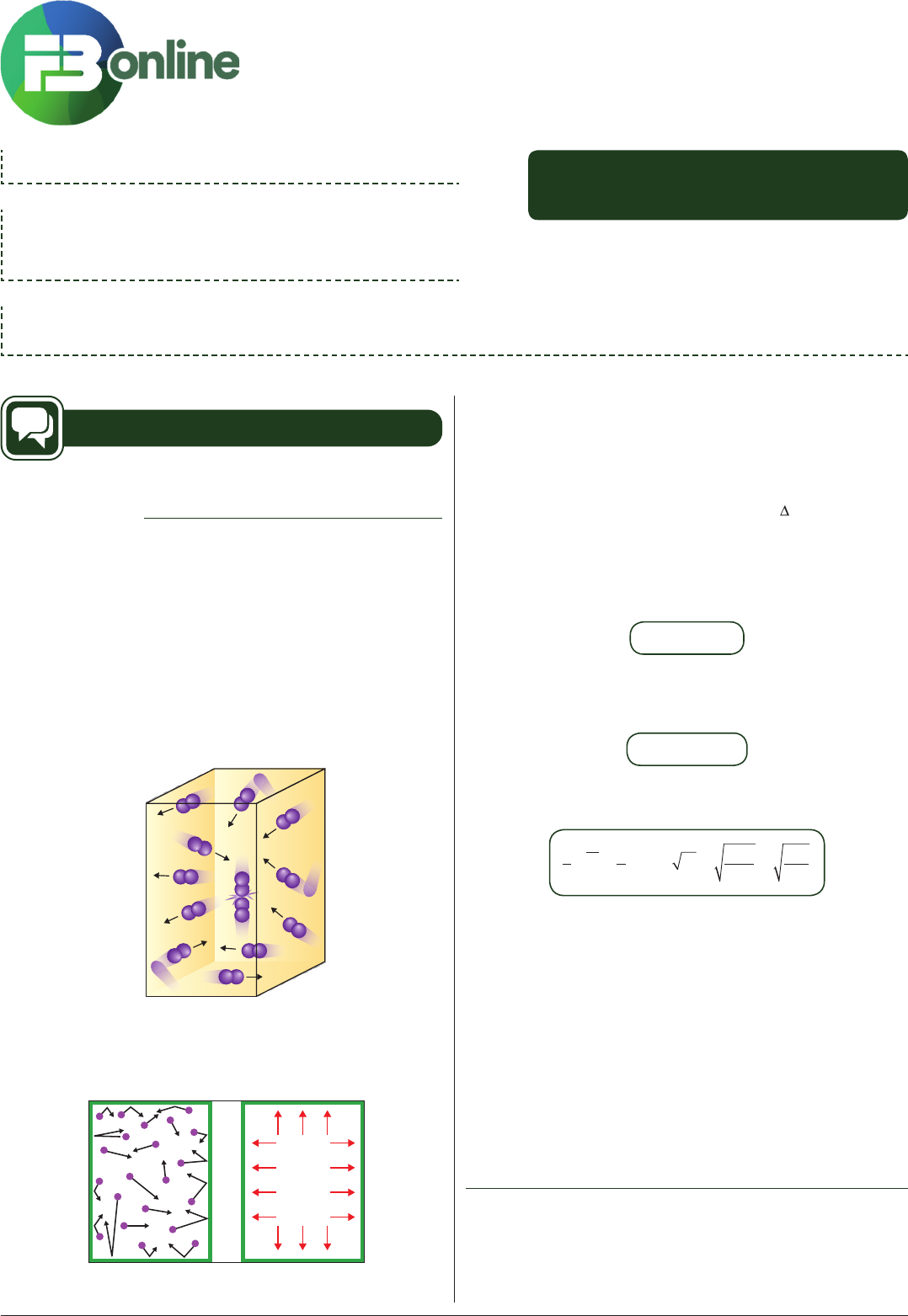 CIÊNCIAS DA NATUREZA E SUAS TECNOLOGIAS F B O N L I N E . C O M . B R ////////////////// Professor(a): João Victor assunto: teoria cinética dos Gases frente: Química iii OSG.: 118627/17 AULA 06 EAD – MEDICINA Resumo Teórico Teoria cinética dos gases Os estados de agregação da matéria (sólido, líquido e gasoso) podem ser diferenciados observando seus volumes e suas formas. Por exemplo, os sólidos têm forma e volume definidos. Os líquidos têm volume definido, mas a forma deles varia de acordo com o sistema que o armazena. Já os gases possuem forma e volume variáveis. A partir das observações acerca das propriedades dos gases, e com o objetivo de entender o comportamento dos mesmos, criou-se a teoria cinética dos gases. Os postulados que explicam a teoria cinética dos gases são: 1º) Os gases são formados por partículas (moléculas ou átomos) que se encontram em movimento desordenado e permanente, o que faz com que elas colidam entre si e com as paredes dos recipientes. Figura 01 – movimento desordenado e permanente das moléculas de um gás. 2º) As colisões das partículas dos gases com as paredes do sistema têm como consequência a pressão do gás. P Figura 02 – pressão exercida pelas colisões das partículas gasosas com as paredes do sistema. 3º) As partículas gasosas são infinitamente pequenas se comparadas com os espaços vazios que existem entre elas. Portanto, podemos dizer que os gases são constituídos, em sua grande totalidade, por espaços vazios. 4º) As colisões entre as partículas gasosas e as paredes do recipiente que as contém, são perfeitamente elásticas ( E total = 0), ou seja, ocorrem sem perda de energia cinética total. 5º) A energia cinética translacional média (Ec) para cada molécula é diretamente proporcional à temperatura absoluta (T). Obs.: a temperatura em Kelvin. Ec = 3/2 · K · T Onde K é a constante de Boltzmann que vale 1,38·10-23 j/K. A energia cinética é proporcional ao quadrado da velocidade: Ec = 1/2 · m · v2 Portanto, a velocidade quadrática média por molécula pode ser calculada em função da temperatura do gás: 1 2 3 2 3 32 2mv k T v k T m RT M B B= ⇒ = = Onde M é a massa molecular em kg/mol. Gases que obedecem aos postulados são classificados como gases ideais ou gases perfeitos. Já os gases que fogem ao modelo, são chamados de gases reais. Portanto, percebemos que as duas características que nos ajudam a diferenciar um gás ideal de um gás real são: • A ausência de forças intermoleculares nos gases ideais; • O tamanho desprezível das partículas dos gases ideais. Porém, é importante salientar que um gás só apresenta tal comportamento se estiver expandido e, para isso, precisa estar a baixas pressões e elevadas temperaturas. Variáveis de estado para um gás O comportamento das partículas de um gás se caracteriza quando conhecemos o volume ocupado pelo gás e as condições exatas de temperatura e pressão em que ele se encontra. Logo, podemos dizer que tais grandezas caracterizam o estado de um gás, por isso, são denominadas variáveis de estado. 2F B O N L I N E . C O M . B R ////////////////// Módulo de estudo OSG.: 118627/17 Volume Medido no sistema internacional (SI) em m3. Outros tipos de unidades: decímetro cúbico (dm3), centímetro cúbico (cm3), mililitro (mL), litro (L). Pressão É o resultado das colisões das partículas gasosas contra as paredes do recipiente onde está armazenado. Como já vimos, tais colisões ocorrem sem variação da energia total. Medido no sistema internacional (SI) em newton/m2 (N/m2) ou em pascal (Pa). Temperatura É diretamente proporcional à energia cinética média das partículas que constituem o gás, portanto, podemos dizer, que a temperatura é a medida do grau de agitação das partículas gasosas. Medido no sistema internacional (SI) em Kelvin (K). Outra unidade bem comum é o grau Celsius (°C). T (K) = T (OC) + 273,15 Transformações gasosas Vimos que, o estado de um gás é determinado quando sabemos os valores exatos de seu volume, de sua pressão e de sua temperatura. Quando ocorre alteração em pelo menos uma dessas grandezas, dizemos que o gás sofreu uma transformação que chamamos de transformação gasosa. Transformação isotérmica (Lei de Boyle-Mariotte) Em sistema fechado onde a temperatura é mantida constante, observa-se que determinada massa de gás ocupa volume inversamente proporcional à sua pressão. Dizemos que: P × V = k (onde k é uma constante de proporcionalidade) Logo: P i × V i = P f × V f p (atm) isoterma 10,0 5,0 1 2 2,0 V 2 V (litros) Figura 03 – Sistema isotérmico. Transformação isobárica (Lei de Charles e Gay-Lussac) Em um sistema mantido à pressão constante, o volume ocupado por uma determinada massa de gás é diretamente proporcional à sua temperatura absoluta. Dizemos que: V T k= Onde k é uma constante de proporcionalidade. Logo: V T V T i i f f = V V 2 V 1 T 1 T 2 T K 0 Figura 04 – Sistema isobárico. Transformação isocórica (Lei de Charles) Mantendo-se o volume constante, a pressão que a massa fixa de um gás exerce é diretamente proporcional à temperatura absoluta. Pode ser chamado de transformação isovolumétrica ou isométrica. Dizemos que: P T k= Onde k é uma constante de proporcionalidade. Logo: P T P T i i f f = 4 V (L) T (K) 2 1 100 200 400 Figura 05 – Sistema isocórico. Equação geral dos gases Unindo as três leis vistas (Boyle-Mariotte, Lei de Charles e Gay-Lussac e Lei de Charles), encontramos, para uma massa fixa de gás, uma relação geral. P V T k × = Portanto: P V T P V T 1 1 1 2 2 2 × = × 3 F B O N L I N E . C O M . B R ////////////////// OSG.: 118627/17 Módulo de estudo Exercícios 01. (Fuvest/2014) O rótulo de uma lata de desodorante em aerossol apresenta, entre outras, as seguintes informações: “Propelente: gás butano. Mantenha longe do fogo”. A principal razão dessa advertência é: A) O aumento da temperatura fa