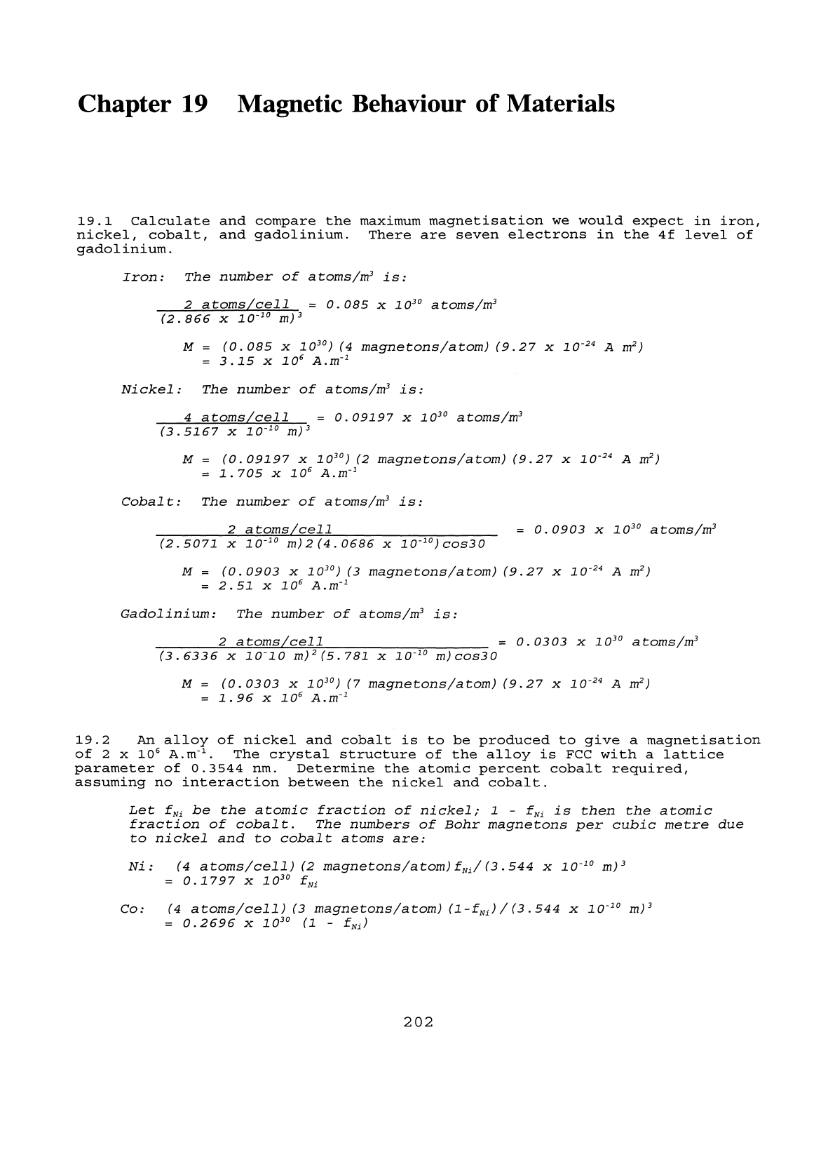 Chapter 19 Magnetic Behaviour of Materials 19.1 Calculate and compare the maximum magnetisation we would expect in iron, nickel, cobalt, and gadolinium. There are seven electrons in the 4f level of gadolinium. Iron: The number of atoms/m3 is: 2 atoms/cell = 0.085 X 1030 atoms/m3 (2.866 x 10-10 m)3 M (0.085 x 1030 ) (4 magnetons/atom) (9.27 x 10-24 A m2) 3.15 x 106 A.m- 1 Nickel: The number of atoms/m3 is: 4 atoms/cell = 0.09197 x 1030 atoms/m3 (3.5167 x 10-10 m)3 M (0.09197 x 1030 ) (2 magnetons/atom) (9.27 x 10-24 A m2) 1.705 x 106 A.m-1 Cobalt: The number of atoms/m3 is: 2 atoms/cell 0.0903 X 1030 atoms/m3 (2.5071 x 10 10 m)2(4.0686 x 10-10)cos30 M (0.0903 x 1030 ) (3 magnetons/atom) (9.27 x 10-24 A m2) 2.51 x 10 6 A.m- 1 Gadolinium: The number of atoms/m3 is: 2 atoms/cell 0.0303 x 1030 atoms/m3 (3.6336 x 10-10 m)2(5.781 x 10-10 m)cos30 M (0.0303 x 1030 ) (7 magnetons/atom) (9.27 x 10-24 A m2) 1.96 x 106 A.m- 1 19.2 An alloy of nickel and cobalt is to be produced to give a magnetisation of 2 x 106 A.m-l. The crystal structure of the alloy is FCC with a lattice parameter of 0.3544 nm. Determine the atomic percent cobalt required, assuming no interaction between the nickel and cobalt. Let fNi be the atomic fraction of nickel,' 1 - fNi is then the atomic fraction of cobalt. The numbers of Bohr magnetons per cubic metre due to nickel and to cobalt atoms are: Ni: (4 atoms/cell) (2 magnetons/atom)fNj(3.544 x 10-10 m)3 = 0.1797 x 1030 fNi Co: (4 atoms/cell) (3 magnetons/atom) (1-fNi )/(3.544 x 10-10 m)3 = 0.2696 X 1030 (1 - f Ni ) 202 D. R. Askeland, The Science and Engineering of Materials © Springer Science+Business Media Dordrecht 1996 The magnetisation, M, is given by: M [(0.1797 X 103°)fNi + (0.2696 x 1030 ) (l-fNi )) (9.27 x 10-24 ) M -833373 fNi + 2499192 2 x 106 fNi = 0.60 feo = 0.40 19.3 Estimate the magnetisation that might be produced in an alloy containing nickel and 70 at% copper, assuming that no interaction occurs. We can estimate the lattice parameter of the alloy from those of the pure nickel and copper and their atomic fractions: a o = ( 0 . 3) (0. 3 2 94 ) + ( 0 . 7) (0. 3 6 151 ) = O. 3 519 nm If the copper does not provide magnetic moments that influence magnetisation, then M = (4 atoms/cell) (0.3 fraction Ni) (2 maqnetons/Ni atom) (9.27 x 10-24 ) (3.519 x 10-10 m)3 M 5. lOx 105 A. m- 1 19.4 An Fe-80% Ni alloy has a an inductance of 0.35 tesla is coil that is 20 mm in length. coil to obtain this field? maximum relative permeability of 300,000 when obtained. The alloy is placed in a 20 turn What current must flow through the conductor Magnetic permeability ~ but, Then, B H I ~r~O 300000 X 4rr x 10- 7 = 0.377 T.m.A- 1 • ~H (0.35T) / (0.377 T.m.A- 1 ) = 0.928 A.m.- 1 HI/n (0.928 A.m- 1 ) (20 x 10-3 m) / (20 turns) 0.00093A 19.5 An Fe-49% Ni alloy has a maximum permeability of 64,000 when a magnetic field of 10 A.m- 1 is applied. What inductance is obtained and what current is needed to obtain this inductance in a 200 turn, 30 mm long coil? ~ B I ~rf.1.0 = 64,000 X 4rr x 10- 7 = 0.0804 T.m.A- 1 f.1.H = (0.0804 T.m.K 1 ) (10 A.m- 1 ) = 0.804 T Hi/n = (10 A.m-1 ) (30 x 10-3m) / (200 turns) 1.5 mA 19.6 The following data describe the effect of the magnetic field on the inductance in a silicon steel. Calculate (a) the initial permeability and (b) the maximum permeability for the material. 1.4 H (A.m- 1 ) B (T) 0 0 20 0.08 40 0.3 60 0.65 80 0.85 100 0.95 150 1.10 250 1.25 203 1.2 E I III f 0.8 _ 0.6 ~ ] 0.4 0.2 50 100 150 200 250 M.gnetic fodd. H (Aim) The data is plotted; from the graph, the initial and maximum permeability are calculated from the slopes of the plots: (a) initial permeability 0.003 T.m.K 1 (b) maximum permeability 0.011 T.m.K 1 19.7 A magnetic material has a coercive field of 167 A.m- 1 , a saturation magnetixation of 0.616 tesla, and a residual inductance of '0.3 tesla. Sketch the hysteresis loop for the material. 0.616 T 0.6 B(T) Br 0.3 T -600 400 600 H(Alm) -0.6 19.8 A magnetic material has a coercive field of 10.74 A.m- 1 , a saturation magnetization of 2.158 tesla, and a remanence induction of 1.183 tesla. Sketch the hysteresis loop for the material. Msat = 2.158 T B(T) Br 1.183 T -20 -10 10 20 H(Alm) -2 19.9 Using Figure 19.16, determine the following properties of the magnetic material. a. remanence d. initial permeability b. saturation magnetisation e. maximum permeability c. coercive field f. power (maximum BH product) (a) remanence = 1.3 T (b) saturation magnetisation = 1.4 T (c) coercive field = 63500 A.m-1 (d) initial permeability 0.7 T / 100000 A.m-1 = 7 x 10- 6 T.m.Kl (e) maximum permeability 1.4 T / 75000 A.m-1 = 1.9 X 10- 5 T.m.A- 1 204 (f) we can try several BH products in the 4th quadrant: 1.2 T x 35800 1.0 T x 54600 0.8 T x 57600 42960 T.A.m-l 54600 T.A.m-l 46080 T.A.m-l The maximum BH product, or power, is about 54600 T.A.m- 1 • 19.10 Using Figure 19.17, determine the following properties of the magnetic material. a. remanence d. initial permeability b. saturation magnetisation e. maximum permeability c. coercive field f. power (maximum BH product) (a) remanence = 0.55 T (b) saturation magnetisation = 0.58 T (c) coercive field = 44,000 A.m-1 (d) initial permeability 0.2 T / (50000 A.m-1 ) 4 x 10-6 T.m.A- 1 (e) maximum permeability 0.5 T / (35000 A.m-1 ) 1.4 x 10-5 T.m.A- 1 (f) we can try several BH products in the 4th quadrant: 0.45 T x 23000 A.m- 1 10350 T.A.m-l 0.40 T x 32800 A.m-1 13120 T.A.m-l 0.35 T x 36100 A.m-1 12635 T.A.m- 1 0.30 T x 38975 A.m-1 11692 T.A.m- 1 The maximum BH product, or power, is about 13120 T.A.m-l. 19.11 Estimate the power of the CosCe material shown in Figure 19.14. H B BH 0 A.m-1 0.75 T 0 T.A.m- 1 200000 A.m- 1 0.65 T 130000 T.A.m- 1 225000 A.m-1 0.45 T 101250 T.A.m- 1 250000 A.m-1 0 T 0 T.A.m- 1 19.12 Why are eddy current losses important design factors in ferromagnetic materials but less important in ferrimagnetic materials? The ferrimagnetic materials are ceramics, which have a very low elec trical conduct