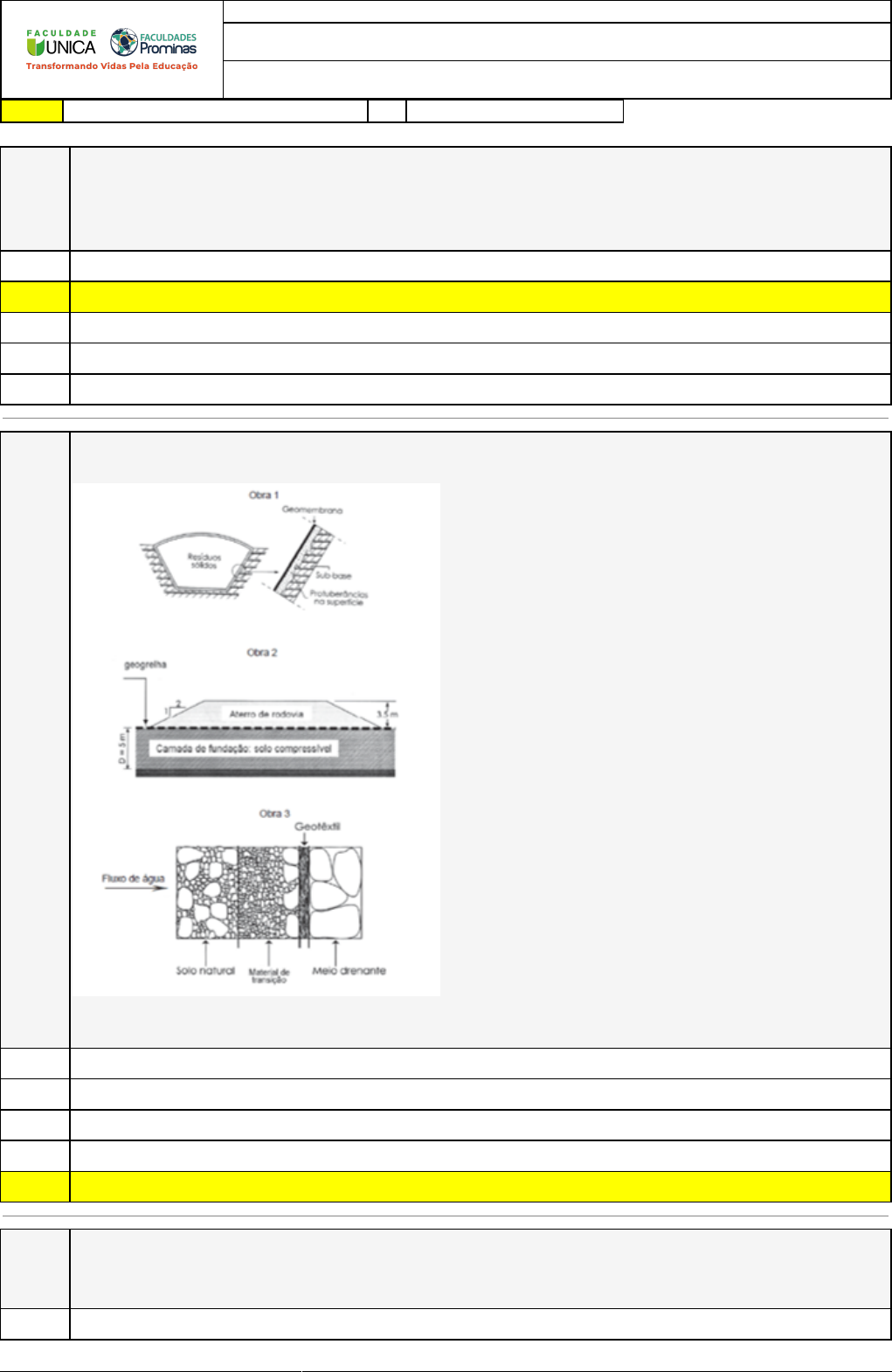 08/06/2022 16:19:08 1/3 REVISÃO DE SIMULADO Nome: TIAGO PETRI Disciplina: Mecânica dos Solos Respostas corretas são marcadas em amarelo X Respostas marcardas por você. Questão 001 Produto industrializado formado pela superposição ou associação de um ou mais geossintéticos entre si ou com outros produtos, podendo ser usado de acordo com os objetivos de determinada obra de terra. O trecho anterior retrata o produto geossintético chamado de: A) Geomembrana (GM). X B) Geocomposto (GC). C) Geotêxtil (GT). D) Geogrelhas (GG). E) Georrede (GN). Questão 002 (CESGRANRIO/2012) A figura a seguir apresenta diferentes utilizações de geossintéticos em 3 obras geotécnicas. Nas obras I, II e III, os geossintéticos assinalados têm, respectivamente, as seguintes funções principais: A) Contenção, filtragem e reforço. B) Filtragem, reforço e contenção. X C) Reforço, contenção e filtragem. D) Reforço, filtragem e contenção. E) Contenção, reforço e filtragem. Questão 003 Os geossintéticos são produtos _____ ou _____ que podem ser usados em obras de terras com diferentes _____, mas tendo como princípio básico _____ os _____, em termos físicos. Assinale a alternativa que preenche corretamente as lacunas. A) simples, artificiais, finalidade, manter, solos 08/06/2022 16:19:08 2/3 B) naturais, complexos, objetivos, respeitar, materiais C) naturais, simples, aplicações, melhorar, problemas D) simples, complexos, aplicações, manter, materiais X E) naturais, artificiais, objetivos, melhorar, solos Questão 004 (NCE-UFRJ/2007) Geossintéticos são materiais para uso em: I.Reforço de solos e filtração. II.Drenagem, separação de materiais e proteção mecânica. III.Adensamento de solos, restauração de pavimentos, erosão e impermeabilização. Assinale a alternativa correta: A) Apenas as afirmações I e III são verdadeiras. B) As afirmações I, II e III são verdadeiras. C) Apenas a afirmação III é verdadeira. D) Apenas as afirmações II e III são verdadeiras. X E) Apenas as afirmações I e II são verdadeiras. Questão 005 Geossintéticos são utilizados para exercer muitas funções em instalações de tratamento de resíduos sólidos e líquidos. Há um uso maior em lagoas de estabilização anaeróbias e aeróbias, aterros sanitários para compor barreiras contrafluxos de base e na cobertura, além de melhorar a evaporação de resíduos líquidos e desidratação de lodo por meio de geossintéticos permeáveis. Cada tipo de geossintético apresenta características e propriedades que vão se adequar à sua função. Em se tratando de uso de geossintéticos em resíduos, pode se afirmar que as principais funções do(s)(a)(s): A) Georredes são separação, impermeabilização, proteção mecânica e reforço. B) Geotêxtil são proteção e reforço, separação, filtração e drenagem. X C) Geomembrana são filtração e drenagem. D) Geocomposto são reforço e separação. E) Geotubo são proteção mecânica, reforço, separação e impermeabilização. Questão 006 Os produtos geossintéticos são utilizados em uma grande variedade de problemas geotécnicos, como por exemplo reforço para estrutura de contenção. Julgue os itens abaixo a respeito dos geossintéticos. ( ) Os geossintéticos não devem ser utilizados para taludes íngremes ou para aterros sobre solos moles. ( ) Os geossintéticos podem ser utilizados na estabilização de solos, drenagem e filtração, barreiras para fluidos e gases. ( ) Os geossintéticos podem ser utilizados no controle de erosão, barreira de sedimentos e proteção ambiental. Assinale a alternativa correta em relação as afirmações acima: X A) F, V, F. B) V, F, F. C) F, F, V. D) F, V, V. E) V, F, V. 08/06/2022 16:19:08 3/3 Questão 007 O gráfico abaixo representa as produções indexadas entre o período de 1999 e 2018 referentes ao termo geossintético. Gráfico - Publicações por faixas anuais de teses de geossintéticos Disponível em: < https://repositorio.ufersa.edu.br/bitstream/prefix/2968/2/LIGIARRS_ART.pdf> Acesso em 19 agosto 2021 Considerando as informações apresentadas, avalie as asserções a seguir e a relação proposta entre elas. I.O número de produções indexadas da pesquisa entre o período de 2014 e 2018 foi quase cinco vezes maior que o primeiro período estudado (1999 a 2003). PORQUE II.Os geossintéticos são materiais com aplicação crescente em obras geotécnicas. O baixo custo, a facilidade de aplicação e sua versatilidade comparados a metodologias e materiais tradicionais resultam em interessantes materiais de construção, o que justifica grande aumento da sua utilização. A respeito dessas asserções, assinale a opção correta. A) As asserções I e II são proposições verdadeiras, mas a II não é uma justificativa correta da I. B) A asserção I é uma proposição verdadeira, e a II é uma proposição falsa. C) As asserções I e II são proposições falsas. D) A asserção I é uma proposição falsa, e a II é uma proposição verdadeira. X E) As asserções I e II são proposições verdadeiras, e a II é uma justificativa correta da I. Questão 008 Material com aparência semelhante à das grelhas formados por duas séries de membros extrudados paralelos, que se interceptam em ângulo constante. A sua função é predominantemente de drenagem. O trecho anterior retrata o produto geossintético chamado de: A) Geotêxtil (GT). X B) Geogrelhas (GG). C) Geomembrana (GM). D) Geocomposto (GC). E) Georrede (GN).