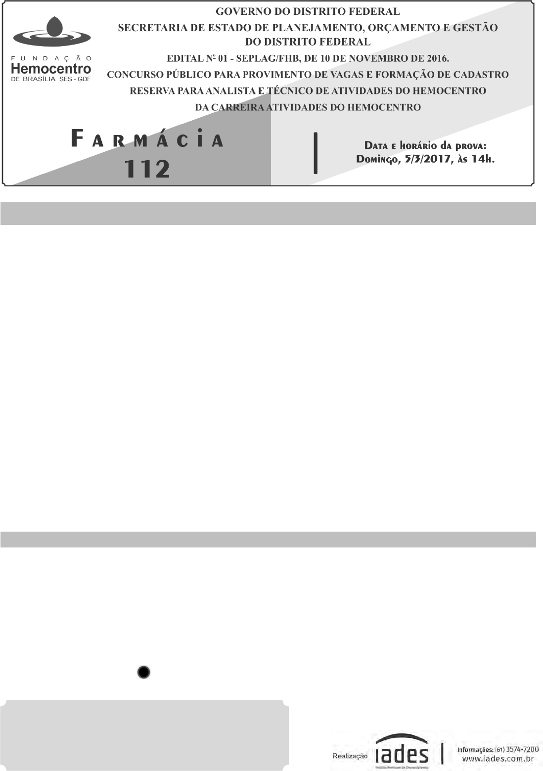 I N S T R U Ç Õ E S • Você receberá do fiscal: o um caderno de questões da prova objetiva e discursiva contendo 50 (cinquenta) questões de múltipla escolha, com 5 (cinco) alternativas de resposta cada uma, e apenas uma alternativa correta, e 1 (uma) questão discursiva; o um cartão de respostas ótico personalizado; e, o uma folha de resposta da prova discursiva. • Quando autorizado pelo fiscal do IADES, no momento da identificação, escreva no espaço apropriado do cartão de respostas, com a sua caligrafia usual, a seguinte frase: Faz-se do amigo próximo, distante. • Verifique se a numeração das questões, a paginação do caderno de questões e a codificação do cartão de respostas ótico e da folha de resposta da prova discursiva estão corretas. • Você dispõe de 4 (quatro) horas para fazer a prova objetiva e discursiva, devendo controlar o tempo, pois não haverá prorrogação desse prazo. Esse tempo inclui a marcação do cartão de respostas ótico e o preenchimento da folha de resposta da prova discursiva. • Somente após decorrida 1 (uma) hora do início da prova, você poderá entregar seu cartão de respostas ótico, a folha de resposta da prova discursiva e o caderno de provas e retirar-se da sala. • Somente será permitido levar o caderno de questões da prova objetiva e discursiva após 3 (três) horas do início da prova. • Após o término da prova, entregue ao fiscal do IADES a folha de resposta da prova discursiva e o cartão de respostas devidamente assinado. • Deixe sobre a carteira apenas o documento de identidade e a caneta esferográfica de tinta preta, fabricada de material transparente. • Não é permitida a utilização de qualquer aparelho eletrônico ou de comunicação. • Não é permitida a consulta a livros, dicionários, apontamentos e apostilas. • Você somente poderá sair e retornar à sala de aplicação de provas na companhia de um fiscal do IADES. • Não será permitida a utilização de lápis em nenhuma etapa da prova. I NSTRUÇÕES PARA A PROVA OBJETI VA E D I SCURSI VA • Verifique se os seus dados estão corretos no cartão de respostas da prova objetiva e na folha de resposta da prova discursiva. Caso haja algum dado incorreto, escreva apenas no(s) campo(s) a ser(em) corrigido(s), conforme instruções no cartão de respostas. • Leia atentamente cada questão e assinale, no cartão de respostas ótico, uma única alternativa. • O cartão de respostas ótico e a folha de resposta da prova discursiva não podem ser dobrados, amassados, rasurados ou manchados e nem podem conter nenhum registro fora dos locais destinados às respostas. • O candidato deverá transcrever, com caneta esferográfica de tinta preta, as respostas da prova objetiva para o cartão de respostas, e o texto definitivo da prova discursiva para a respectiva folha de resposta. • A maneira correta de assinalar a alternativa no cartão de respostas é cobrir, fortemente, com caneta esferográfica de tinta preta, o espaço a ela correspondente. • Marque as respostas assim: www.pciconcursos.com.br CONCURSO PÚBLICO – HEMOCENTRO 112 – FARMÁCIA – TIPO A PÁGINA 2/15 CONHECIMENTOS BÁSICOS Questões de 1 a 25 LÍNGUA PORTUGUESA Questões de 1 a 8 Texto 1 para responder às questões 1 e 2. Disponível em: <https://www.facebook.com/hemocentrobrasilia/photos/pb. 309692019051454.-2207520000.1482262556./1283803091640337/?type=3 &theater>. Acesso em: 20 dez. 2016. QUESTÃO 1 _______________________ Com base na leitura compreensiva do texto, assinale a alternativa correta. (A) A mensagem principal é um apelo para que a população faça parte de uma campanha de doação de sangue. (B) Somente a partir dos 19 anos de idade, uma pessoa pode doar sangue sem precisar apresentar formalmente o consentimento do respectivo responsável. (C) Desde que com consentimento formal do respectivo responsável, qualquer pessoa menor de 18 anos de idade pode ser doadora de sangue. (D) Uma pessoa que pesa precisamente 50 kg, mesmo que atenda a todas as outras orientações, não pode ser doadora de sangue. (E) Uma pessoa que consome alimentos gordurosos não pode doar sangue, pois deixa de observar a orientação “Estar bem de saúde”. QUESTÃO 2 _______________________ Com base apenas nas regras prescritas pela norma-padrão acerca da acentuação gráfica e do uso do sinal indicativo de crase, assinale a alternativa correta. (A) A construção “Orientações para o doador” poderia ser substituída pela redação Orientações à toda pessoa que pretende doar. (B) Caso o emissor decidisse explicitar o local de doação de sangue, poderia substituir a construção “Levar documento oficial de identidade com foto” por qualquer uma das seguintes redações: Levar à sua unidade de doação documento oficial de identidade com foto ou Levar a sua unidade de doação documento oficial de identidade com foto. (C) Assim como o vocábulo “saúde”, também estão corretamente acentuados saída, gratuíto e rúbrica . (D) O emissor poderia substituir a expressão “alimentos gordurosos” pela redação alimentos que contém gordura. (E) O trecho “nas três horas que antecedem a doação” poderia ser substituído por apenas uma das seguintes redações: nas três horas anteriores a doação ou à três horas antes da doação. Texto 2 para responder às questões de 3 a 5. 1 4 7 10 13 16 18 Doação de sangue Ninguém está livre de precisar de uma transfusão de sangue. Ninguém está livre de sofrer um acidente, de passar por uma cirurgia ou por um procedimento médico em que a transfusão seja absolutamente indispensável. Como não existe sangue sintético produzido em laboratórios, quem precisa de transfusão tem de contar com a boa vontade de doadores, uma vez que nada substitui o sangue verdadeiro retirado das veias de outro ser humano. Todos sabemos que é importante doar sangue. Mas, quando chega a nossa vez, sempre encontramos uma