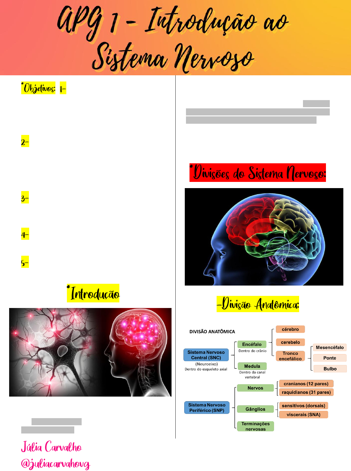 COMPREENDER a anatomia e histologia do Sistema Nervoso Central – formado pelo encéfalo (cérebro – diencéfalo e telencéfalo, tronco encefálico - mesencéfalo, ponte e bulbo e o cerebelo) e medula espinal; COMPREENDER a anatomia e histologia do Sistema Nervoso Periférico: •Nervos (Espinhais e Cranianos); •Gânglios e terminações nervosas; ESTUDAR a anatomia e histologia dos neurônios e da neuroglia, EXPLICITAR os tipos de neurônios; ENTENDER a fisiologia das sinapses e suas classificações quanto a morfologia; ESTUDAR os mecanismos de transmissão sináptica, tipos e funções dos neurotransmissores ; O sistema Nervoso é responsável por controlar as ações voluntárias (correr, falar, andar, etc) e ações involuntárias (batimentos cardíacos, respira- ção, digestão, respiração, etc) que o corpo realiza. Esse sistema está relacionado com a captação, interpretação e resposta a estímulos, além de armazenar informações na forma de memória. Ele permite que nosso corpo seja capaz de responder a estímulos internos e externos. Ele divide-se, nos critérios anatômicos em: Sistema Nervoso Central e Sistema Nervoso Periférico. (GUYTON, 2017) *Sistema Nervoso Central é aquele que se localiza dentro do esqueleto axial (cavidade craniana e canal vertebral); Sistema Nervoso Periférico é aquele que se encontra fora do esqueleto axial; (MACHADO, 2007) *OBS: Esta distinção, embora geralmente utilizada, não é perfeitamente exata, pois como é óbvio, os nervos e raízes nervosas, para fazer conexão com o sistema nervoso central, penetram no crânio e no canal vertebral. Além disso, alguns gânglios localizam-se dentro do esqueleto axial. Encéfalo é a parte do sistema nervoso central situada dentro do crânio: a medula se localiza dentro do canal vertebral. No encéfalo temos cérebro, cerebelo e tronco encefálico. A ponte separa o bulbo, situado caudalmente, do mesencéfalo, situado cranialmente. Dorsalmente à ponte e ao bulbo, localiza-se o cerebelo. Nervos são cordões esbranquiçados que unem o sistema nervoso central aos órgãos periféricos. Se a união se faz com o encéfalo, os nervos são cranianos; se com a medula, espinhais. (MACHADO, 2007) Em relação com alguns nervos e raízes nervosas existem dilatações constituídas sobretudo de corpos de neurônios, que são os gânglios. Do ponto de vista funcional, existem gânglios sensitivos e gânglios motores viscerais (do sistema nervoso autônomo). Na extremidade das fibras que constituem os nervos situam-se as terminações nervosas que, do ponto de vista funcional são de dois tipos: sensitivas (ou aferentes) e motoras (ou elerentes). Nesta divisão, as partes do sistema nervoso central recebem o nome de vesícula encefálica primitiva, onde se desenvolvem três dilatações do tubo neural: Prosencéfalo, Mesencéfalo e Rombencéfalo (ordem craniossacral). Essas três vesículas darão origem respectivamente ao cérebro (diencéfalo e telencéfalo), mesencéfalo, metencéfalo (cerebelo e ponte) e mielencéfalo (bulbo). (MACHADO, 2007) Pode-se dividir o sistema nervoso em sistema nervoso da vida de relação, ou somático, e sistema nervoso da vida vegetativa, ou visceral. é aquele que relaciona o organismo com o meio ambiente. Apresenta um componente aferente e outro eferente. O componente aferente conduz aos centros nervosos impulsos originados em receptores periféricos, informando-os sobre o que se passa no meio ambiente. O componente eferente leva aos músculos estriados esqueléticos o comando dos centros nervosos, resultando, pois, em movimentos voluntários. (MACHADO, 2007) é aquele que se relaciona com a inervação e controle das estruturas viscerais. É muito importante para a integração das diversas vísceras no sentido da manutenção da constância do meio interno. Assim como no sistema nervoso da vida de relação, distingui-se em uma parte aferente e outra eferente. O componente aferente conduz os impulsos nervosos originados em receptores das vísceras (visceroceptores) a áreas específicas do sistema nervoso central.O componente eferente leva os impulsos originados em certos centros nervosos até as vísceras, terminando em glândulas, músculos lisos ou músculo cardíaco. (MACHADO, 2007) O componente eferente do sistema nervoso visceral é denominado sistema nervoso autônomo e pode ser subdividido em simpático e parassimpático. O sistema Nervoso Entérico também é um componente do Sistema Nervoso Autônomo, Ele está localizado fora do SNC. Pode-se dividir o sistema nervoso em sistema nervoso segmentar e sistema nervoso suprassegmentar A segmentação no sistema nervoso é evidenciada pela conexão com os nervos. Pertence, pois, ao sistema nervoso segmentar todo o sistema nervoso periférico mais aquelas partes do sistema nervoso central que estão em relação direta com os nervos típicos, ou seja: a medula espinhal e o tronco encefálico. O cérebro e o cerebelo pertencem ao sistema nervoso suprassegmentar. Os nervos olfatório e óptico se ligam diretamente ao cérebro, mas estes não são nervos típicos. Esta divisão põe em evidência as semelhanças estruturais e funcionais existentes entre a medula e o tronco encefálico, órgãos do sistema nervoso segmentar, em oposição ao cérebro e ao cerebelo, órgãos do sistema nervoso suprassegmentar. Assim, nos órgãos do sistema nervoso suprassegmentar existe córtex, ou seja, uma camada fina de substância cinzenta situada fora da substância branca. Já nos órgãos do sistema nervoso segmentar não há córtex, e a substância cinzenta pode localizar-se dentro da branca, como ocorre na medula. O sistema nervoso segmentar surgiu, na evolução, antes do suprassegmentar e, funcionalmente, pode-se dizer que lhe é subordinado. (MACHADO, 2007) Como já vimos, Sistema Nervoso Central é aquele localizado dentro do esqueleto axial, sendo formado pelo encéfalo e medula espinal. O encéfalo e a medula constitu