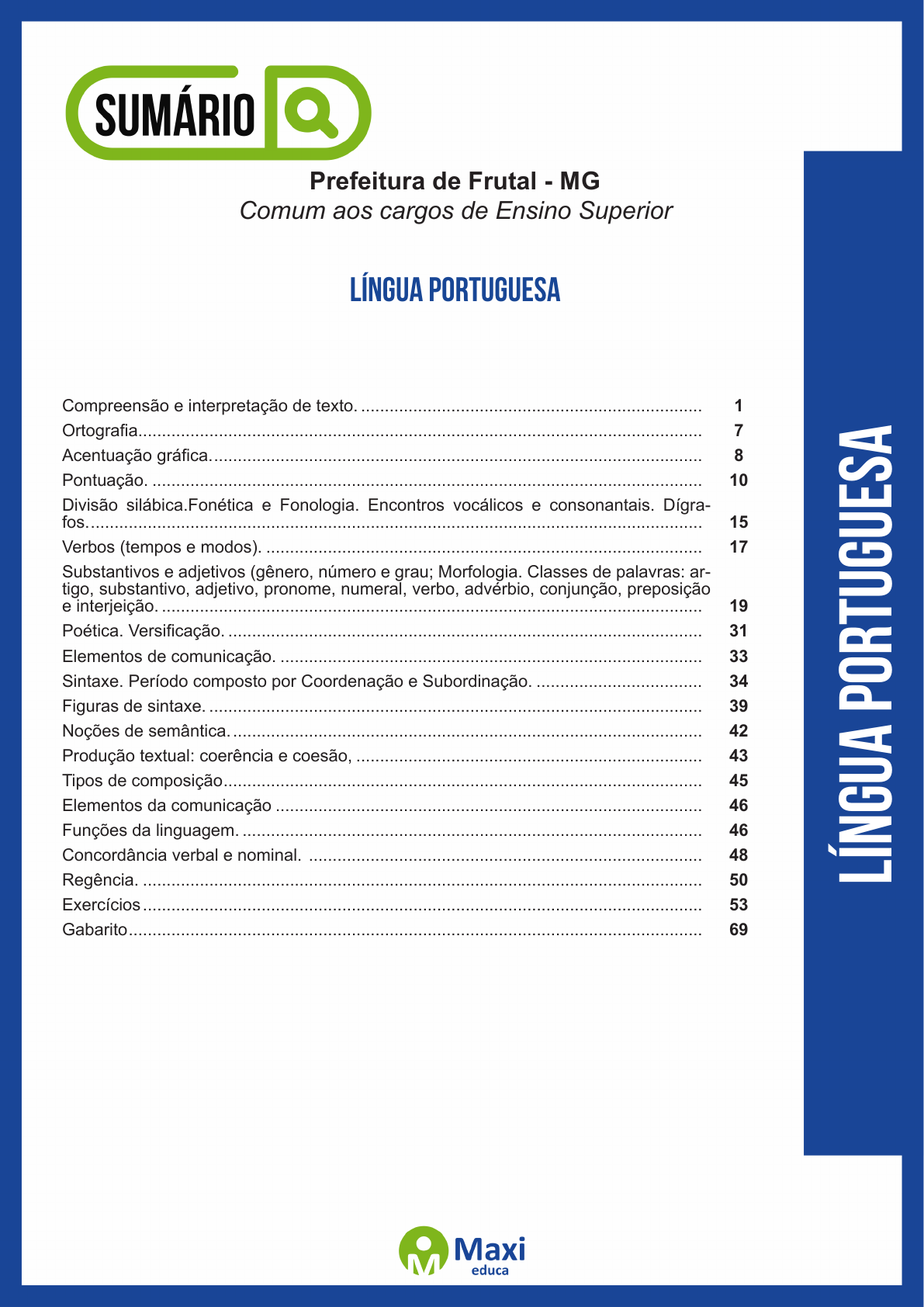 Lín gu a Po rt ug ue sa Prefeitura de Frutal - MG Comum aos cargos de Ensino Superior Língua Portuguesa Compreensão e interpretação de texto. ........................................................................ 1 Ortografia....................................................................................................................... 7 Acentuação gráfica. ....................................................................................................... 8 Pontuação. .................................................................................................................... 10 Divisão silábica.Fonética e Fonologia. Encontros vocálicos e consonantais. Dígra- fos. ................................................................................................................................. 15 Verbos (tempos e modos). ............................................................................................ 17 Substantivos e adjetivos (gênero, número e grau; Morfologia. Classes de palavras: ar- tigo, substantivo, adjetivo, pronome, numeral, verbo, advérbio, conjunção, preposição e interjeição. .................................................................................................................. 19 Poética. Versificação. .................................................................................................... 31 Elementos de comunicação. ......................................................................................... 33 Sintaxe. Período composto por Coordenação e Subordinação. ................................... 34 Figuras de sintaxe. ........................................................................................................ 39 Noções de semântica. ................................................................................................... 42 Produção textual: coerência e coesão, ......................................................................... 43 Tipos de composição ..................................................................................................... 45 Elementos da comunicação .......................................................................................... 46 Funções da linguagem. ................................................................................................. 46 Concordância verbal e nominal. ................................................................................... 48 Regência. ...................................................................................................................... 50 Exercícios ...................................................................................................................... 53 Gabarito ......................................................................................................................... 69 1817077 E-book gerado especialmente para JOSE ANTONIO DE LIMA 1 Compreensão e interpretação de texto. Definição Geral Embora correlacionados, esses conceitos se distinguem, pois sempre que compreendemos adequadamente um texto e o objetivo de sua mensagem, chegamos à interpretação, que nada mais é do que as conclusões específicas. Exemplificando, sempre que nos é exigida a compreensão de uma questão em uma avaliação, a resposta será localizada no próprio no texto, posteriormente, ocorre a interpretação, que é a leitura e a conclusão fundamentada em nossos conhecimentos prévios. Compreensão de Textos Resumidamente, a compreensão textual consiste na análise do que está explícito no texto, ou seja, na identificação da mensagem. É assimilar (uma devida coisa) intelectualmente, fazendo uso da capacidade de entender, atinar, perceber, compreender. Compreender um texto é apreender de forma objetiva a mensagem transmitida por ele. Portanto, a compreensão textual envolve a decodificação da mensagem que é feita pelo leitor. Por exemplo, ao ouvirmos uma notícia, automaticamente compreendemos a mensagem transmitida por ela, assim como o seu propósito comunicativo, que é informar o ouvinte sobre um determinado evento. Interpretação de Textos É o entendimento relacionado ao conteúdo, ou melhor, os resultados aos quais chegamos por meio da associação das ideias e, em razão disso, sobressai ao texto. Resumidamente, interpretar é decodificar o sentido de um texto por indução. A interpretação de textos compreende a habilidade de se chegar a conclusões específicas após a leitura de algum tipo de texto, seja ele escrito, oral ou visual. Grande parte da bagagem interpretativa do leitor é resultado da leitura, integrando um conhecimento que foi sendo assimilado ao longo da vida. Dessa forma, a interpretação de texto é subjetiva, podendo ser diferente entre leitores. Exemplo de compreensão e interpretação de textos Para compreender melhor a compreensão e interpretação de textos, analise a questão abaixo, que aborda os dois conceitos em um texto misto (verbal e visual): FGV > SEDUC/PE > Agente de Apoio ao Desenvolvimento Escolar Especial > 2015 Português > Compreensão e interpretação de textos A imagem a seguir ilustra uma campanha pela inclusão social. “A Constituição garante o direito à educação para todos e a inclusão surge para garantir esse direito também aos alunos com deficiências de toda ordem, permanentes ou temporárias, mais ou menos severas.” 1817077 E-book gerado especialmente para JOSE ANTONIO DE LIMA 2 A partir do fragmento acima, assinale a afirmativa incorreta. (A) A inclusão social é garantida pela Constituição Federal de 1988. (B) As leis que garantem direitos podem ser mais ou menos severas. (C) O direito à educação abrange todas as pessoas, deficientes ou não. (D) Os deficientes temporários ou permanentes devem ser incluídos socialmente. (E) “Educação para todos” inclui também os deficientes. Comentário da questão: Em “A” o texto é sobre direito à