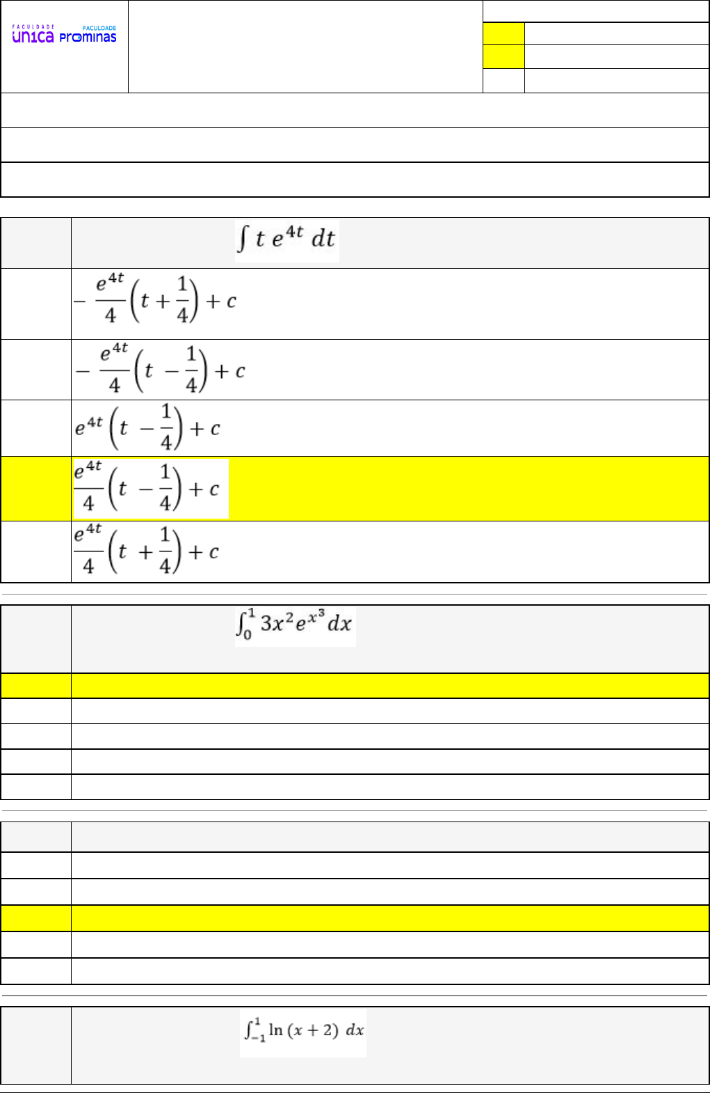 Pincel Atômico - 18/08/2024 15:26:53 1/3 THAYANA FERREIRA BARRETO CAMINHO DO CONHECIMENTO Atividade finalizada em 18/08/2024 15:26:43 (tentativa: 2) LEGENDA Resposta correta na questão # Resposta correta - Questão Anulada X Resposta selecionada pelo Aluno Disciplina: TEORIA DOS NÚMEROS [capítulos - 4] - Avaliação com questões, com o peso total de 1,67 pontos Turma: Segunda Graduação: Segunda Graduação 6 meses - Licenciatura em Matemática - Grupo: FPD-OUTUBRO/2023 - SGegu0A091023 [102175] Aluno(a): 91519018 - THAYANA FERREIRA BARRETO - Respondeu 7 questões corretas, obtendo um total de 1,46 pontos como nota Questão 001 Calculando a integral pelo método da integração por partes, teremos : A) B) C) X D) E) Questão 002 Calculando a integral pelo método da integração por partes, teremos : X A) e - 1 B) - e + 1 C) - e - 1 D) e E) e +1 Questão 003 Calculando a integral ∫ x2 ex dx pelo método da integração por partes, teremos: A) – x2ex + 2xex + 2ex + c B) x2ex + 2xex – 2ex + c X C) x2ex – 2xex + 2ex + c D) x2ex – 2xex – 2ex + c E) – x2 ex – 2xex – 2ex + c Questão 004 Calculando a integral pelo método da integração por partes, teremos: Pincel Atômico - 18/08/2024 15:26:53 2/3 A) 2 ln 3 – 3 B) 3 ln 3 + 2 X C) 3 ln 3 – 2 D) – 3 ln 3 + 2 E) –3 ln 3 – 2 Questão 005 Calculando a integral pelo método da integração por partes, teremos : A) - 2 B) -1 C) 2 X D) 0 E) 1 Questão 006 Calculando a integral ∫1 e x2 lnx dx pelo método da integração por partes, teremos: A) B) C) D) ( – 2e3 +1) X E) Questão 007 Calculando a integral ∫ xln(x) dx pelo método da integração por partes, teremos: A) B) C) D) X E) Questão 008 Calculado a integral pelo método da integração por partes, teremos : Pincel Atômico - 18/08/2024 15:26:53 3/3 A) B) X C) D) E)