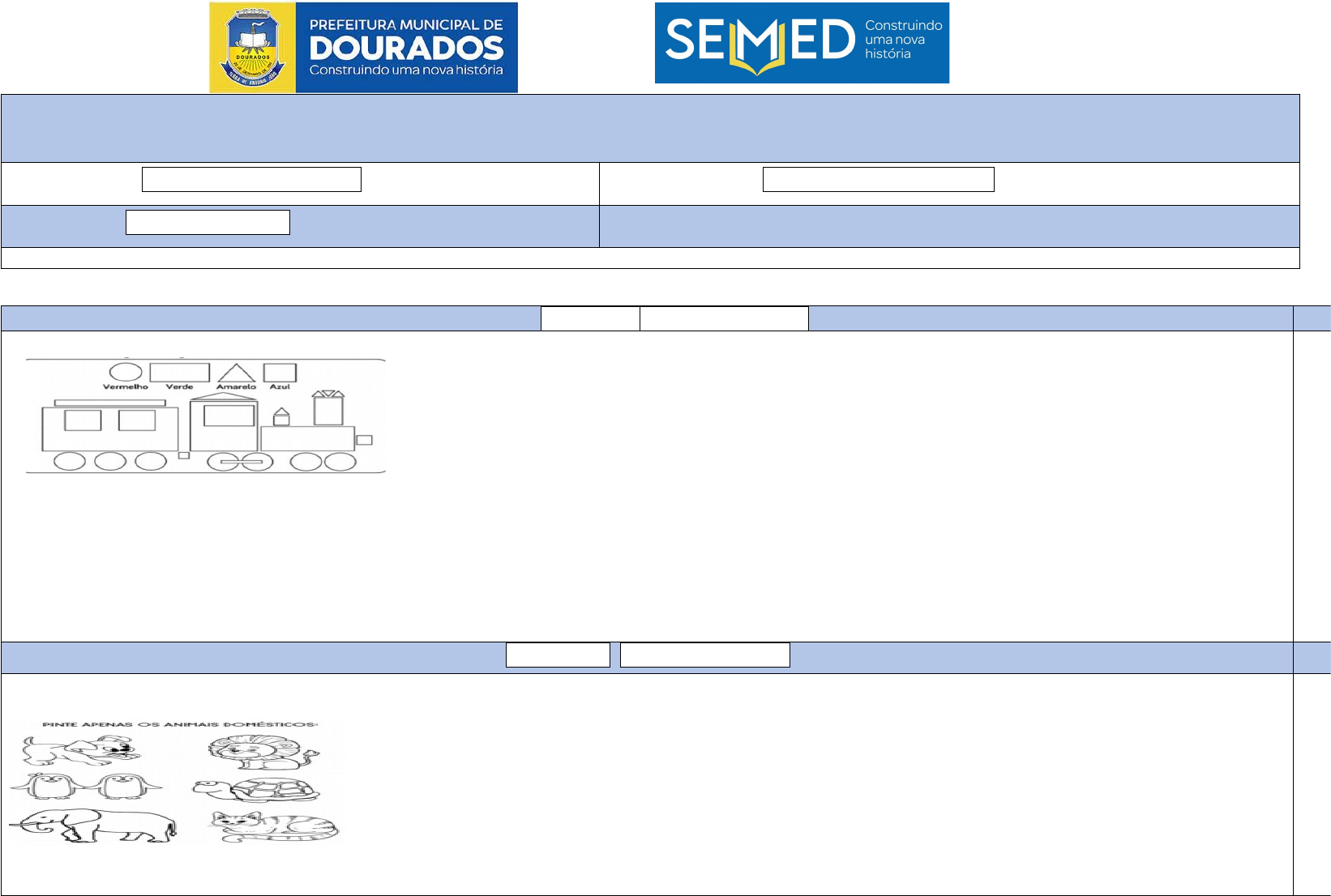 PLANEJAMENTO DAS PROPOSTAS: PROJETO: A BICHARADA ESTÁ SOLTA! INSTITUIÇÃO: CEIM Claudina da Silva Teixeira COORDENAÇÃO: Rosenir Aparecida Araujo Souza DISCIPLINA: Práticas Pedagógicas II TURMA: Maternal II B Vespertino PROFESSORA: Milian Silva Reis Machado 03/072024 Quarta-feira Vivência e experiência: “Desenhos Com Formas Geométricas” Direitos de aprendizagem: Expressar, Conhecer-se, Explorar, Participar, Conviver e Brincar. Campo de experiências: Traços, Sons, Cores e Formas. Objetivos de aprendizagem: (MS.EI02TS00.n.08) Produzir e criar diferentes imagens por meio do desenho, pintura, colagem e fotografia, significando suas ideias, pensamentos e percepções. Metodologia: A professora irá desenhar algumas formas geométricas ( quadrado, triângulo, retângulo) no caderno de desenho ou folha sulfite e sugerir á criança que crie desenhos partindo dessas formas estimulando- a usar a imaginação. Também pode imprimir alguns desenhos com formas geométricas para que eles pinte. Recursos: folha sulfite, caderno e lápis de cor. 05/07/2024 Sexta-feira Vivência e experiência: “Que bicho esse “ Direitos de aprendizagem: Expressar, Conhecer-se, Explorar, Participar, Conviver e Brincar. Campo de experiências: Fala, Escuta, Pensamento e Imaginação. Objetivos de aprendizagem: (MS.EI02EF06.s.06) Criar e contar histórias oralmente, com base em imagens ou tema sugeridos. Metodologia: Disponibilizar para as crianças diversas imagens de diferentes tipos de animais, pedir que elas digam o nome de cada animal e onde eles vivem. Em seguida distribuir uma atividade impressa na qual as crianças deverão pintar somente os animais que podemos ter em casa. Recursos: Imagens de animais, atividade impressa e lápis de cor. 10/07/2024 Quarta-feira Vivência e experiência: “Animais terrestres” Direitos de aprendizagem: Expressar, Conhecer-se, Explorar, Participar, Conviver e Brincar. Campo de experiências: Traços, Sons, Cores e Formas. Objetivos de aprendizagem: (MS.EI02TS00.n.08) Produzir e criar diferentes imagens por meio do desenho, pintura, colagem e fotografia, significando suas ideias, pensamentos e percepções. (MS.EI02TS01.s.01) Ciar sons com materiais, objetos e instrumentos musicais, para acompanhar diversos ritmos de música. Metodologia: Nessa atividade de hoje, irá trabalhar com um animal terrestre. Ele mora na floresta, é grande e feroz. Nós falamos que ele é o rei da selva. Já sabe de qual animal estou falando? Rei da floresta https://www.youtube.com/watch?v=zt93UvnesEc Imprima a folha de atividade com a face do leão. O Leão está sem juba. Deixe-o mais bonito passando a pontinha do garfo na tinta guache (de preferência amarela ou laranja) e carimbando o garfo na folha de atividade (na região da juba do leão). Recursos: Folha de atividade; Giz de cera; Tinta guache (de preferência amarela ou laranja); Garfo (de preferência de plástico) 12/07/2024 Sexta-feira Vivência e experiência: “Não atire o pau no gato” Direitos de aprendizagem: Expressar, Conhecer-se, Explorar, Participar, Conviver e Brincar. Campo de experiências: Corpo Gesto e movimento; Traços, Sons, Cores e Formas; Objetivos de aprendizagem: (MS.EI02CG05.s.05) Desenvolver progressivamente as habilidades manuais adquirindo controle para desenhar, pintar, rasgar, folhear, dentre outros. Metodologia: Nessa atividade, vamos incentivar as crianças a brincar de cantiga de roda com a música “não atire o pau no gato” e em seguida direcione a mesma a realizar a atividade impressa ensinando-a primeiramente a fazer bolinhas de papel crepom e colar no caminho que leva o gato até o seu brinquedo, podendo também substituir as bolinhas de papel crepom por feijão, milho de pipoca, grão de bico. image4.jpeg image1.jpeg image2.jpeg image3.jpeg image5.jpg image10.jpg image6.jpg image20.jpg