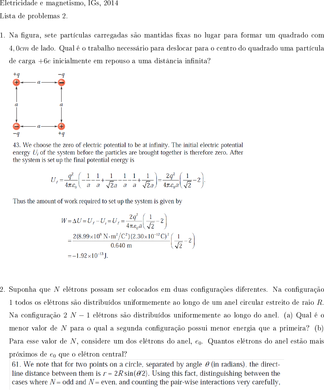 Eletricidade e magnetismo, IGs, 2014 Lista de problemas 2. 1. Na �gura, sete partículas carregadas são mantidas �xas no lugar para formar um quadrado com 4, 0cm de lado. Qual é o trabalho necessário para deslocar para o centro do quadrado uma partícula de carga +6e inicialmente em repouso a uma distância in�nita? 2. Suponha que N elétrons possam ser colocados em duas con�gurações diferentes. Na con�guração 1 todos os elétrons são distribuídos uniformemente ao longo de um anel circular estreito de raio R. Na con�guração 2 N − 1 elétrons são distribuídos uniformemente ao longo do anel. (a) Qual é o menor valor de N para o qual a segunda con�guração possui menor energia que a primeira? (b) Para esse valor de N , considere um dos elétrons do anel, e0. Quantos elétrons do anel estão mais próximos de e0 que o elétron central? : 3. (a) Um próton de energia cinética 4, 80MeV está rumando diretamente para o centro de um núcleo de chumbo. Supondo que o próton não penetra no núcleo de chumbo e a única interação entre o próton e o núcleo é a interação eletrostática, calcule a menor distância centro a centro dp entre o próton e o núcleo no momento em que o próton pára momentaneamente. Se o próton é substituído por uma partícula alfa (que contém dois prótons) com a mesma energia cinética inicial, a partícula alfa pára momentaneamente quando a distância centro a centro édα. Qual é o valor de dα/dp? R: (a) 2.5× 10−14m, (b) 2.00. 4. Um capacitor de placas paralelas possui placas circulares com um raio de 8, 20cm, separadas por uma distância de 1, 30mm. (a) Calcule a capacitância. (b) Qual é a carga das placas se uma diferença de potencial de 120V é aplicada ao capacitor? R: (a) 144pF , (b) 17.3nC. 5. O grá�co 1 da �gura (a) mostra a carga q armazenada no capacitor 1 em função da diferença de potencial V entre as placas. A escala vertical é de�nida por qS = 16, 0µC e a escala horizontal é de�nida por VS = 2, 0V . Os grá�cos 2 e 3 são grá�cos do mesmo tipo para os capacitores 2 e 3, respectivamente. A �gura (b) mostra um circuito com esses três capacitores e uma bateria de 6, 0V . Determine a carga do capacitor 2. R: 12µC. 6. A �gura mostra um capacitor variável com �dielétrico de ar� do tipo usado para sintonizar manualmente receptores de rádio. O capacitor é formado por dois conjuntos de placas intercaladas, um grupo de placas �xas, todas ligadas entre si, e um grupo de placas móveis, também ligadas entre si. Considere um capacitor com 4 placas de cada tipo de área A = 1, 25cm2; a distância entre placas vizinhas é d = 3, 40mm. Qual é a capacitância máxima do conjunto? R: 2.28× 10−12F. 7. Os capacitores da �gura estão inicialmente descarregados. As capacitâncias são C1 = 4, 0µF , C2 = 8, 0µF e C1 = 12µF , e a diferença de potencial da bateria é V = 12V . Quando a chave S é fechada, quantos elétrons passam (a) pelo ponto a; (b) pelo ponto b; (c) pelo ponto c; (d) pelo ponto d? Na �gura, os elétrons estão se movendo para cima ou para baixo ao passarem (e) pelo ponto b; (f) pelo ponto c? R: (a)4.5× 1014, (b)1.5× 1014, (c)3.0× 1014, (d)4.5× 1014, (e) para cima, (f) para cima 8. Um capacitor de 2, 0µF e um capacitor de 4, 0µF são ligados em paralelo a uma fonte com uma diferença de potencial de 300V . Calcule a energia total armazenada nos capacitores. R:0.27J . 9. Uma esfera de metal carregada, com 10cm de diâmetro, tem uma energia potencial de 8000V em relação a V = 0 no in�nito. Calcule a densidade de energia do campo elétrico perto da superfície da esfera. R:0.11J/m3. 10. Um cabo coaxial usado em uma linha de transmissão tem um raio interno de 0,10mm e um raio externo de 0,60mm. Calcule a capacitância por metro do cabo, supondo que o espaço entre os condutores seja preenchido com poliestireno. R: 81pF/m. 11. Um capacitor de placas paralelas cujo dielétrico é o ar tem uma capacitância de 50pF . (a) Se a área das placas é de 0, 35m2, qual é a distância entre as placas? (b) Se a região entre as placas é preenchida por um material com κ = 5, 6, qual é a nova capacitância? R: 6.2 × 10−2m, (b)2.8× 102pF . 12. A �gura mostra um capacitor de placas paralelas com uma área das placas A = 10, 5cm2 e uma distância entre as placas 2d = 7, 12mm. O lado esquerdo do espaço entre as placas é preenchido por um material de constante dielétrica κ1 = 21, 00; a metade superior do lado direito é preenchida por um material de constante dielétrica κ2 = 42, 0, e a metade inferior do lado direito é preenchida por um material de constante dielétrica κ3 = 58, 0. Qual é a capacitância? R: 4.55× 10−11F . 13. Um capacitor de placas paralelas tem uma capacitância de 100pF , uma área das placas de 100cm2 e um dielétrico de mica (κ = 5, 4) que preenche totalmente o espaço entre as placas. Para uma diferença de potencial de 50V , calcule (a) o módulo E do campo elétrico no interior do dielétrico; (b) o valor absoluto da carga livre nas placas; (c) o valor absoluto da densidade super�cial de cargas induzidas no dielétrico. R: (a)1.0× 104V/m, (b)5.0× 10−9C, (c) 4.1nC. 14. Duas placas paralelas de 100cm2 de área recebem cargas de mesmo valor absoluto, 8.9 × 10−7C, e sinais opostos. O campo elétrico no interior do dielétrico que preenche o espaço entre as placas é 1.4 × 106V/m. (a) Calcule a constante dielétrica do material. (b) Determine o módulo da carga induzida nas superfícies do dielétrico. R: (a)7.2, (b)7.7× 10−7C. 15. Determine a corrente em um �o de raio R = 3, 40mm se o módulo da densidade de corrente é dado por (a) Ja = J0r/R e (b) Jb = J0(1 − r/R), onde r é a distância radial e J0 = 5, 50 × 104A/m2. (c) Para qual das duas funções a densidade de corrente perto da superfície do �o é maior? R: (a) 1.33A, (b) 0.666A, (c) para Ja. 16. Quanto tempo os elétrons levam para ir da bateria de um ca