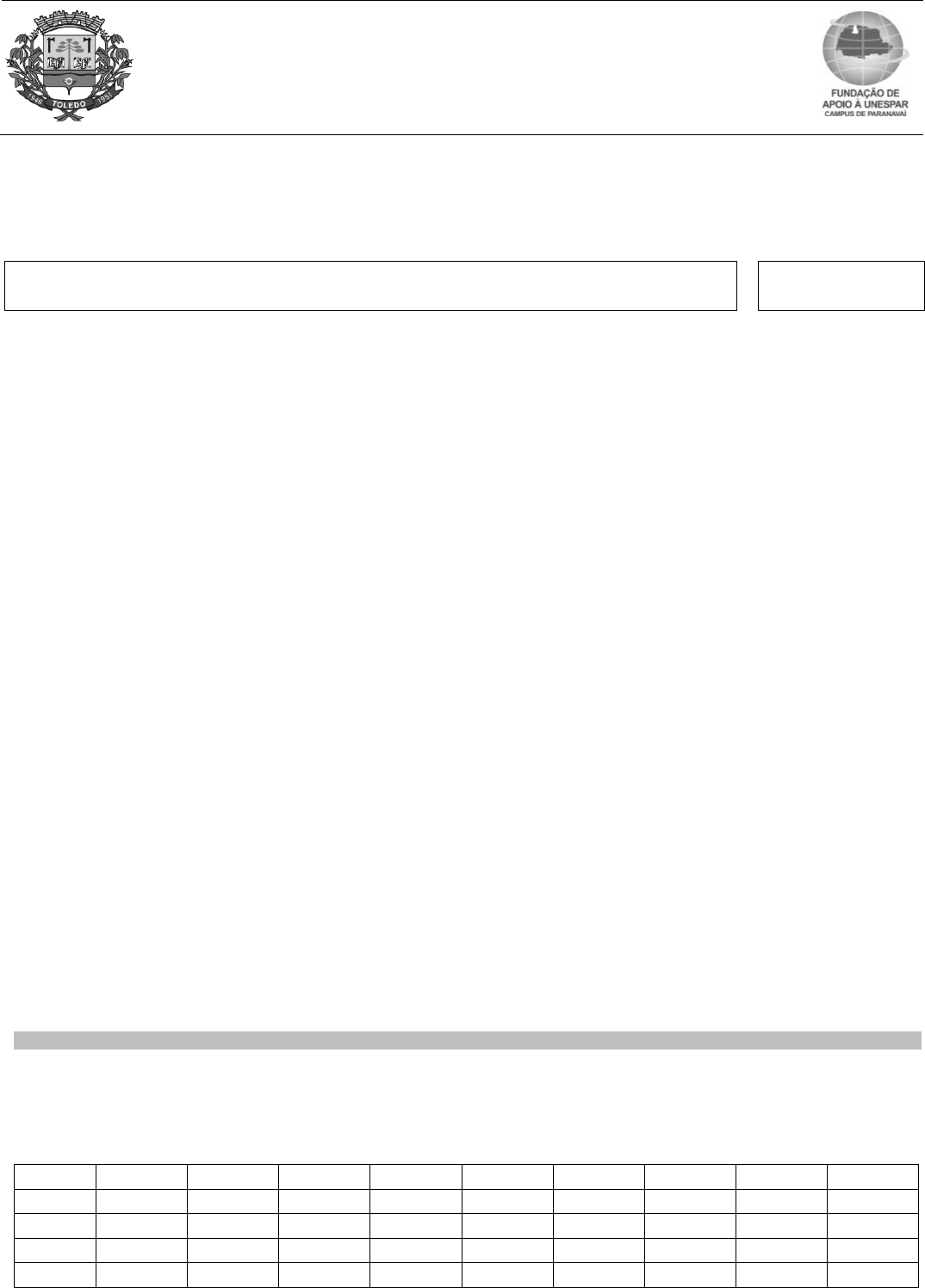 PREFEITURA DO MUNICÍPIO DE TOLEDO ESTADO DO PARANÁ EDITAL DE CONCURSO PÚBLICO N.º 01/2019 CONTADOR I NOME DO CANDIDATO NÚMERO DE INSCRIÇÃO LEIA ATENTAMENTE AS INSTRUÇÕES ABAIXO 1. Este Caderno de provas é composto por 50 (cinquenta) questões e não deve ser folheado antes da autorização do Fiscal. 2. Observe se o Cargo especificado no Caderno de provas é o correspondente ao cargo para o qual você fez a inscrição. 3. Será permitido aos candidatos portar apenas caneta esferográfica transparente de tinta azul ou preta, sendo ainda permitido garrafa de água transparente sem rótulo. 4. Ao receber a Folha de Respostas, realize a conferência de seus dados e quaisquer divergências comunique o fiscal. 5. Leia atentamente cada questão da prova objetiva e preencha na Folha de Respostas a única alternativa que a responda corretamente. 6. A Folha de Respostas não pode ser dobrada, amassada, rasurada ou conter qualquer marcação fora dos campos destinados. 7. Você dispõe de 04 (quatro) horas para fazer a prova, incluindo a marcação da Folha de Respostas. 8. O candidato somente poderá retirar-se do local de realização das provas escritas levando o caderno de provas no decurso dos últimos 60 (sessenta) minutos anteriores ao horário previsto para o seu término. O candidato, também, poderá retirar-se do local de provas somente a partir dos 60 (sessenta) minutos após o início de sua realização, contudo não poderá levar consigo o caderno de provas. 9. Após o término da prova, entregue ao Fiscal a FOLHA DE RESPOSTAS devidamente assinada. 10. O CANDIDATO NÃO PODERÁ durante a realização: a) Deixar o local de realização da prova objetiva sem a devida autorização. b) Faltar com o devido respeito para com qualquer membro da equipe de aplicação das provas, com as autoridades presentes ou com os demais candidatos. c) Proceder de forma a tumultuar a realização da prova escrita. d) Ausentar-se da sala, a qualquer tempo, portando a Folha de Respostas. 11. Não será permitida, durante a realização das provas, a comunicação entre os candidatos nem a utilização de máquinas calculadoras e/ou similares, livros, anotações, impressos ou qualquer outro material de consulta, protetor auricular, lápis, borracha ou corretivo. Especificamente, não será permitido o candidato ingressar na sala de provas sem o devido recolhimento, com respectiva identificação, dos seguintes equipamentos: bip, telefone celular, walkman, agenda eletrônica, notebook, palmtop, ipod, ipad, tablet, smartphone, mp3, mp4, receptor, gravador, máquina de calcular, máquina fotográfica, controle de alarme de carro, relógio de qualquer modelo, etc., o que não acarreta em qualquer responsabilidade do Município sobre tais equipamentos. No caso do candidato, durante a realização das provas, ser surpreendido portando os aparelhos eletrônicos citados, será automaticamente lavrado no Relatório de Aplicação o fato ocorrido e ELIMINADO automaticamente do processo de seleção. Para evitar qualquer situação neste sentido, o candidato deverá evitar portar no ingresso ao local de provas quaisquer equipamentos acima relacionados. 12. Não será permitido o uso de qualquer material bibliográfico, calculadora, telefone celular, notebook ou similar, durante as provas, devendo o candidato portar apenas caneta esferográfica preta ou azul. 13. Os 03 (três) últimos candidatos só poderão sair da sala juntos, após o fechamento e assinatura do envelope de retorno. 14. O candidato que terminar sua prova não poderá utilizar os banheiros destinados aos candidatos que ainda estiverem realizando- a. 15. Está disponível abaixo um gabarito para ser preenchido e destacado. Este poderá ser levado pelo candidato. ……………………………………………………………………………………………………………………………………………………. GABARITO Concurso Público da Prefeitura do Município de Toledo – Estado do Paraná http://www.fundacaofafipa.org.br http://www.toledo.pr.gov.br Divisão da prova: Língua Portuguesa: 01 a 10; Matemática: 11 a 20; Conhecimentos de Informática: 21 a 25; Conhecimentos Gerais: 26 a 30; e Conhecimentos Específicos do Cargo: 31 a 50. 1. 2. 3. 4. 5. 6. 7. 8. 9. 10. 11. 12. 13. 14. 15. 16. 17. 18. 19. 20. 21. 22. 23. 24. 25. 26. 27. 28. 29. 30. 31. 32. 33. 34. 35. 36. 37. 38. 39. 40. 41. 42. 43. 44. 45. 46. 47. 48. 49. 50. DESTAQUE AQUI Cargo: CONTADOR I Página -3- LÍNGUA PORTUGUESA TEXTO PARA RESPONDER ÀS QUESTÕES 01, 02 E 03. TEXTO I - Essa noite eu não consegui dormir. - É mesmo? Que aconteceu? - Eu estava quase pegando no sono, quando ouvi uma linda canção. - E o que era? - Era o canto do quarto. SARRUMOR, Laert. Mil piadas do Brasil. São Paulo: Nova Alexandria, 1998. p. 106. QUESTÃO 01 O texto é uma piada. As características comuns desse gênero são, dentre outras coisas, enredos simples e ambiguidade. Qual das palavras abaixo, retiradas do texto, foi utilizada com duplo sentido? (A) Dormir. (B) Canção. (C) Quarto. (D) Canto. (E) Linda. QUESTÃO 02 Na frase “Eu estava quase pegando no sono, quando ouvi uma linda canção”, a segunda oração é um exemplo de: (A) Oração subordinada substantiva predicativa. (B) Oração coordenada sindética adversativa. (C) Oração subordinada adverbial temporal. (D) Oração coordenada assindética aditiva. (E) Oração subordinada adverbial causal. QUESTÃO 03 Sobre o sujeito da oração “[...] quando ouvi uma linda canção”, é possível classificá-lo como: (A) Sujeito recuperável na desinência do verbo. (B) Sujeito composto. (C) Sujeito indeterminado. (D) Oração sem sujeito. (E) Impessoal. TEXTO PARA RESPONDER ÀS QUESTÕES DE 04 A 09. TEXTO II Pessoas com seis dedos em cada mão possuem habilidades motoras melhores Os polidáctilos são capazes de realizar com apenas uma mão algumas atividades que normalmente necessitariam de duas. Por Maria 