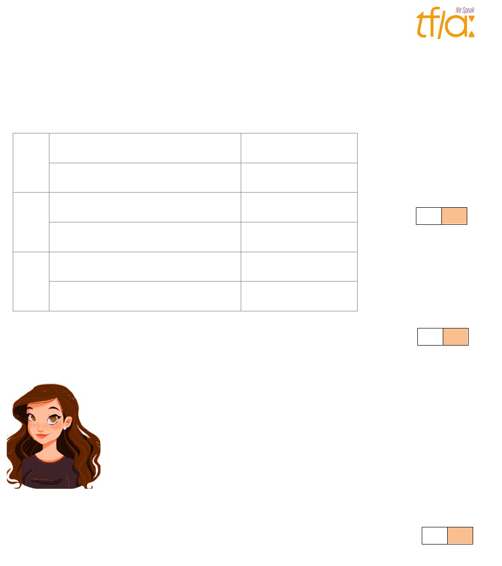 LISTENING TEST – INTERCHANGE A – UNITS 3 Name (Portuguese):___________________________ (English): ____________________________ Group: _______________________ Teacher: ______________________ Date: _______________ 1. Listen to the conversations. Choose True or False. I. Fernando is from Spain. Fernando is from Barcelona. II. Nanami is from Japan. Her parents are Japanese. III. Sophia is from Canada. Sophia is from Vancouver. 2. Listen to the conversation between Nadia and Ben. Write the information about the girl in the picture. Who’s that? _____________________________________________ What’s her name? _________________________________________ How old is she? ___________________________________________ What’s she like? __________________________________________ 3. Listen to the conversations. What are Nora, Taylor and Austin like? I. What’s Nora like? (3 points) ________________________________________________________________________________ II. What’s Taylor like? (2 points) ________________________________________________________________________________ III. What’s Austin like? (3 points) ________________________________________________________________________________ 6 teacher use only. 4 teacher use only. 8 teacher use only. mariza.oliveira_onfl Texto digitado She's my sister 4. Read and listen the questions. Write the answers you hear. What’s your name? __________________________________________________ Where are you from? __________________________________________________ How are you today? __________________________________________________ Who’s that? __________________________________________________ How old is she? __________________________________________________ What’s she like? __________________________________________________ Who are they? __________________________________________________ Where are they from? __________________________________________________ What’s San Francisco like? __________________________________________________ 9 teacher use only. Total 27 teacher use only. Name Portuguese: Mariza / Phoebe English: ICAU3 - SAB 09:00 Group: ICAU3 - SAB 09:00 Teacher: Petah Mellark Date: 17/08/2024 Whos that: SHE'S MY SISRTER Whats her name: MADSON How old is she: SHE'S TWENTY-EIGHT Whats she like: SHE'S SHY OR SHE'S REALLY KIND. undefined: MY NAME IS SOPHIA undefined_2: I'M FROM CANADA undefined_3: I'M FINE. THANKS! undefined_4: SHE'S MY SISTER undefined_5: SHE'S TWENTY-EIGHT undefined_6: SHE'S VERY NICE undefined_7: THEY'RE MY CLASS MATES undefined_8: THEY'RE FROM SAN FRANCISCO undefined_9: IT'S VERY BEAUTIFUL Total: 0 Dropdown1: [True] Dropdown2: [False] Dropdown3: [False] Dropdown4: [True] Dropdown5: [True] Dropdown6: [False] Questão1: Questão2: Questão3: Text10: NORA IS REALLY QUIET AND VERY NICE. Text11: TAYLOR IS VERY FUNNY, NICE AND HANDSOME. Text12: AUSTIN IS SHORT, TALKATIVE AND FUNNY. Questão4: