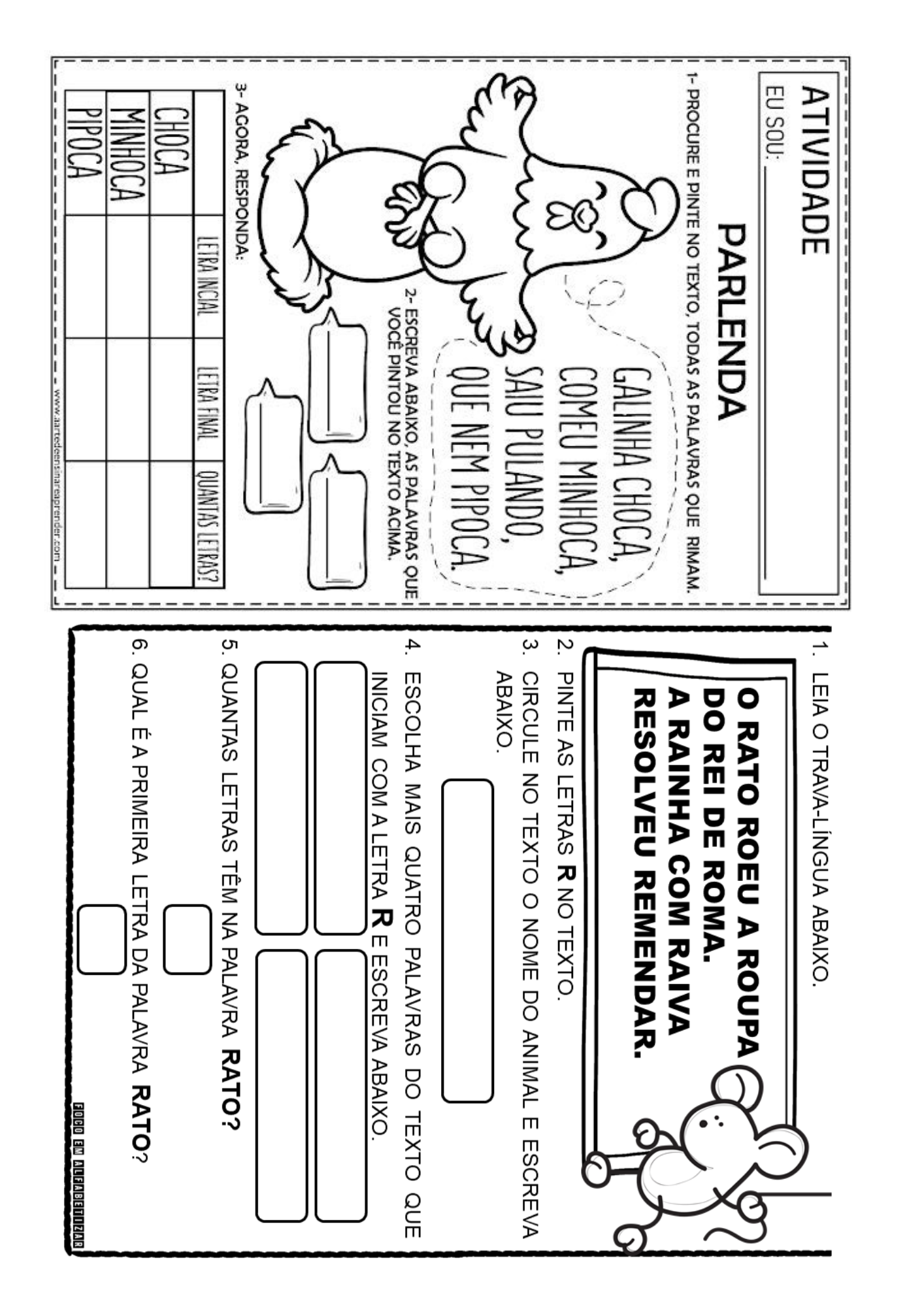ATIVIDADE 1. LEIA TRAVA-LÍNGUA ABAIXO. EU SOU: RATO ROEU A ROUPA PARLENDA DO REI DE ROMA. 1- PROCURE E PINTE NO TODAS AS PALAVRAS QUE RIMAM. A RAINHA COM RAIVA GALINHA CHOCA, RESOLVEU REMENDAR. COMEU MINHOCA, 2. PINTE AS LETRAS R NO TEXTO. SAIU PULANDO, 3. CIRCULE NO TEXTO NOME DO ANIMAL E ESCREVA ABAIXO. QUE NEM PIPOCA. 2- ESCREVA ABAIXO, AS PALAVRAS QUE 4. ESCOLHA MAIS QUATRO PALAVRAS DO TEXTO QUE VOCÊ PINTOU NO TEXTO ACIMA. INICIAM COM A LETRA R E ESCREVA ABAIXO. 3- AGORA, RESPONDA: 5. QUANTAS LETRAS TÊM NA PALAVRA RATO? LETRA INCIAL LETRA FINAL QUANTAS LETRAS? CHOCA MINHOCA 6. QUAL É A PRIMEIRA LETRA DA PALAVRA RATO? PIPOCA FOCO EM ALFABETIZAR