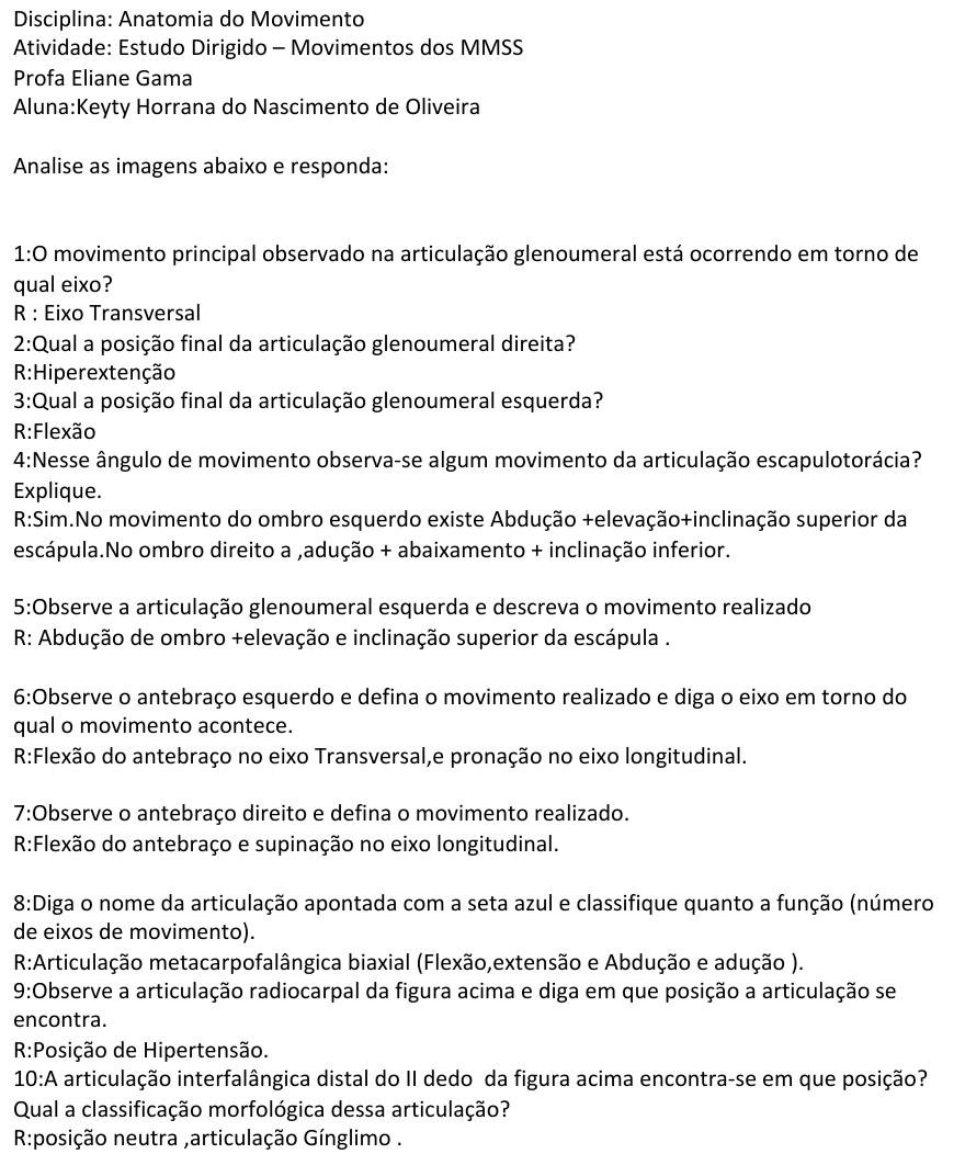 Disciplina: Anatomia do Movimento Atividade: Estudo Dirigido – Movimentos dos MMSS Profa Eliane Gama Aluna:Keyty Horrana do Nascimento de Oliveira Analise as imagens abaixo e responda: 1:O movimento principal observado na articulação glenoumeral está ocorrendo em torno de qual eixo? R : Eixo Transversal 2:Qual a posição final da articulação glenoumeral direita? R:Hiperextenção 3:Qual a posição final da articulação glenoumeral esquerda? R:Flexão 4:Nesse ângulo de movimento observa-se algum movimento da articulação escapulotorácia? Explique. R:Sim.No movimento do ombro esquerdo existe Abdução +elevação+inclinação superior da escápula.No ombro direito a ,adução + abaixamento + inclinação inferior. 5:Observe a articulação glenoumeral esquerda e descreva o movimento realizado R: Abdução de ombro +elevação e inclinação superior da escápula . 6:Observe o antebraço esquerdo e defina o movimento realizado e diga o eixo em torno do qual o movimento acontece. R:Flexão do antebraço no eixo Transversal,e pronação no eixo longitudinal. 7:Observe o antebraço direito e defina o movimento realizado. R:Flexão do antebraço e supinação no eixo longitudinal. 8:Diga o nome da articulação apontada com a seta azul e classifique quanto a função (número de eixos de movimento). R:Articulação metacarpofalângica biaxial (Flexão,extensão e Abdução e adução ). 9:Observe a articulação radiocarpal da figura acima e diga em que posição a articulação se encontra. R:Posição de Hipertensão. 10:A articulação interfalângica distal do II dedo da figura acima encontra-se em que posição? Qual a classificação morfológica dessa articulação? R:posição neutra ,articulação Gínglimo .
