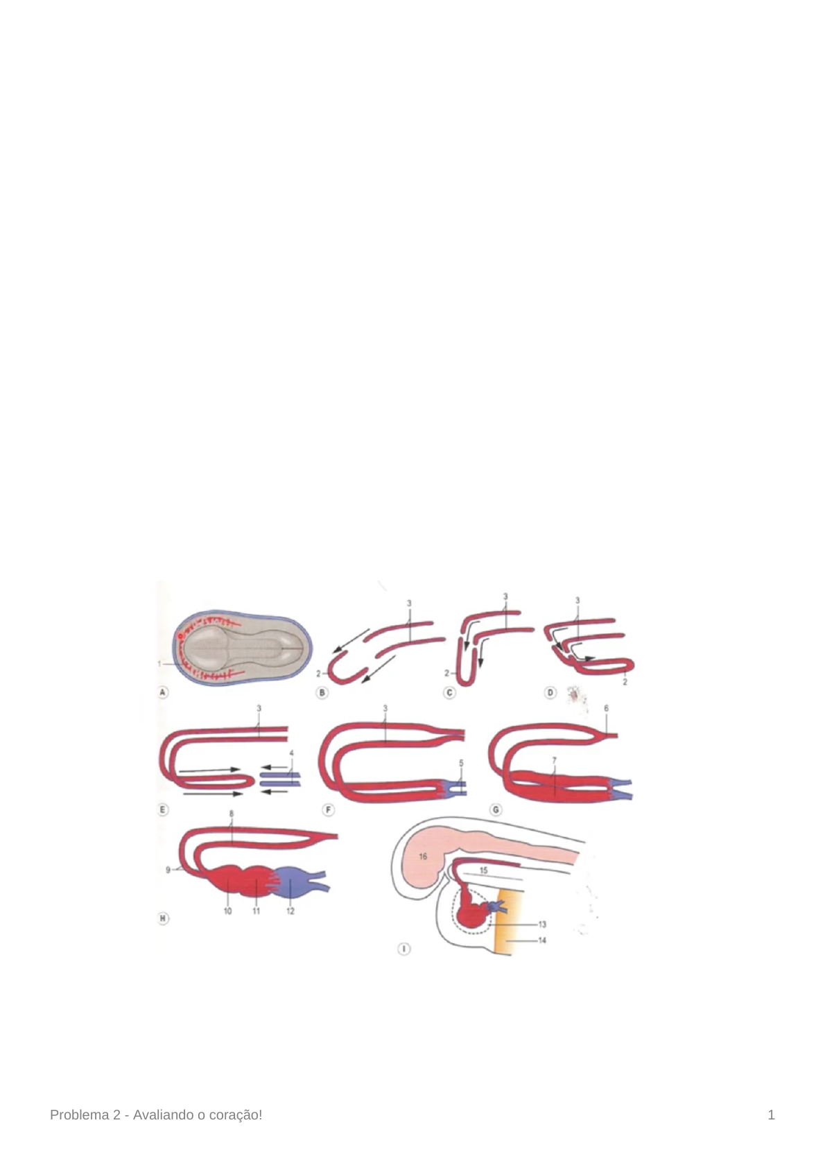 Problema 2 - Avaliando o coração! 1 Problema 2 - Avaliando o coração! Objetivo 1: Descrever a embriologia do coração e grandes vasos (dobramento da quarta semana, formação do septo interatrial, desenvolvimento e fusão dos tubos cardíacos) O sistema cardiovascular é o primeiro a funcionar durante o desenvolvimento embrionário, pois, com o crescimento do embrião, a difusão de O2 e nutrientes não é mais eficaz pra suprir todo o organismo. Originado pelo mesoderma esplênico, na área cardíaca localizada anteriormente a membrana bucofaríngea, é iniciado o processo de formação dos cordões angioblásticos, que em breve darão origem aos tubos endocárdicos do coração. Com o dobramento do embrião na quarta semana, ocorrerá a fusão desses tubos e uma mudança de posição do coração primitivo (antes na região cranial e agora em uma região ventral, cervical). Com a formação do tubo endocárdio único, as câmaras cardíacas começam Problema 2 - Avaliando o coração! 2 seu desenvolvimento. A princípio, o coração primitivo é formado por: seio venoso, átrio, ventrículo e bulbo cardíaco (tronco arterioso, cone arterioso e cone cardíaco). Do tronco arterioso sai o arco aórtico e no seio venoso chegam as veias vitelínica, umbilical e cardinal comum do córion. O bulbo e ventrículo tem um maior crescimento (alça bulboventricular), fazendo com que o coração sofra um dobramento que resulta no posicionamento do átrio e do seio venoso posterior as outras duas câmaras primitivas. Por não ser formado por câmaras de fato, o fluxo sanguíneo ocorre por “movimentos peristálticos”. Problema 2 - Avaliando o coração! 3 A septação atrioventricular ocorre a partir da fusão dos coxins ventral e dorsal. A septação do átrio ocorre a formação do septo primário na parede superior do átrio que delimita o forame primário, que deixará de existir quando o septo chegar ao coxim, porém nesse processo ele sofrerá apoptose na sua parte superior que irá delimitar o forame secundário. A partir da parede ventrocranial do átrio, à direita do septo primário, forma-se o septo secundário, que não irá obliterá completamente a passagem, delimitando o forame oval (permite a comunicação dos átrios no período embrionário). No assoalho do ventriculo esquerdo, forma-se o septo interventricular muscular que não divide completamente as duas câmaras. O forame interventricular será obliterado a partir do desenvolvimento das cristas bulbais e do coxim endocárdico, dividindo assim os ventrículos definitivamente. Problema 2 - Avaliando o coração! 4 Problema 2 - Avaliando o coração! 5 Objetivo 2: Descrever a anatomia do coração e dos grandes vasos. O coração é revestido pelo pericárdio parietal, que é uma camada serosa de tecido conjuntivo. Separa o coração dos outros órgãos torácicos e forma a parede pericárdica, que contém um liquido aquoso e lubrificante. É formado externamente pelo pericárdio fibroso e internamente pelo pericárdio seroso. O coração é uma bomba dupla, composto por quatro câmaras (átrio direito, átrio esquerdo, ventrículo direito e ventrículo esquerdo, sendo os dois primeiros de recepção e os outros dois, de ejeção) e dividido em três camadas (endocárdio, Problema 2 - Avaliando o coração! 6 miocárdio e epicárdio). As ações síncronas das bombas é denominada ciclo cardíaco, em que em seu primeiro momento há um alongamento e enchimento dos ventrículos (diástole) e em seguida há um encurtamento e esvaziamento dessas câmaras (sístole). Os sons auscultados na região do coração são provenientes do fechamento das valvas cardíacas ou semilunares. O endocárdio é uma fina camada de tecido epitelial e tecido conjuntivo, a qual recobre internamente as câmaras e suas valvas. O miocárdio é uma camada muscular cardíaca, helicoidal e espessa. O epicárdio é uma camada do mesotélio formada pela lâmina visceral do pericárdio seroso. As fibras musculares e as valvas estão fixadas no esqueleto fibroso Problema 2 - Avaliando o coração! 7 do coração, que é formado por quatro anéis de colágeno denso, um trígono fibroso direito e esquerdo e as partes membranáceas dos septos interatrial e interventricular. Sua função é manter os óstios das valvas atroventriculares permeáveis, possibilitar as inserções das válvulas nas valvas e ser um isolante elétrico, de forma que a contração das câmaras seja independente. O coração pode ser entendido como uma pirâmide tombada, em que possui um ápice, uma base e quatro faces; além de também ser delimitado por margens (direita, esquerda, inferior e superior). O ápice é formado pela parte inferolateral do ventrículo esquerdo, está situado no 5º espaço intercostal esquerdo, a 9 cm do plano medial, permanece imóvel durante o ciclo cardíaco e é o local de maior intensidade dos sons provenientes da valva mitral (batimento apical). Problema 2 - Avaliando o coração! 8 A base é formada pela face posterior do coração (átrio esquerdo e em menor parte o átrio direito), vai desde a bifurcação do tronco pulmonar até o sulco coronário e recebe as veias pulmonares (átrio esquerdo) e as veias cavas inferior e superior (átrio direito). As quatro faces são face diafragmática (ventrículo esquerdo), face esternocostal (ventrículo direito), face pulmonar direita (átrio direito) e face pulmonar esquerda (ventrículo esquerdo). O átrio direito é a primeira câmara, que receberá sangue pobre em oxigênio das veias cavas superior e inferior e do seio coronário. Possui uma bolsa muscular que aumenta sua capacidade chamada aurícula direita. O interior do átrio direito é composto por uma parte posterior lisa onde se encontram os óstios das veias cavas e do seio coronário; uma parte anterior rugosa composta de músculos pectíneos e pelo óstio atrioventricular direito. As partes lisas e rugosas são separadas externamente pelo sulco t