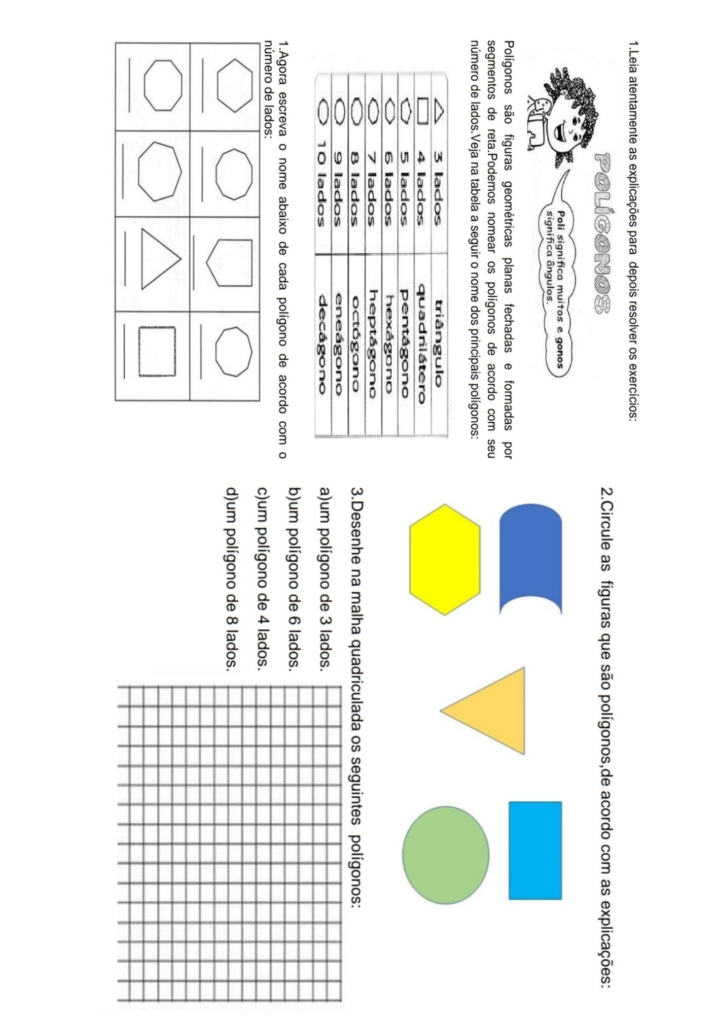 1.Leia atentamente as explicações para depois resolver os exercícios: 2. Circule as figuras que são polígonos,de acordo com as explicações: Poli significa muitos e gonos significa ângulos. Polígonos são figuras geométricas planas fechadas e formadas por segmentos de nomear os polígonos de acordo com seu número de lados.Veja na tabela a seguir o nome dos principais polígonos: 3 lados triângulo 4 lados lados lados hexágono lados heptágono lados octógono 3.Desenhe na malha quadriculada os seguintes polígonos: lados lados decágono a)um polígono de 3 lados. b)um polígono de 6 lados. 1.Agora escreva o nome abaixo de cada polígono de acordo com o número de lados: c)um polígono de 4 lados. d)um polígono de 8 lados.